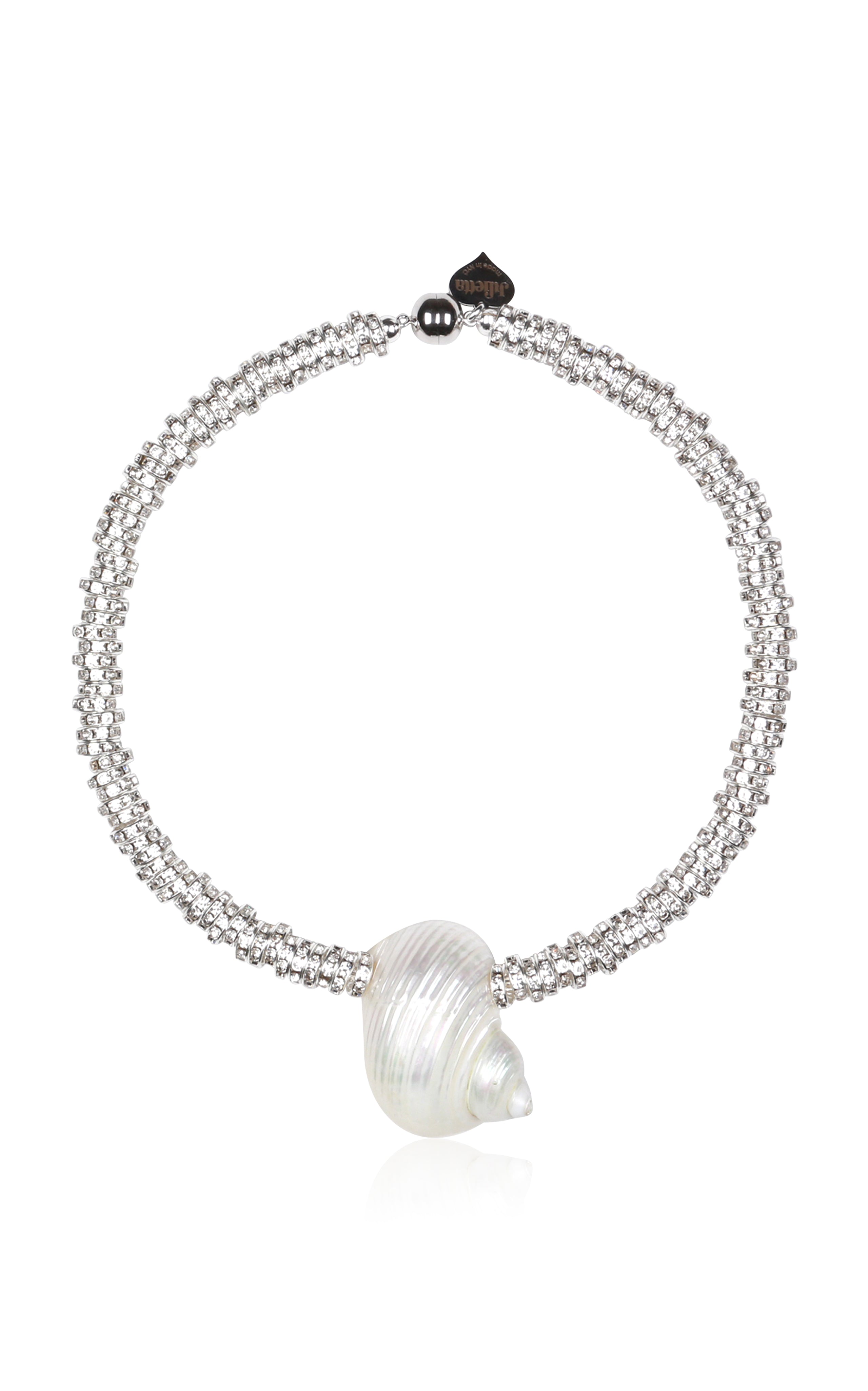 Capture the beauty of the Aegean Sea with Julietta's Spetses Necklace. This elegant piece features a shimmering silver chain adorned with crystals, highlighting a stunning seashell pendant that creates a bold statement, while the magnetic closure ensures easy wear. Add a touch of coastal elegance to your look with this unique and luxurious accessory. Handmade in Brooklyn, New York.