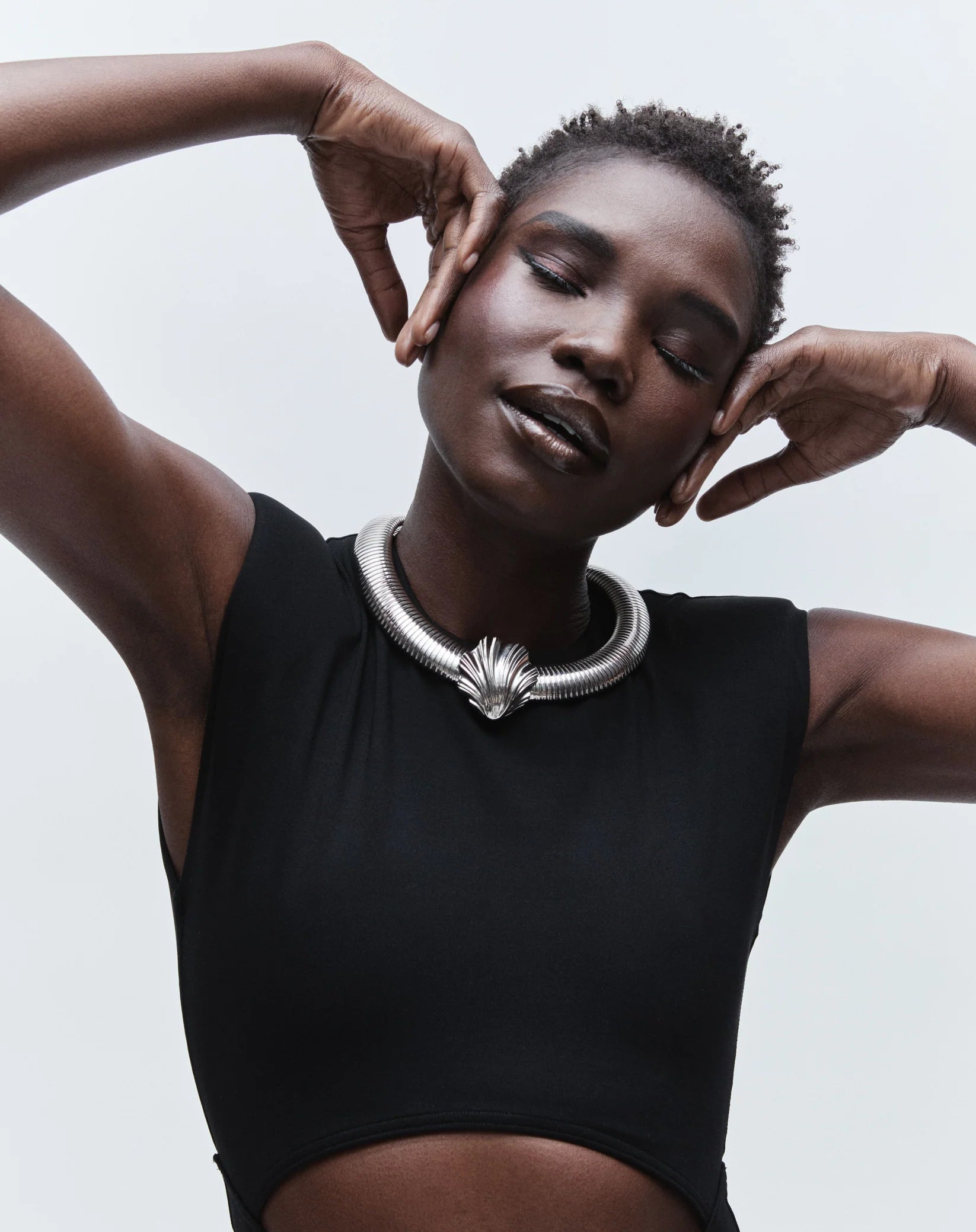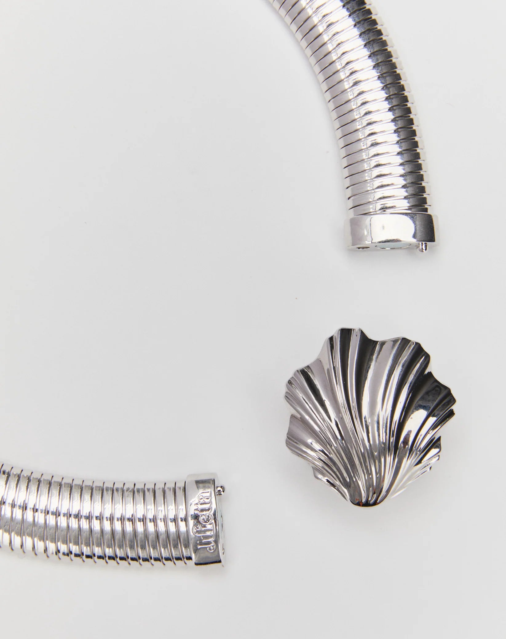 A timeless piece that blends sleek elegance with modern versatility. Crafted with a flexible Tubogas chain, this choker features a removable shell pendant for multiple styling options. It has a magnetic clasp closure and it's length is 17 inches.