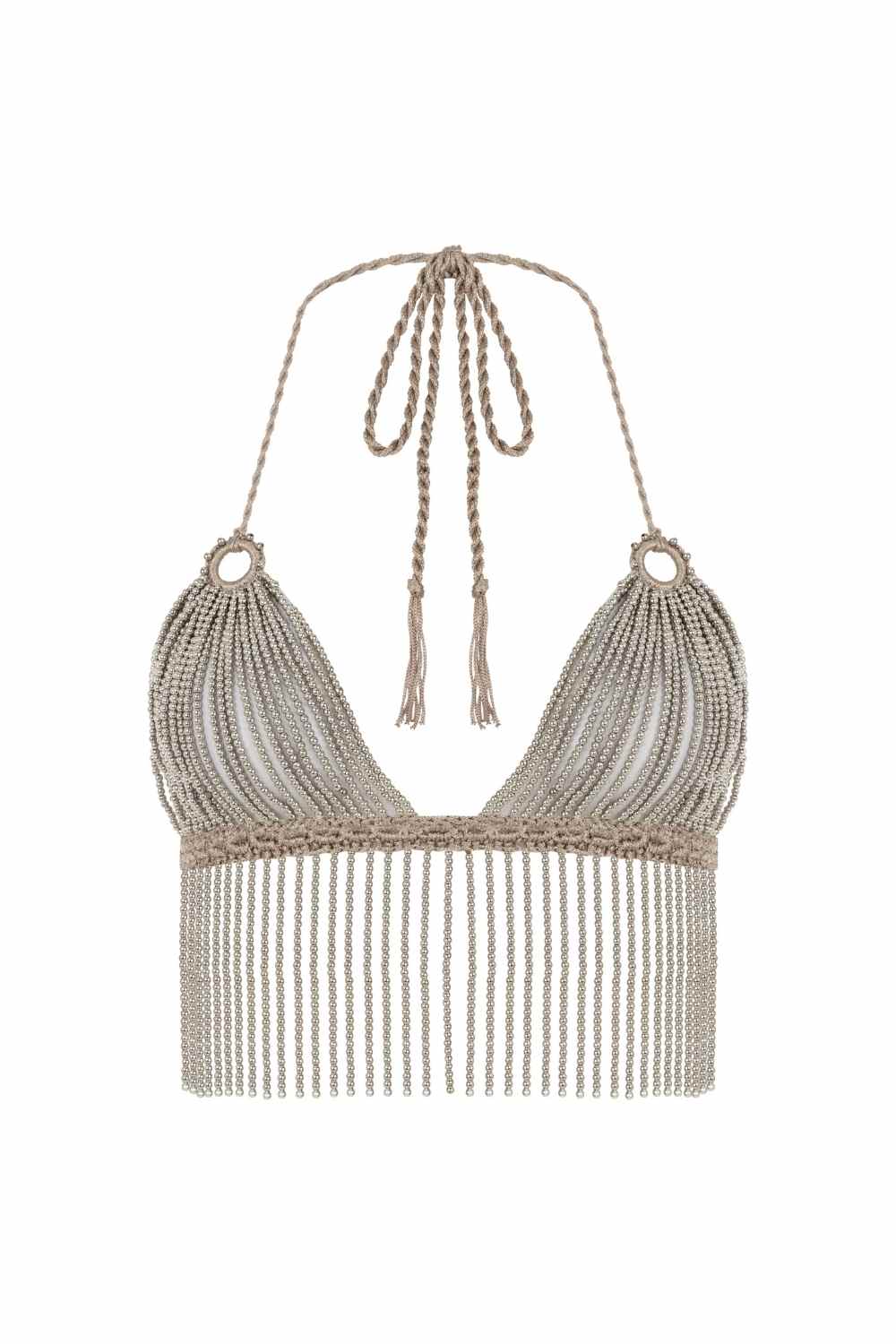 This hand-crochet beaded tie halter top is in the subtle elegance of bronze and oat milk colors. This unique top is a celebration of meticulous craftsmanship, combining the intricate art of hand crochet with full pendant beading in a mesmerizing array of multi colors. The full pendant beading enhances the allure, adding a dynamic and vibrant visual element that catches the light with every movement.