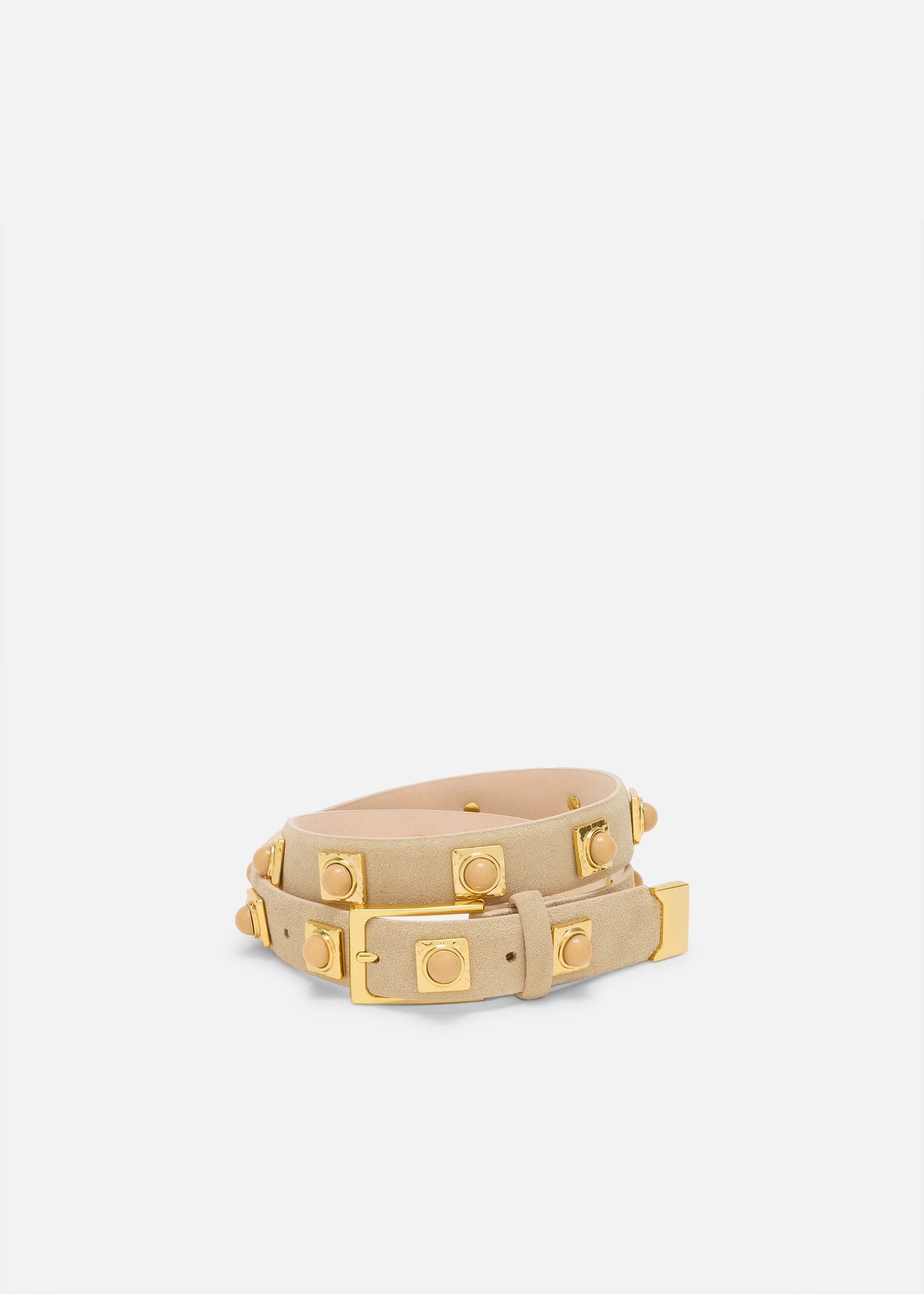 Soft suede Italian leather, made memorable by jewelry-like hardware—peach tone studs and a structured rectangular shape buckle in 24k gold tone. Limited edition.
