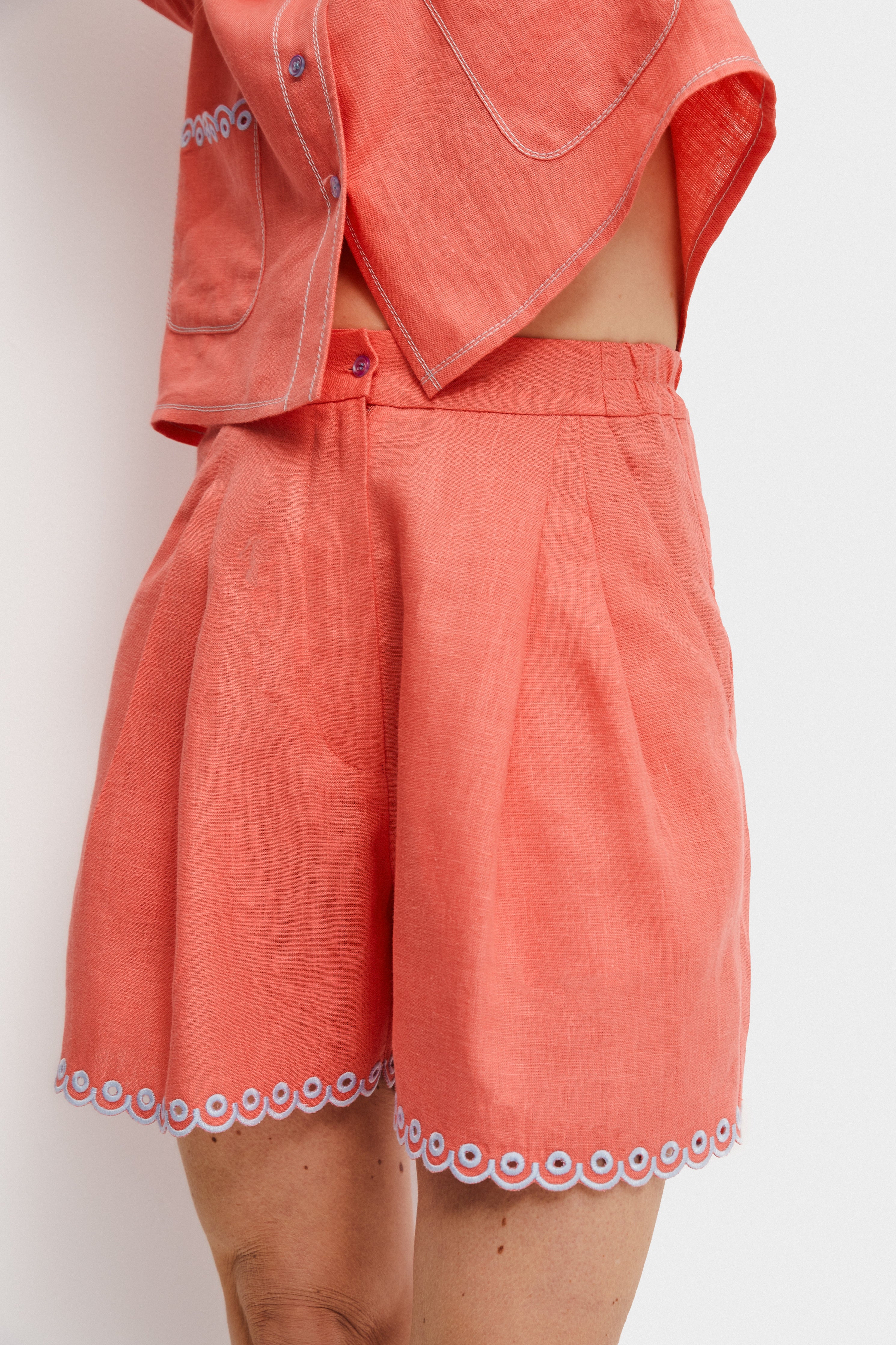 Linen shorts with a relaxed fit and scalloped contrast embroidery at the thigh-length hem. The high elasticated waist features a button closure and front pleats that add volume, while the side seams have subtle pockets. Can be worn casually or paired with the matching Petra Embroidered Linen Shirt for a complete summer look.