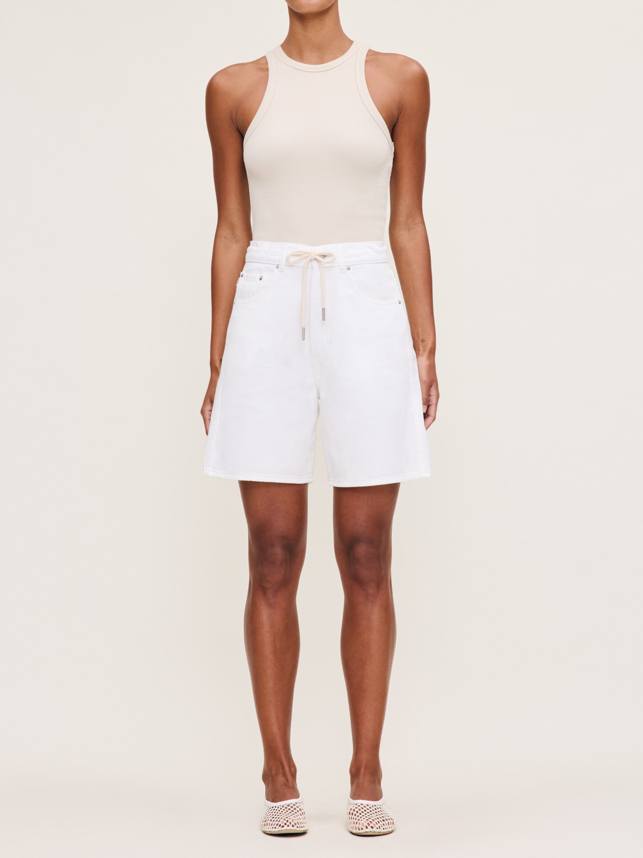 The Taylor Drawstring Denim Short is a high rise fit with a drawstring at the waist, a relaxed leg and 7" inseam for an everyday, laid-back look. It features a drawcord, a silver shank, copper rivets, multi-colored stitching and a clean hem.