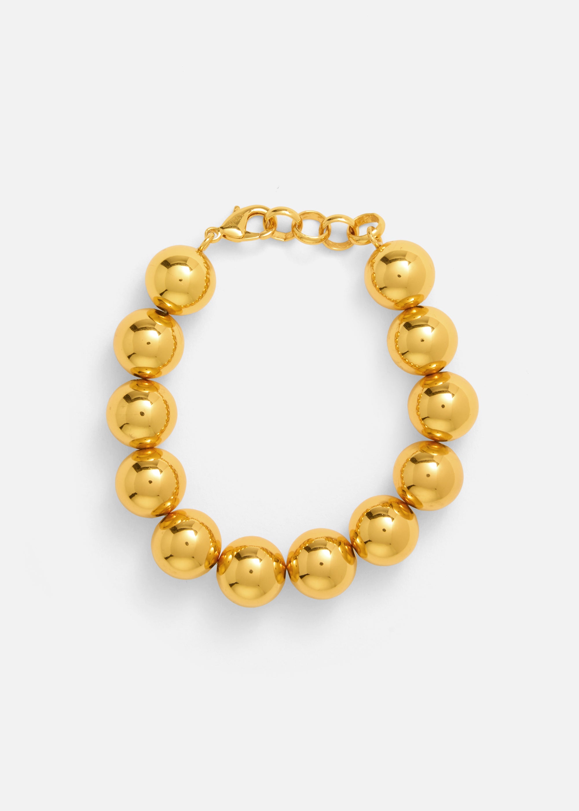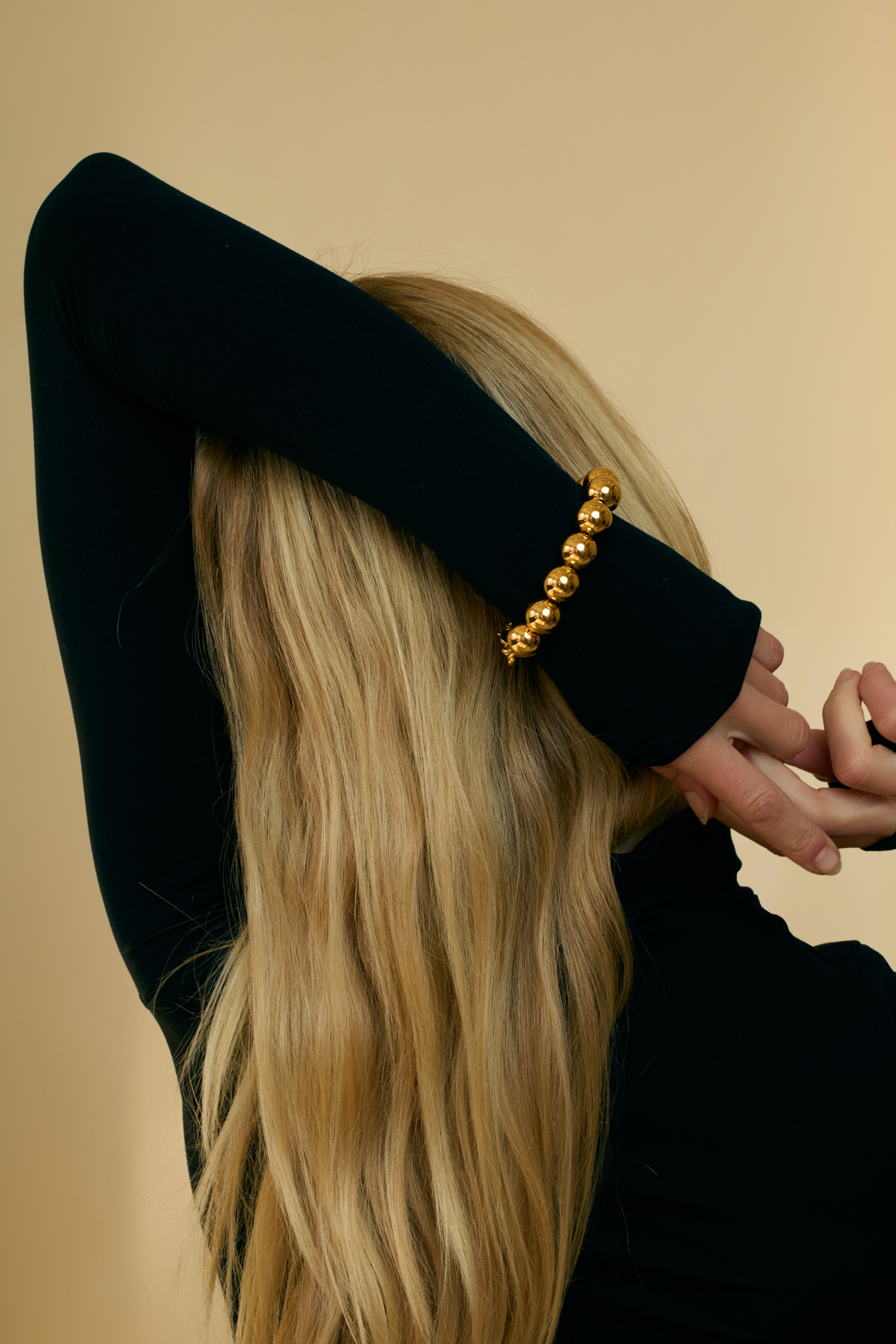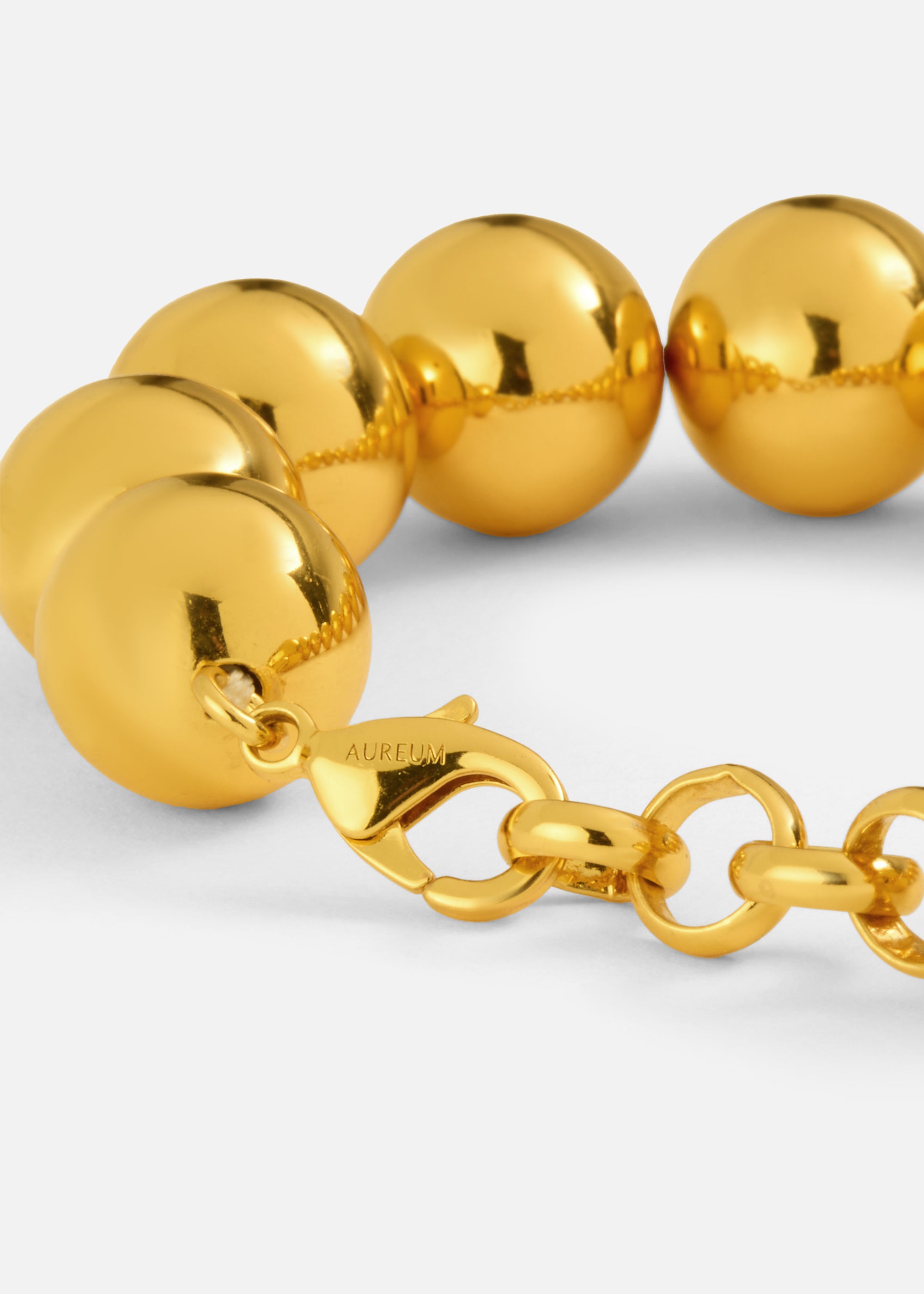 This statement bracelet from Aureum Collective features polished gold beaded detailing. It is crafted from 24k gold-plated brass with Aureum e-coating for tarnish resistance. The beaded bracelet is made from recycled materials and features an extender detail and lobster clasp closure. It measures 7 inches in length with a 1 inch extender. To maintain brightness, regularly wipe with a soft, dry cloth. Avoid submerging jewelry in water to prevent tarnishing and loss of shine. Store each piece separately in its original box to prevent scratching.