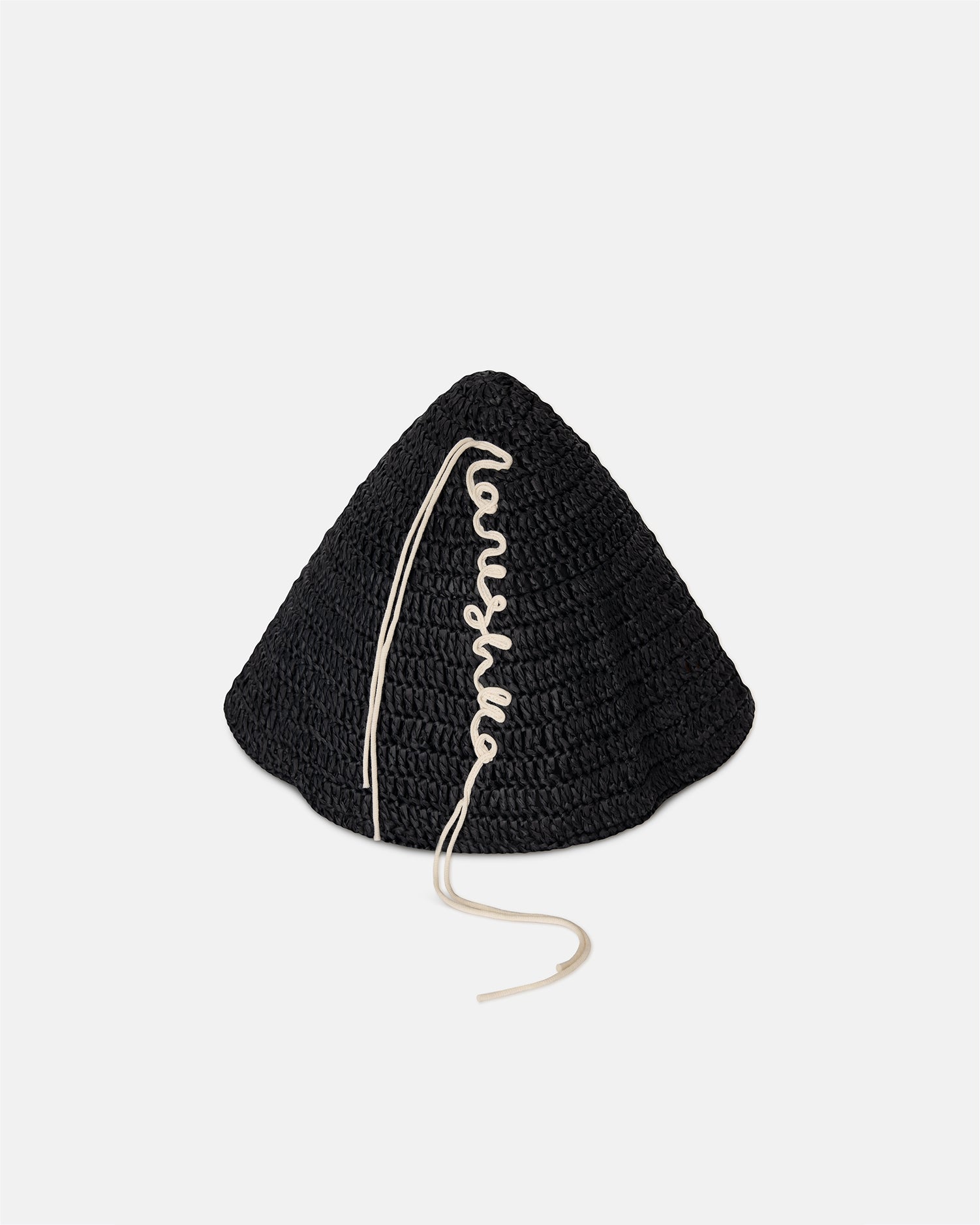 The Eula hat brings relaxed elegance to sunny days with its slouchy silhouette, woven from black and creme raffia. Its wide circular brim offers ample sun protection, while a contrasting logo with flowing ties adds a distinctive touch. Perfect for effortless summer styling.