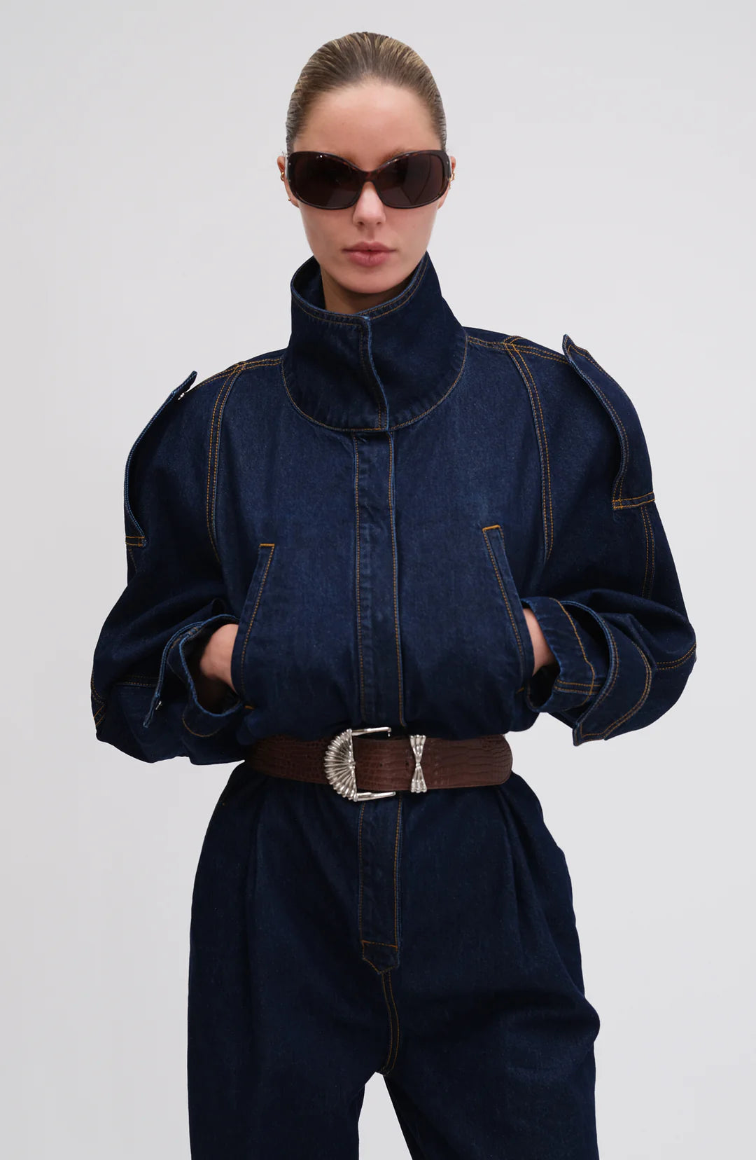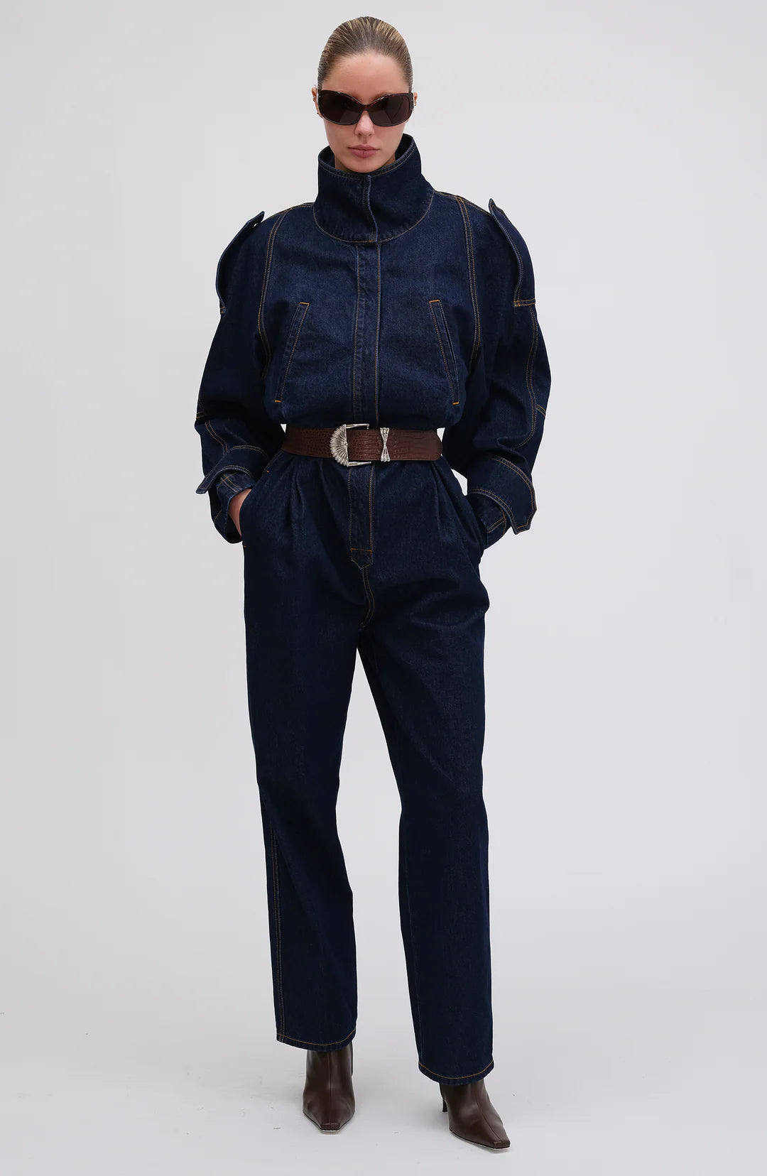 A chic one-piece silhouette cut from denim. It combines a utilitarian-inspired long-sleeved upper bodice that resembles a jacket with a nipped in waist. The bottoms have a straight leg cut with signature design details.