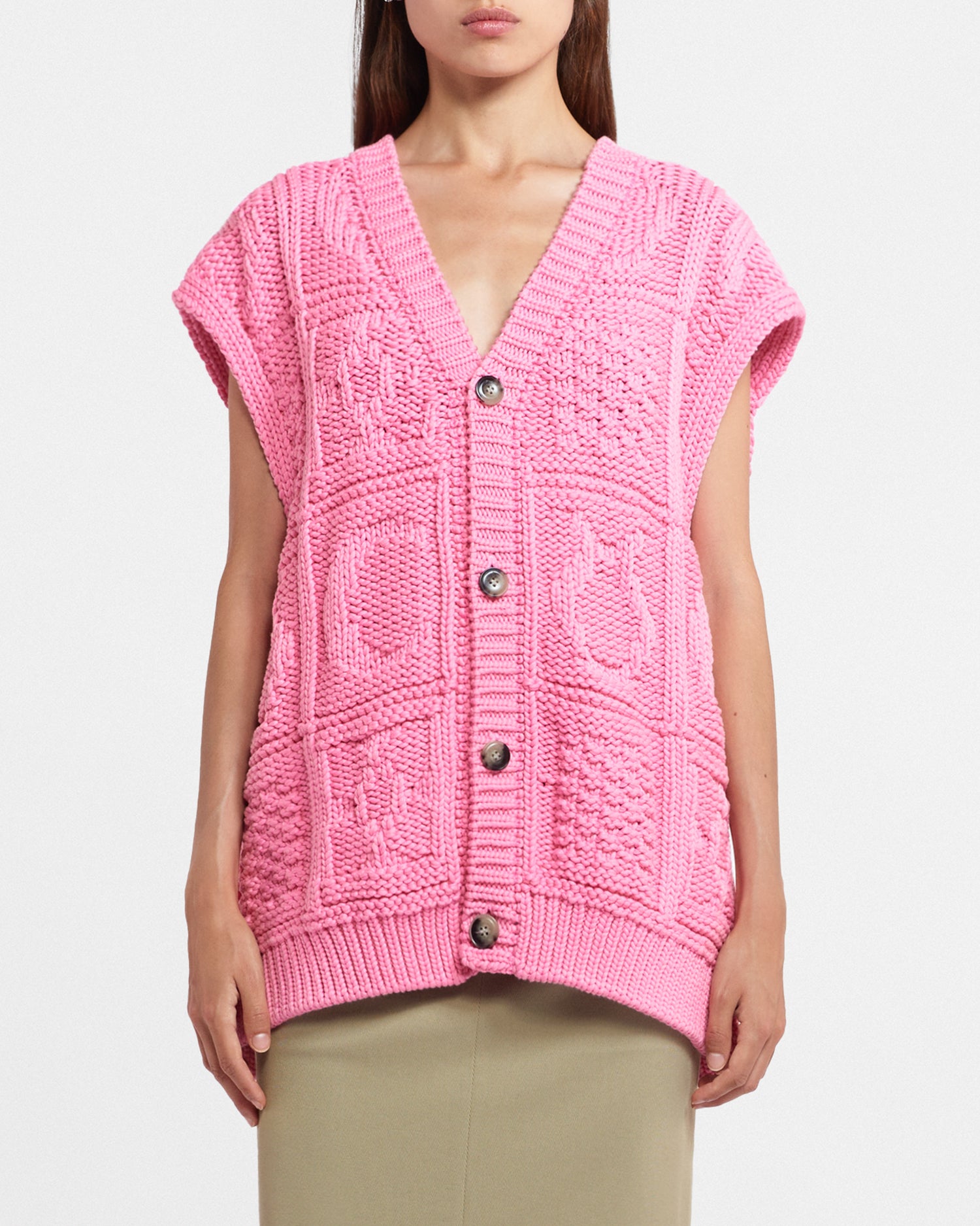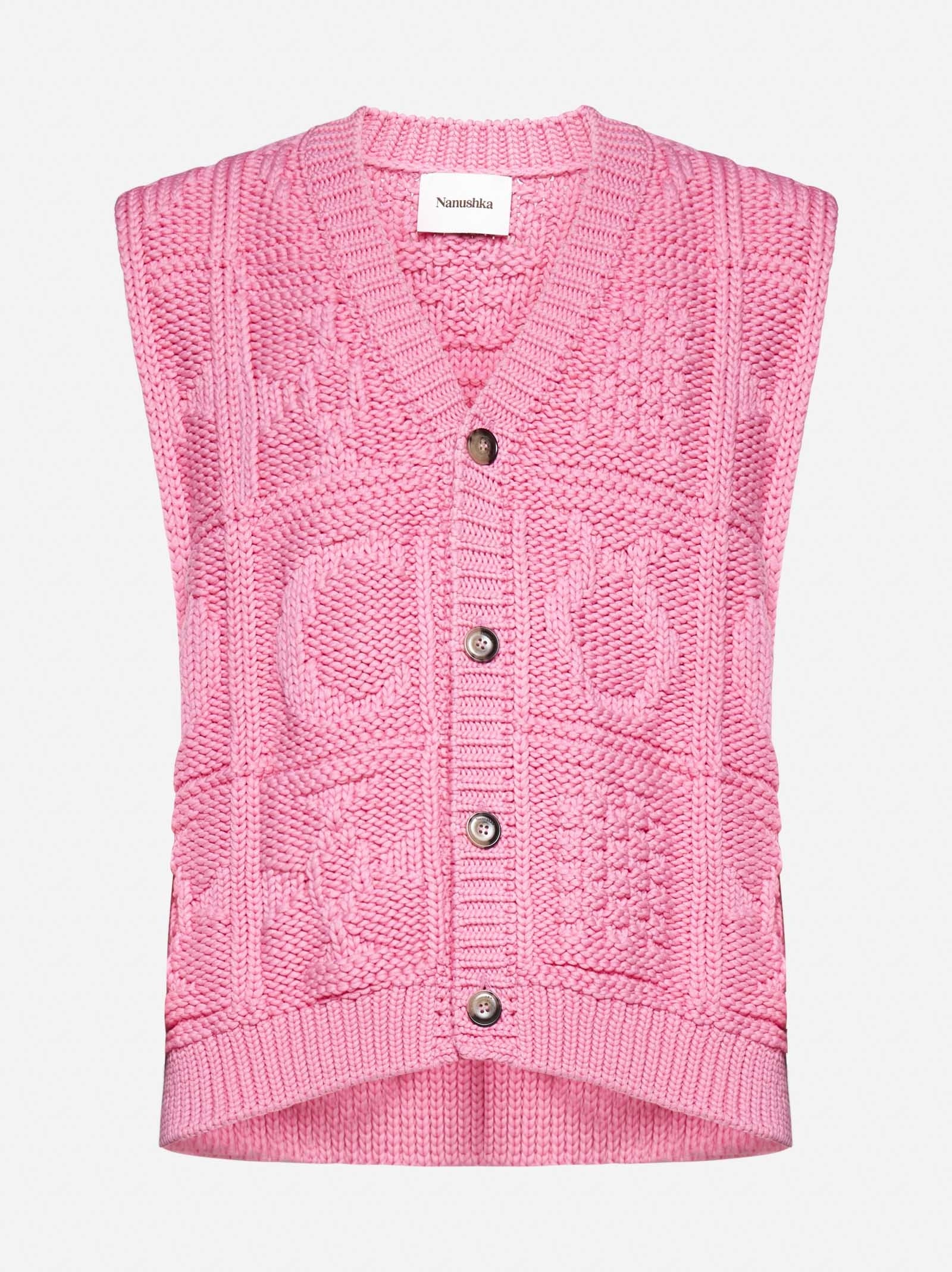 Nanushka’s Terence Vest is crafted from a pink jacquard cotton blend and features ornamental intarsia motifs, a V-neck, front button fastening, ribbed edges, and side vents. Designed to be unisex, this versatile piece effortlessly suits any wardrobe.