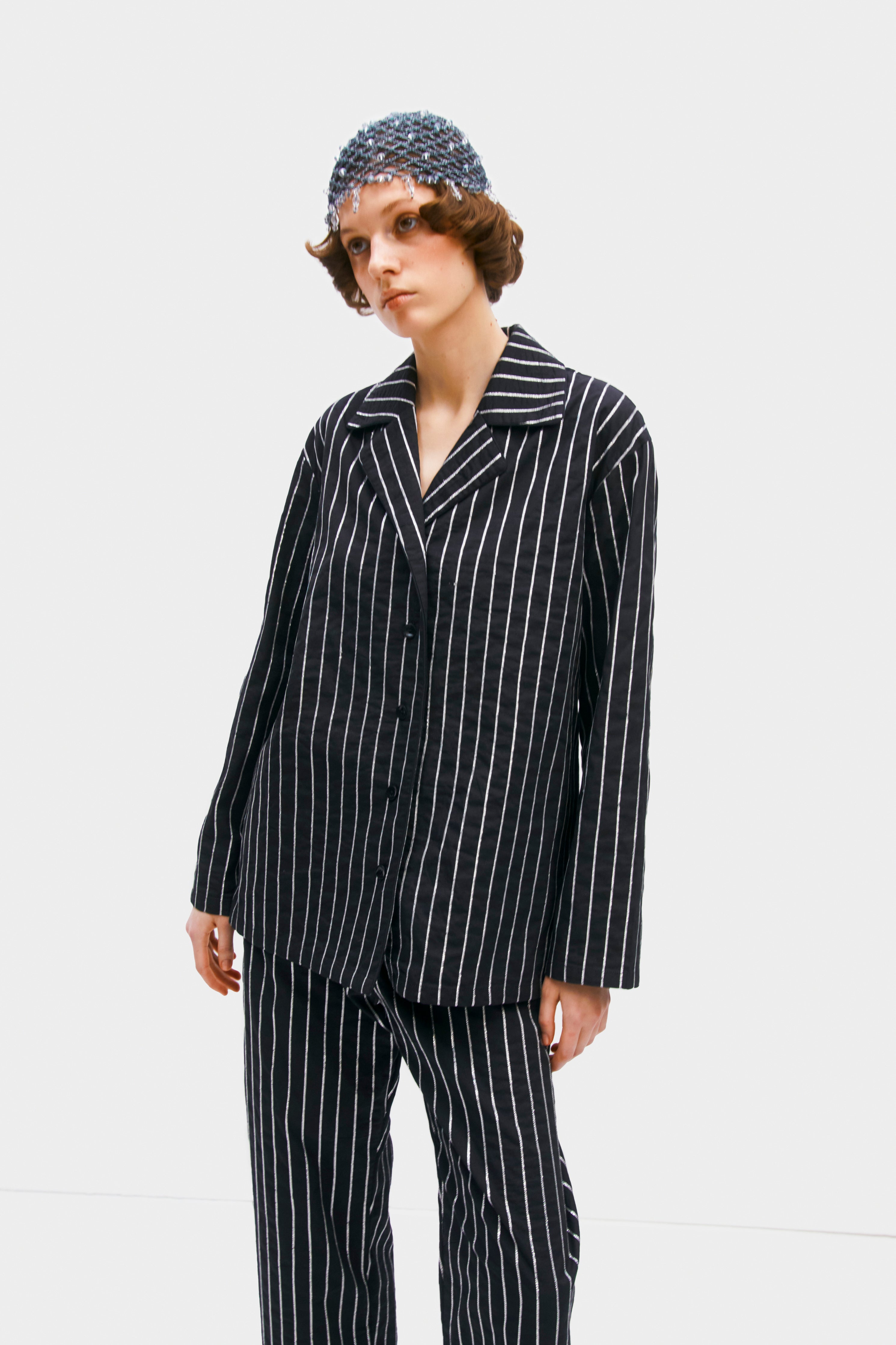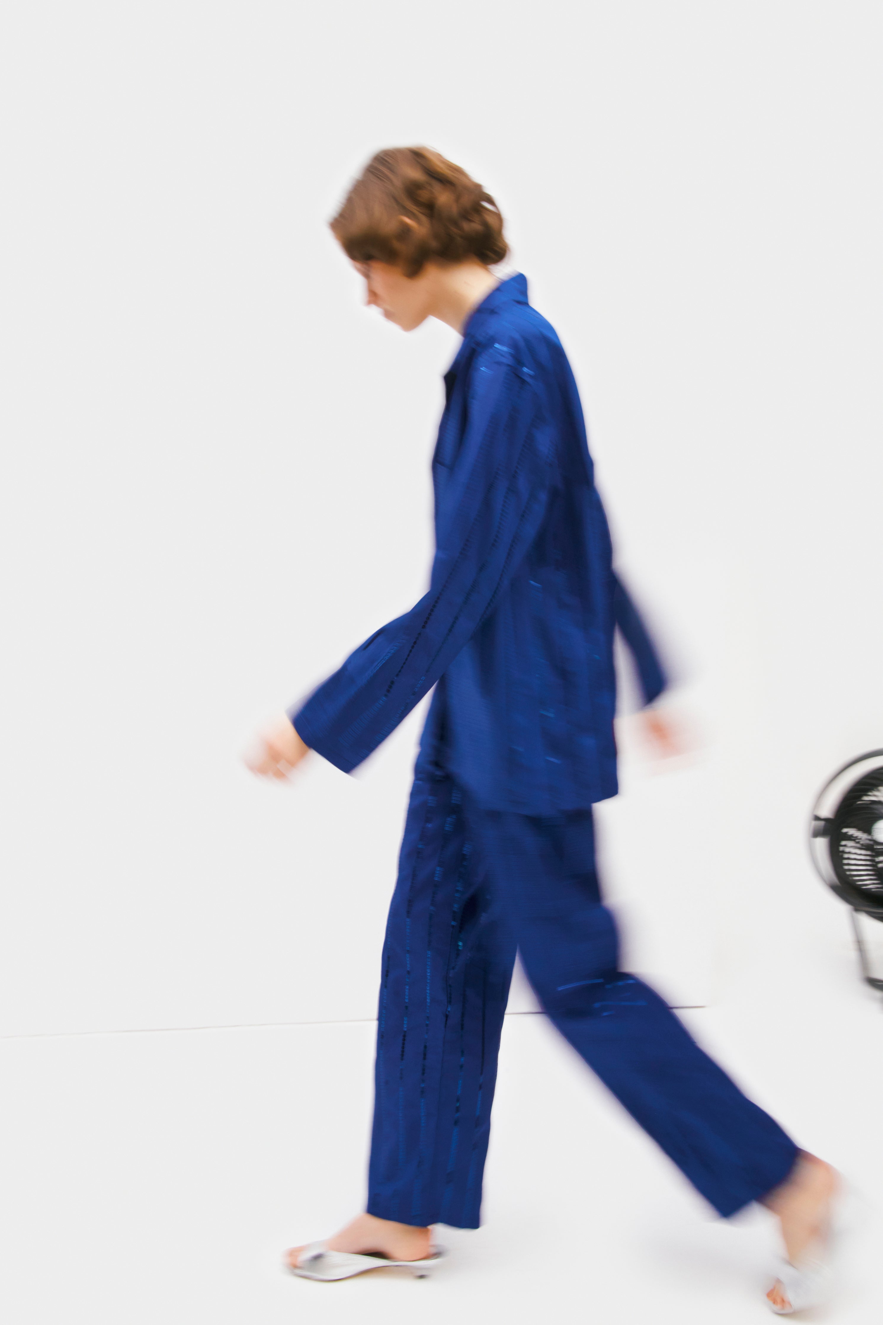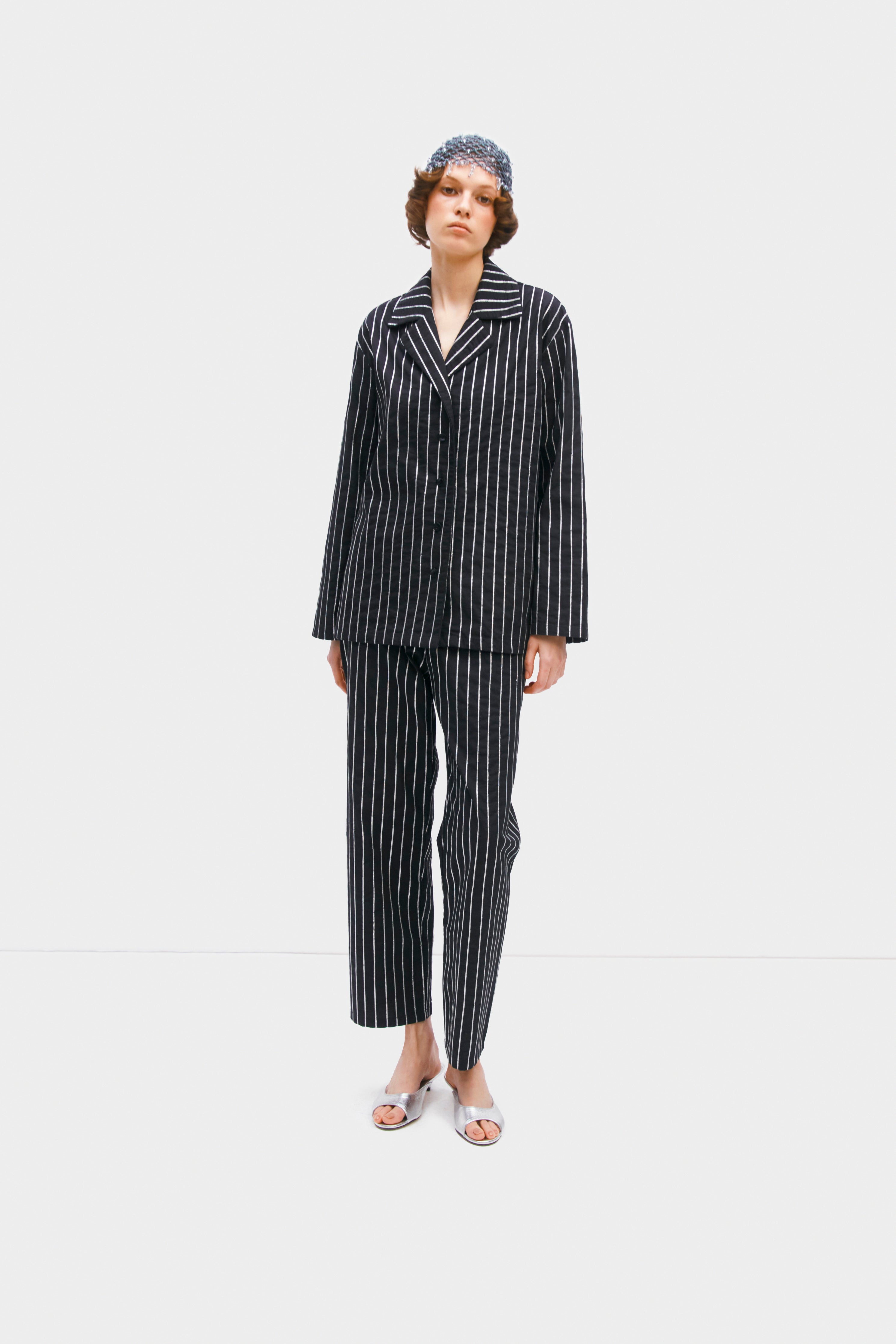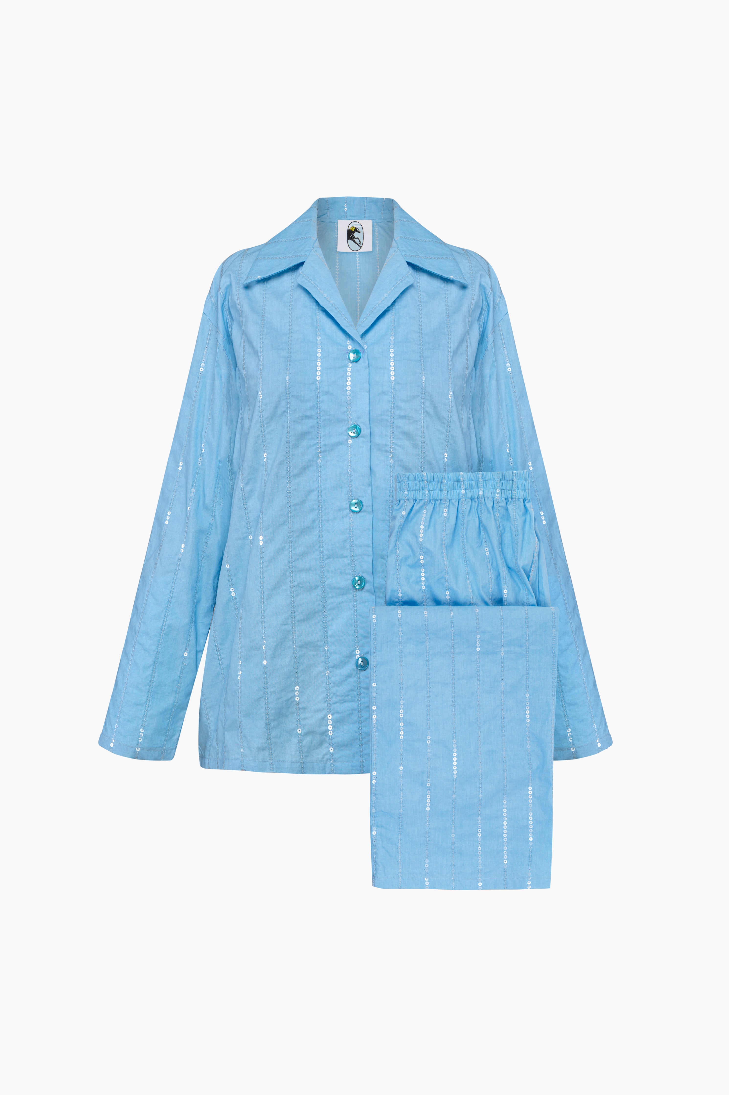 The Milky Way Sequined Cotton Pajama Set is a two-piece sleepwear set known for its unique design and comfortable feel. It features a button-down top and matching pants, both adorned with subtle sequin details. The fabric is a soft, organic cotton poplin, providing a crisp hand feel and comfortable wear. The set is designed to be versatile, suitable for hosting a party at home and cool occasion outings.