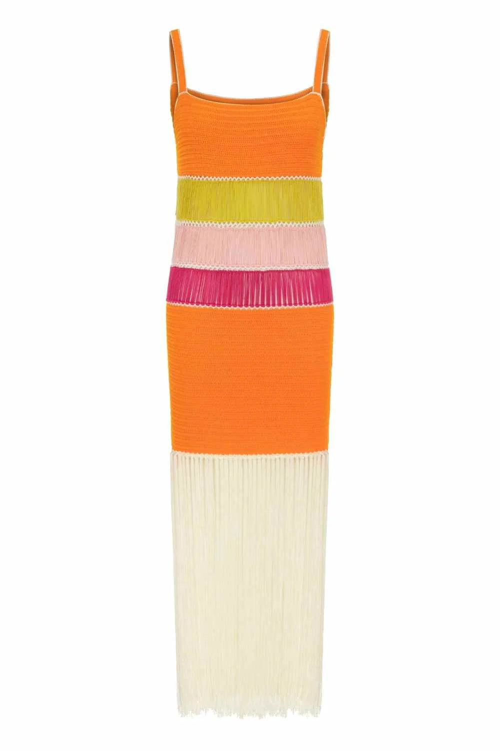 Embrace the warmth and vitality with this radiant orange hand-crochet fringed dress. The fringe accents on the dress add a playful touch that sets it apart from the ordinary. With every step you take, the fringe sways gracefully, creating a captivating visual effect that's sure to turn heads. Whether you're headed to a beachside party, a music festival, or a romantic dinner, this dress effortlessly adapts to various settings. Dress it up with heels and accessories or go for a more relaxed look with sandals.