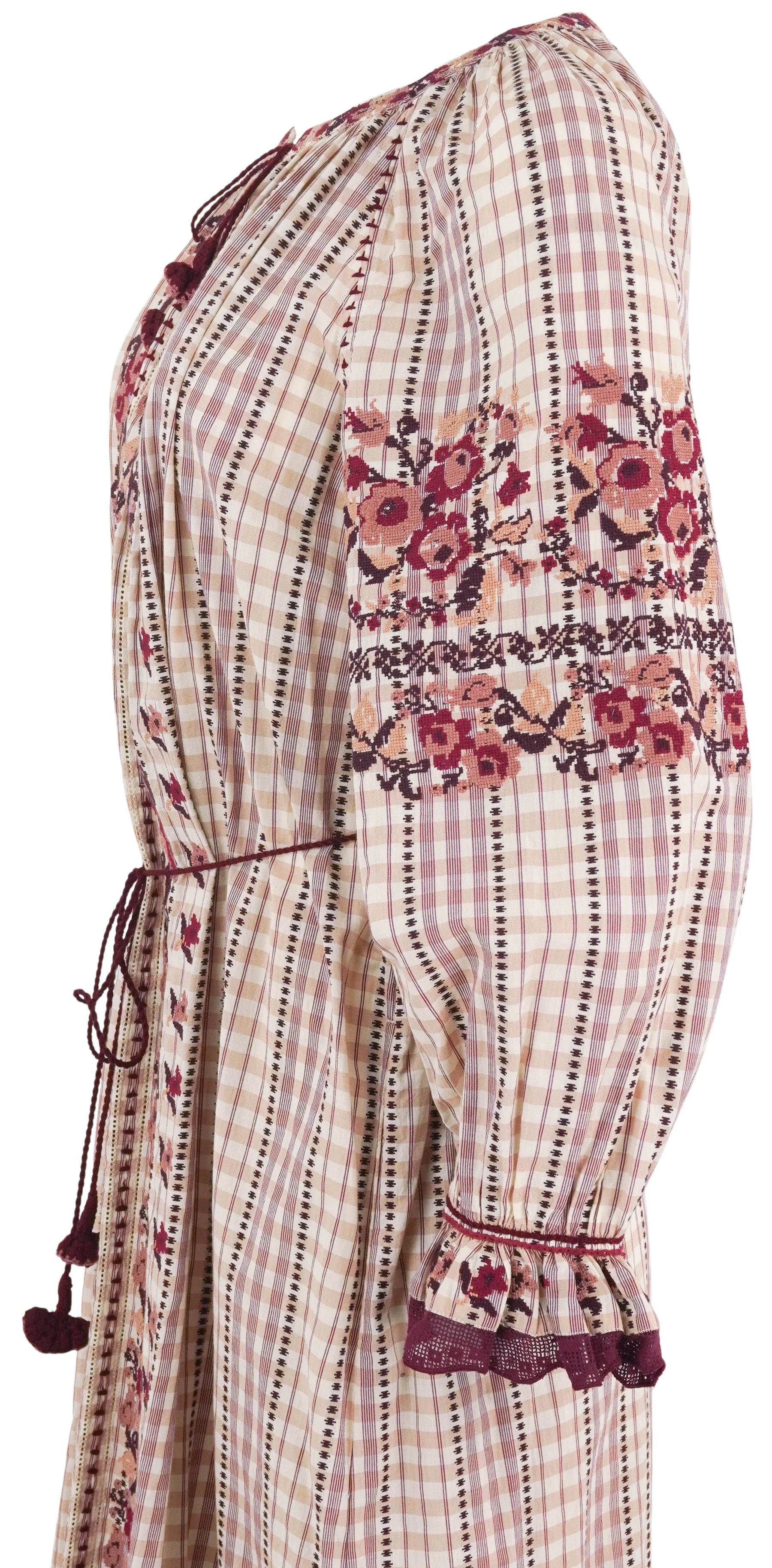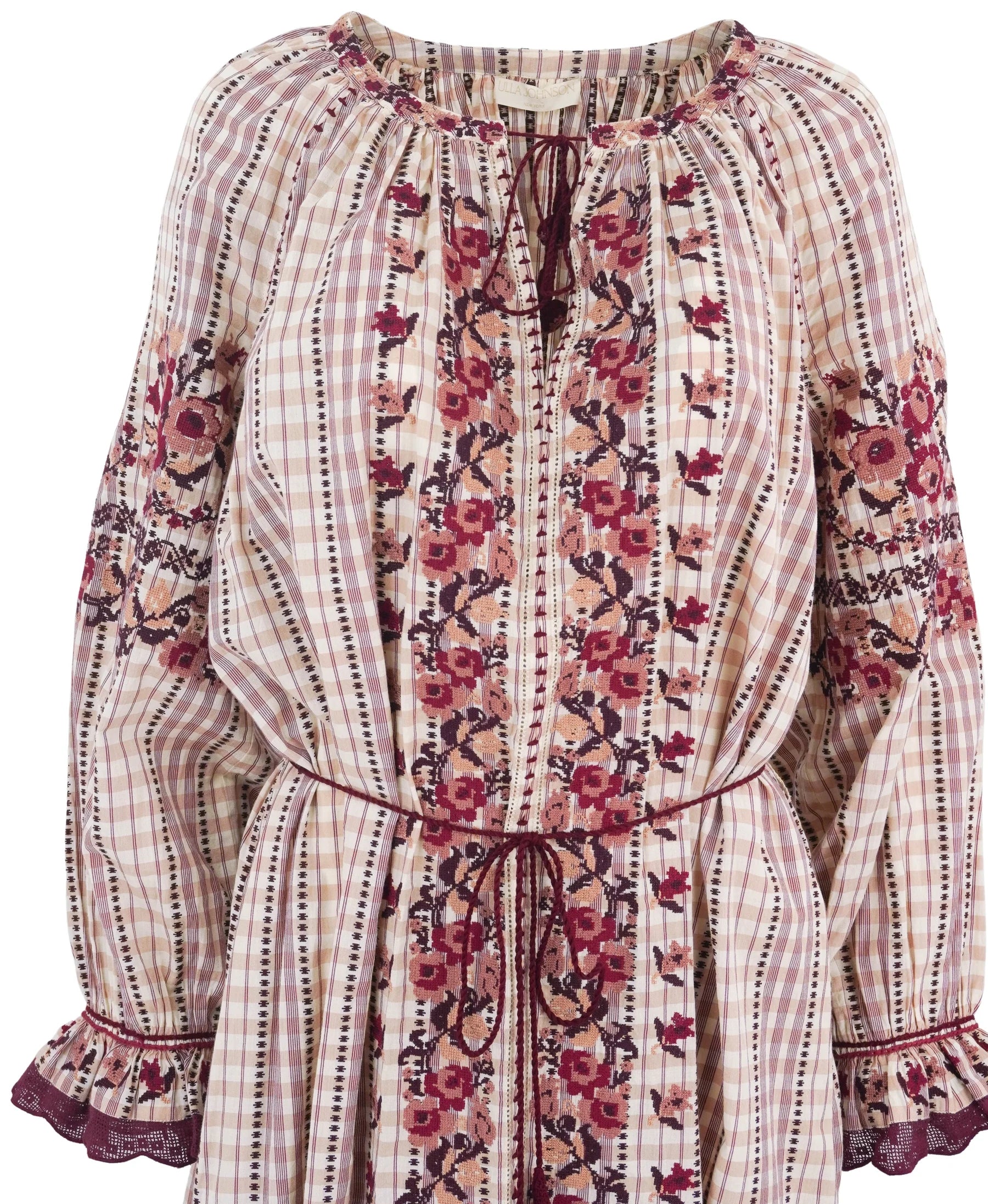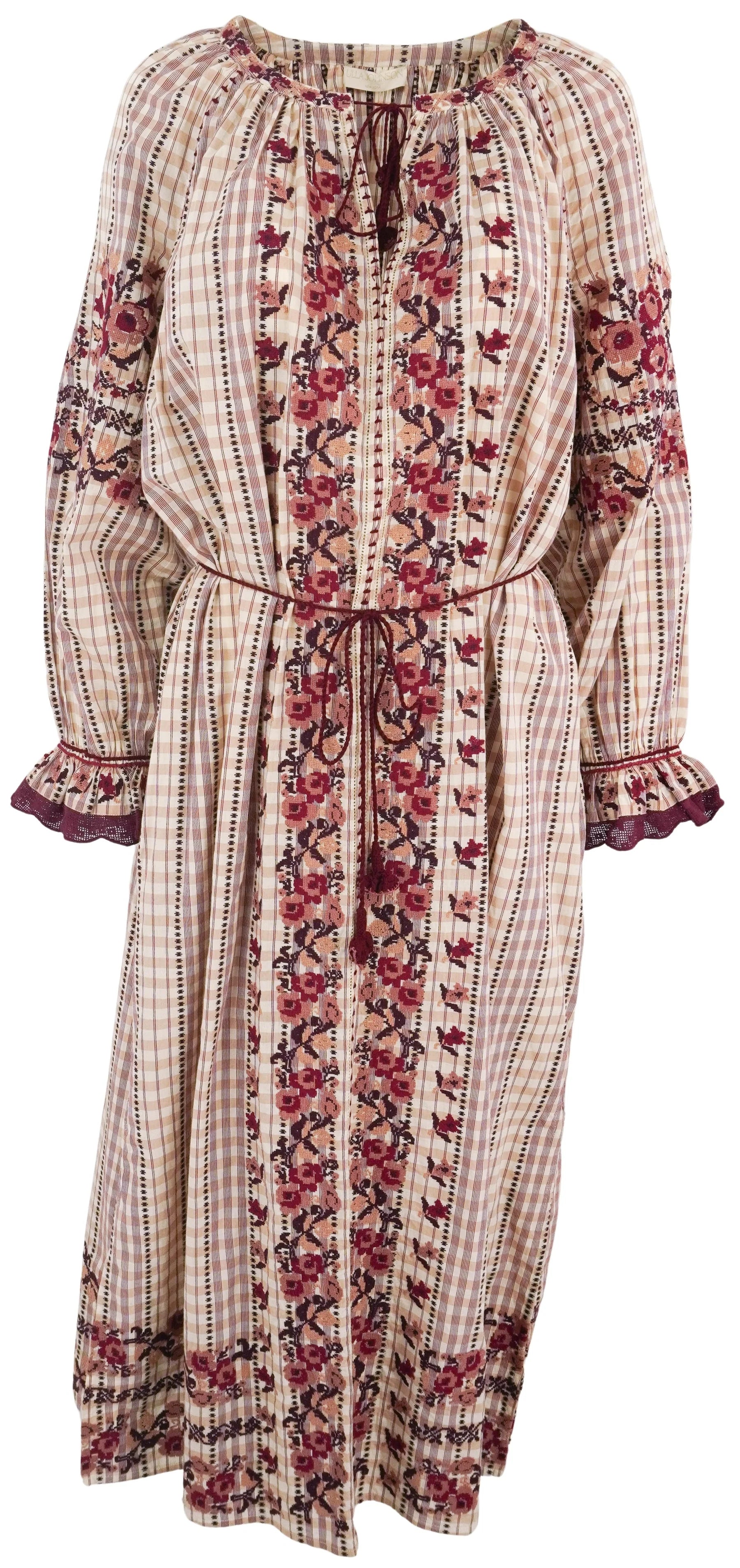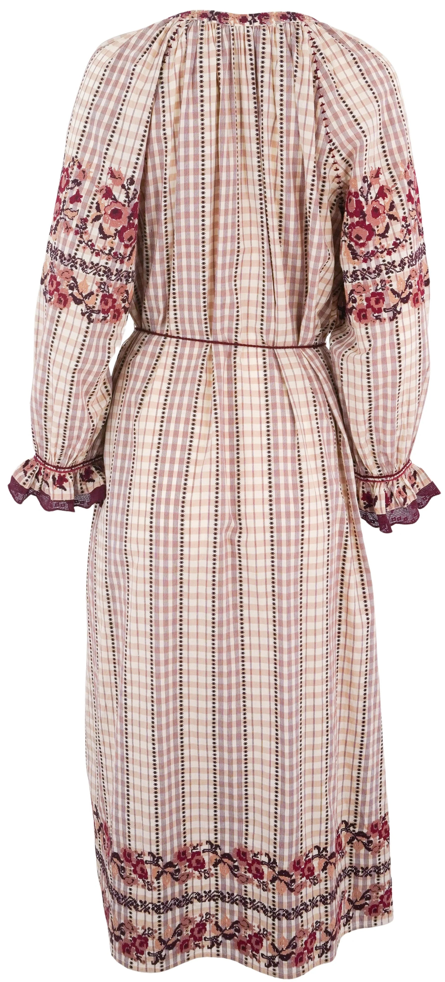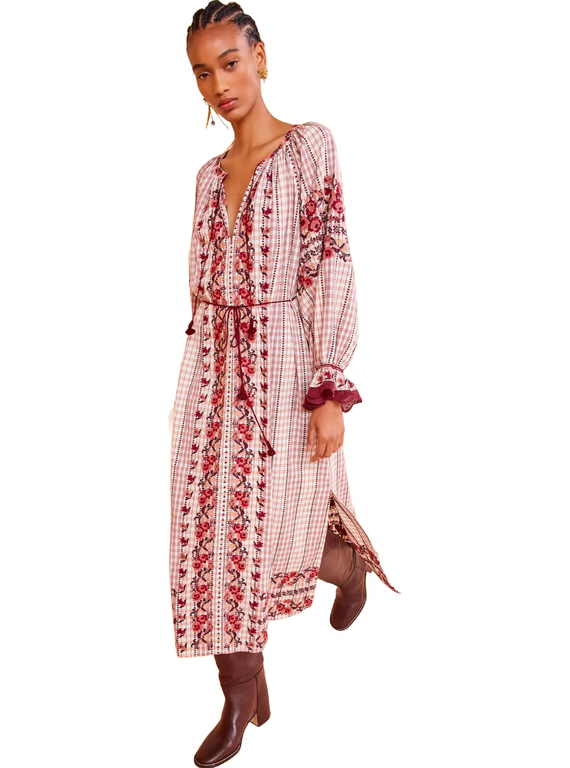 The Filia Dress by Ulla Johnson is a breezy, boho-chic statement crafted from lightweight cotton shirting. Featuring a vibrant Madras plaid print and delicate floral embroidery, this maxi-length silhouette flows effortlessly with side slits and relaxed long sleeves. Tasseled neckties and a removable belt let you customize the fit—cinch it at the waist or wear it loose for a free-spirited look. Side pockets add a practical touch to this romantic, all-season piece.
