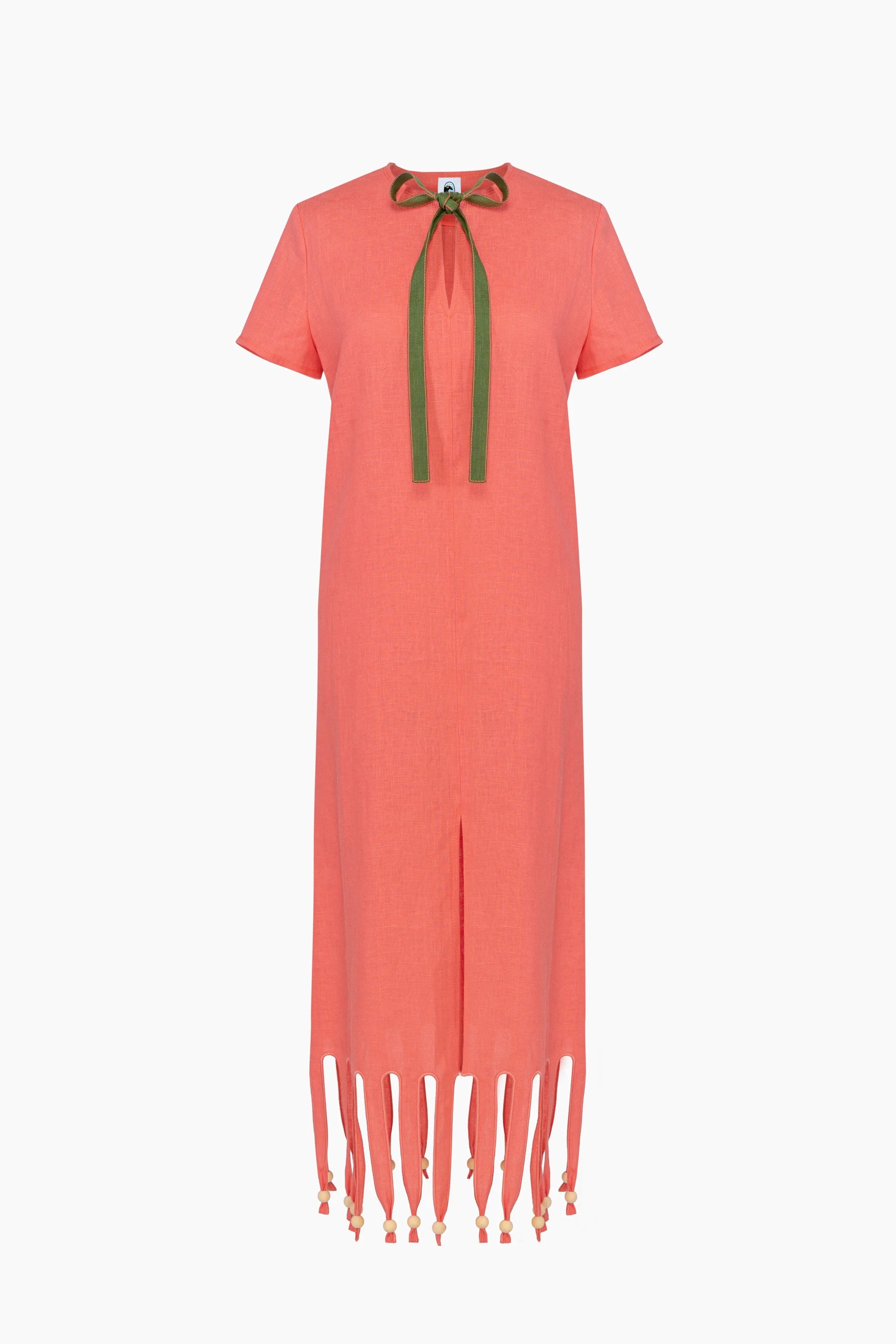 Relaxed tunic midi dress in airy linen with a fringed hem. Lightweight round wooden beads adorn the fringes, adding an artisanal touch and gentle rhythm as you move. The round collar features a front split that closes with a contrasting ribbon, while the short sleeves have a clean finish. Wear it for a casual summer look while dancing or daydreaming.