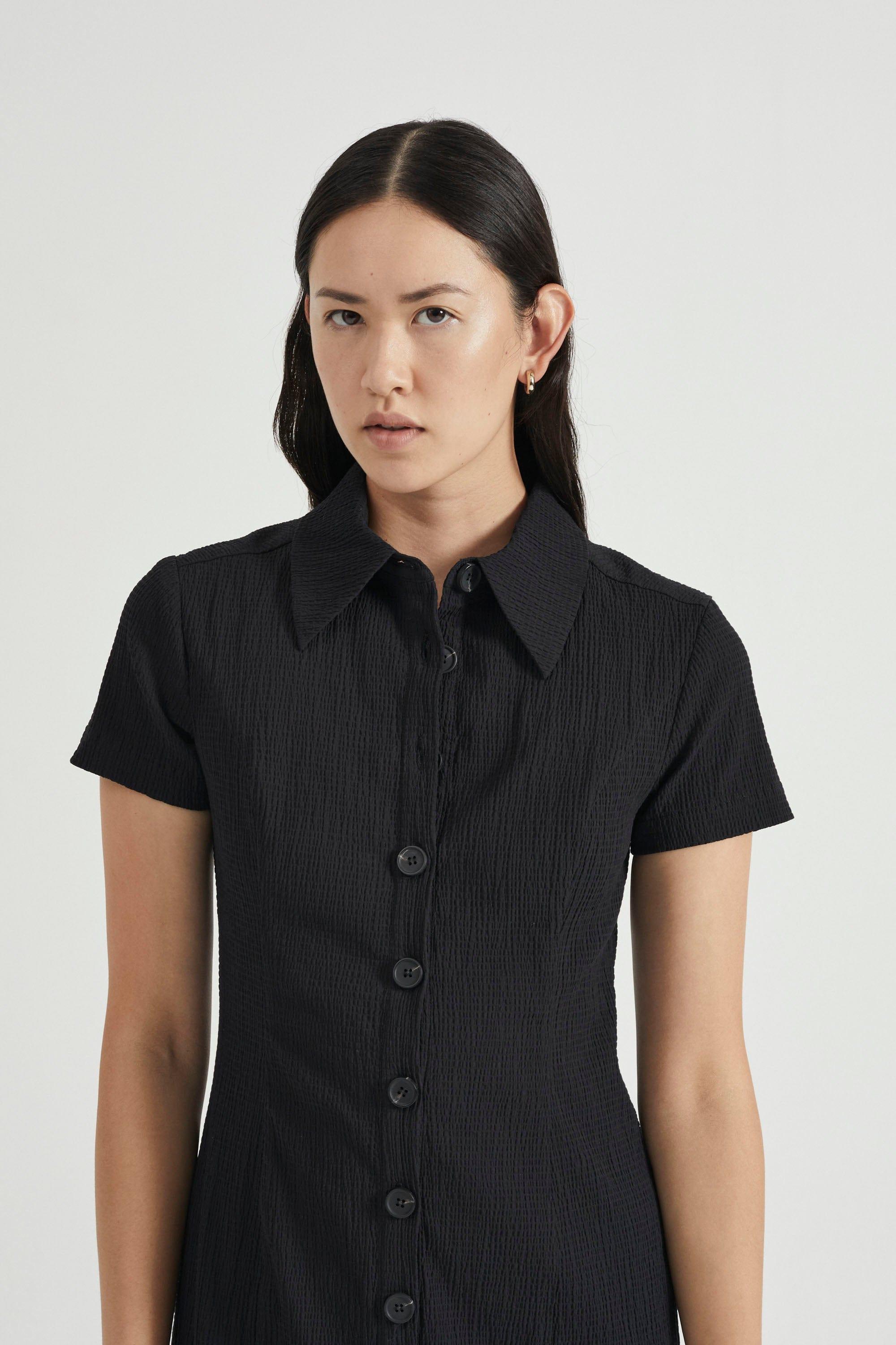 The Third Form Skipping Stone Shirt Dress is a classic, midi-length black shirt dress made from a comfortable cotton and spandex blend, featuring a button-up front with buttons and a collared neckline. Its textured fabric and timeless design make it a versatile piece suitable for both casual and formal occasions. It is designed to be a sophisticated, minimalist staple with a polished but comfortable feel.