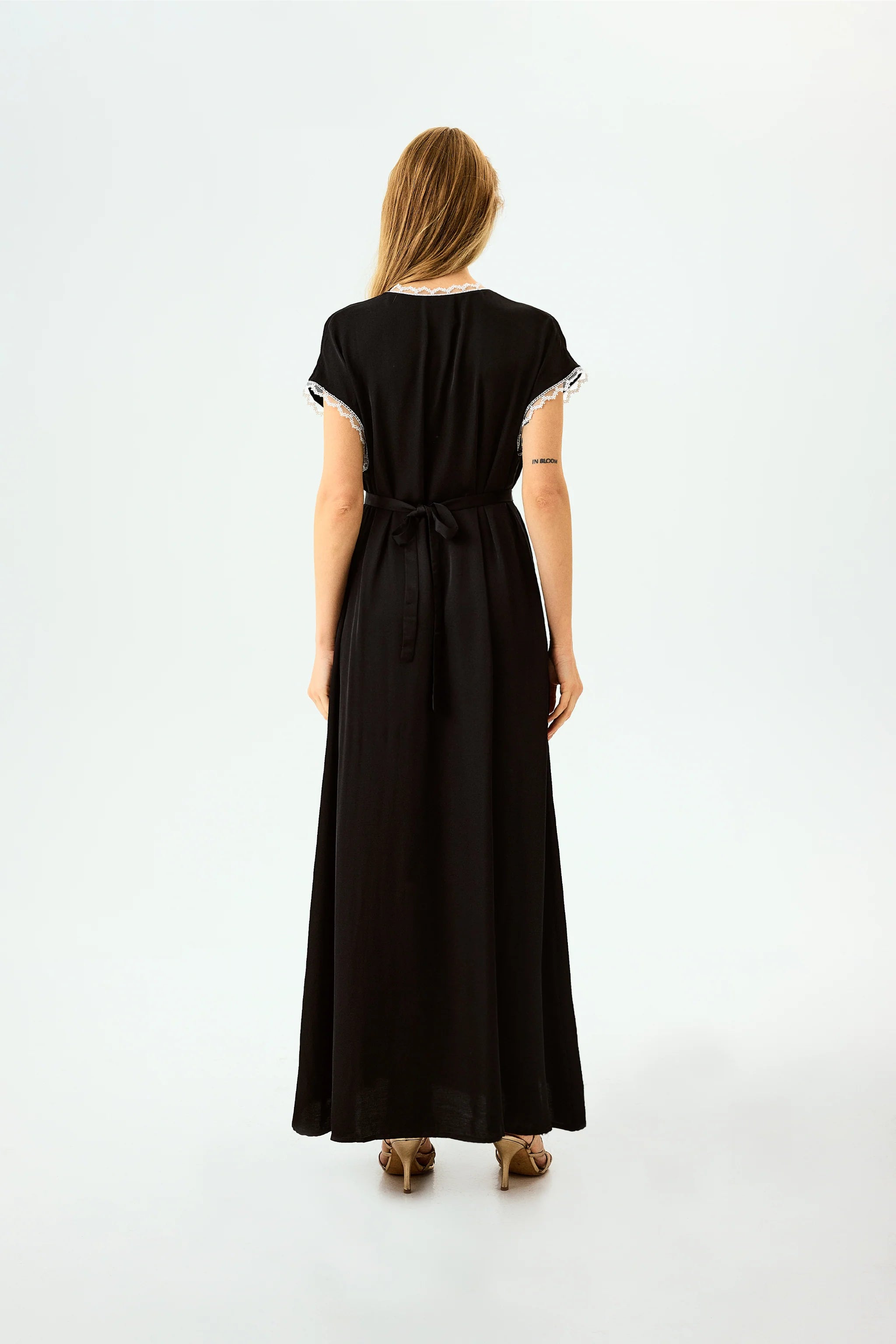 Relaxed maxi dress crafted from certified EcoVero™ rayon satin in black. The deep v-shaped neckline is adorned with a handcrafted rose and lace trim, which also features at the sleeve. A waist belt provides an adjustable fit, while subtle darts add shape to the flared silhouette. Inspired by 1930s sleepwear, this sensual piece adds a touch of romance to any hour of the day.