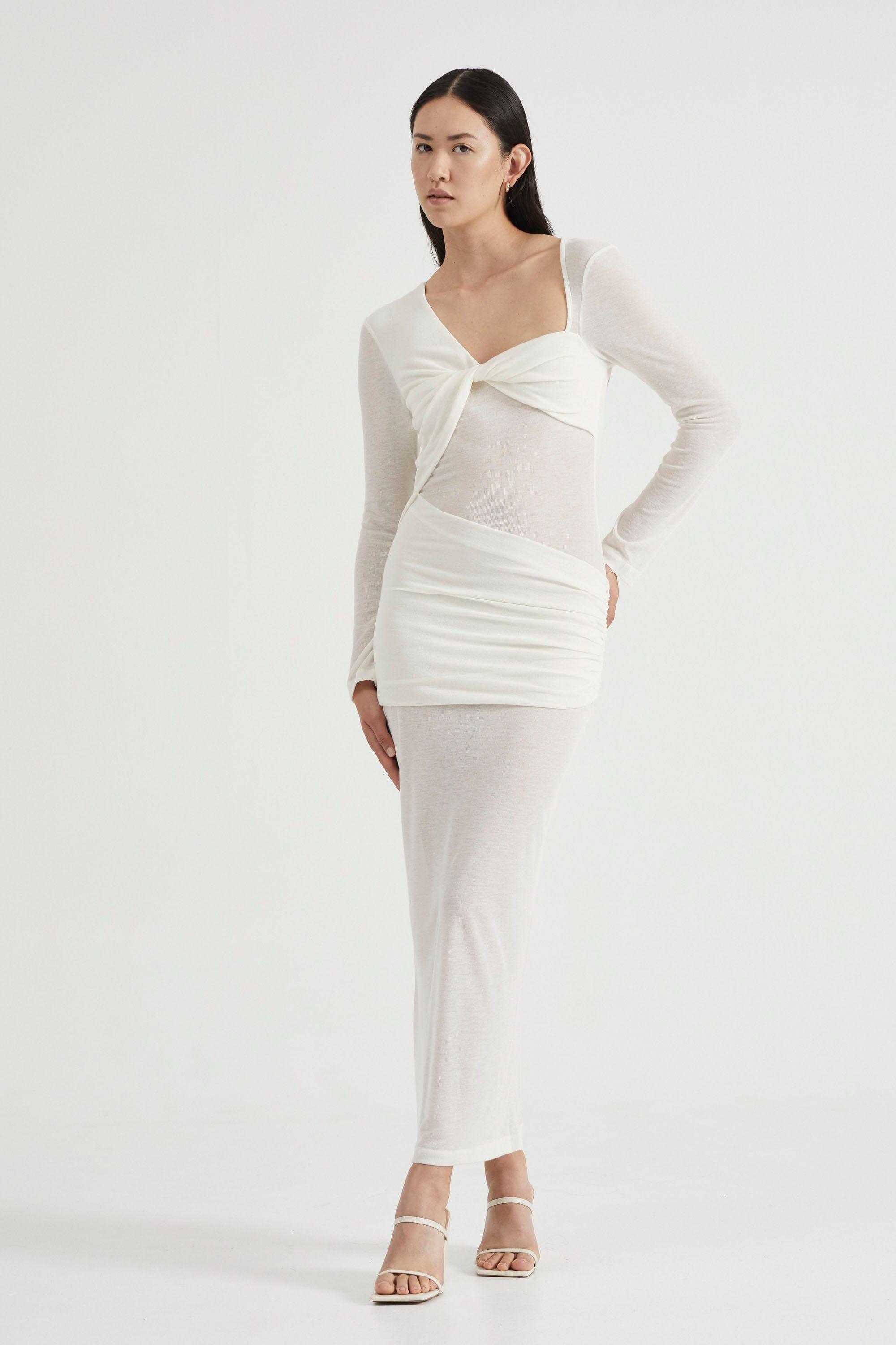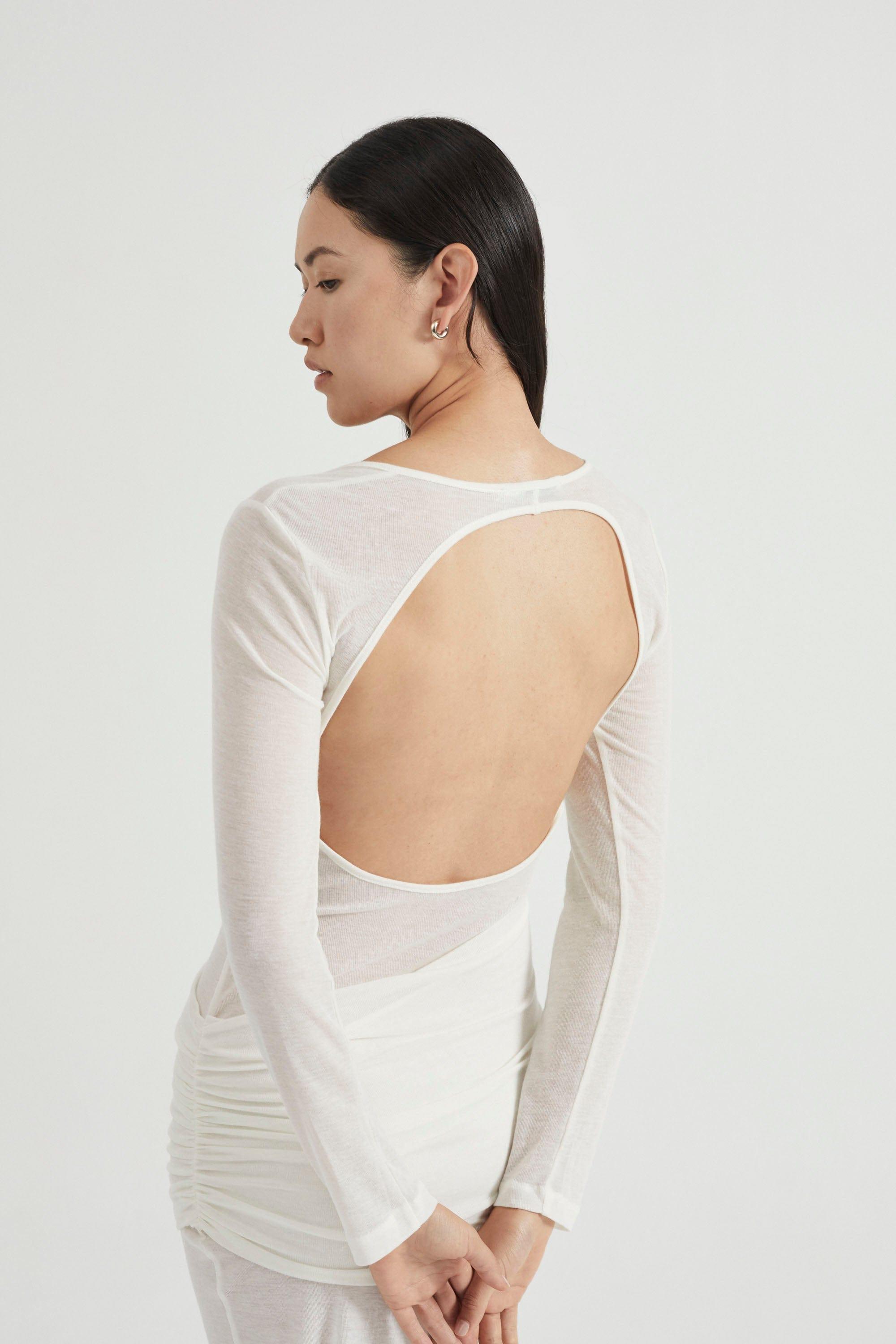 Beautifully designed to accentuate the wearer's curves, the Wind Through Back Out Maxi showcases unique layering through the bust and waistline. This exquisite piece is meticulously crafted from high-quality, lightweight rayon, ensuring both comfort and a flattering fit. The piece is made of a semi-sheer knit jersey with stretchy fabric. With its elegant long sleeves and alluring back-out design, this maxi dress boasts a versatile silhouette suitable for both daytime and evening events.