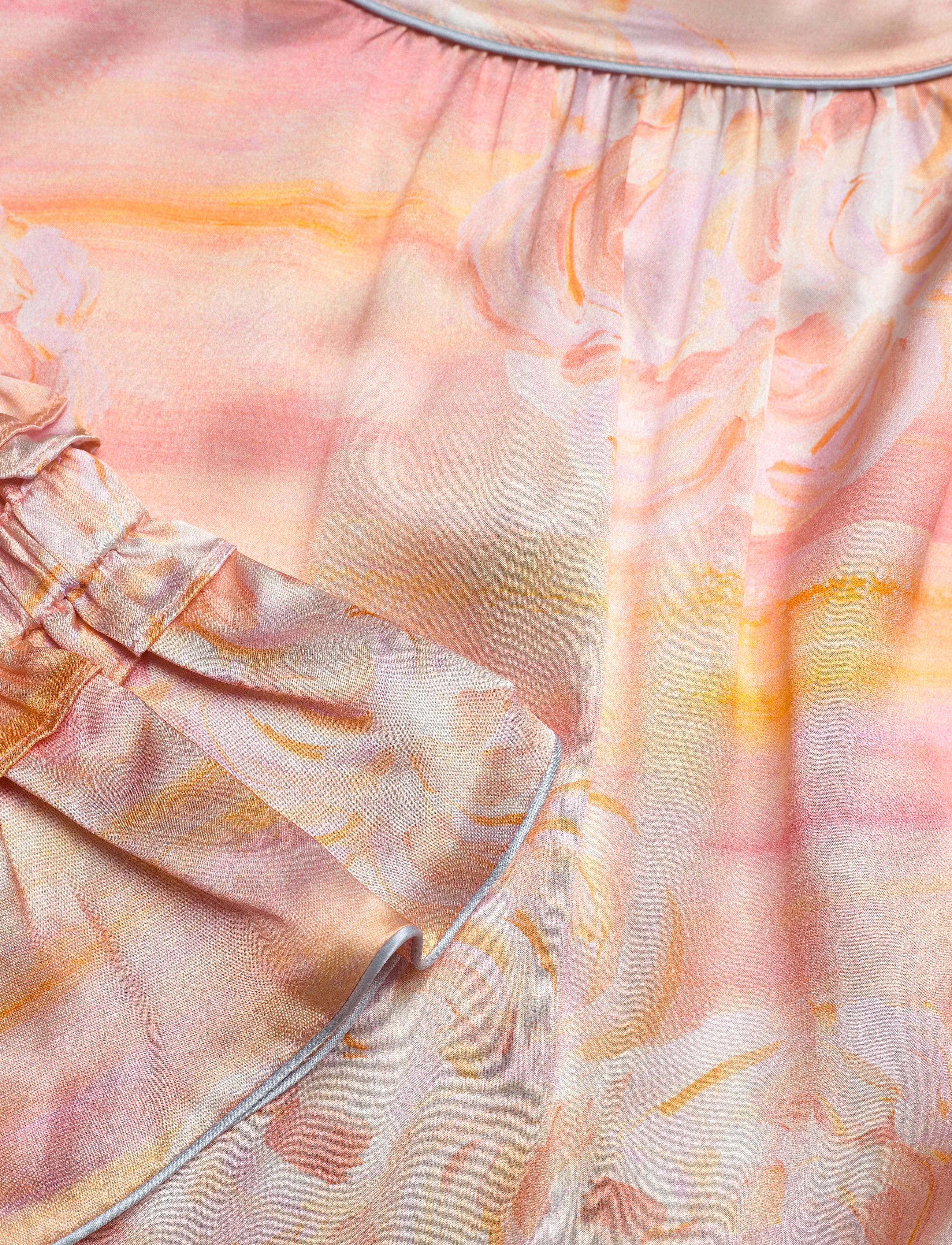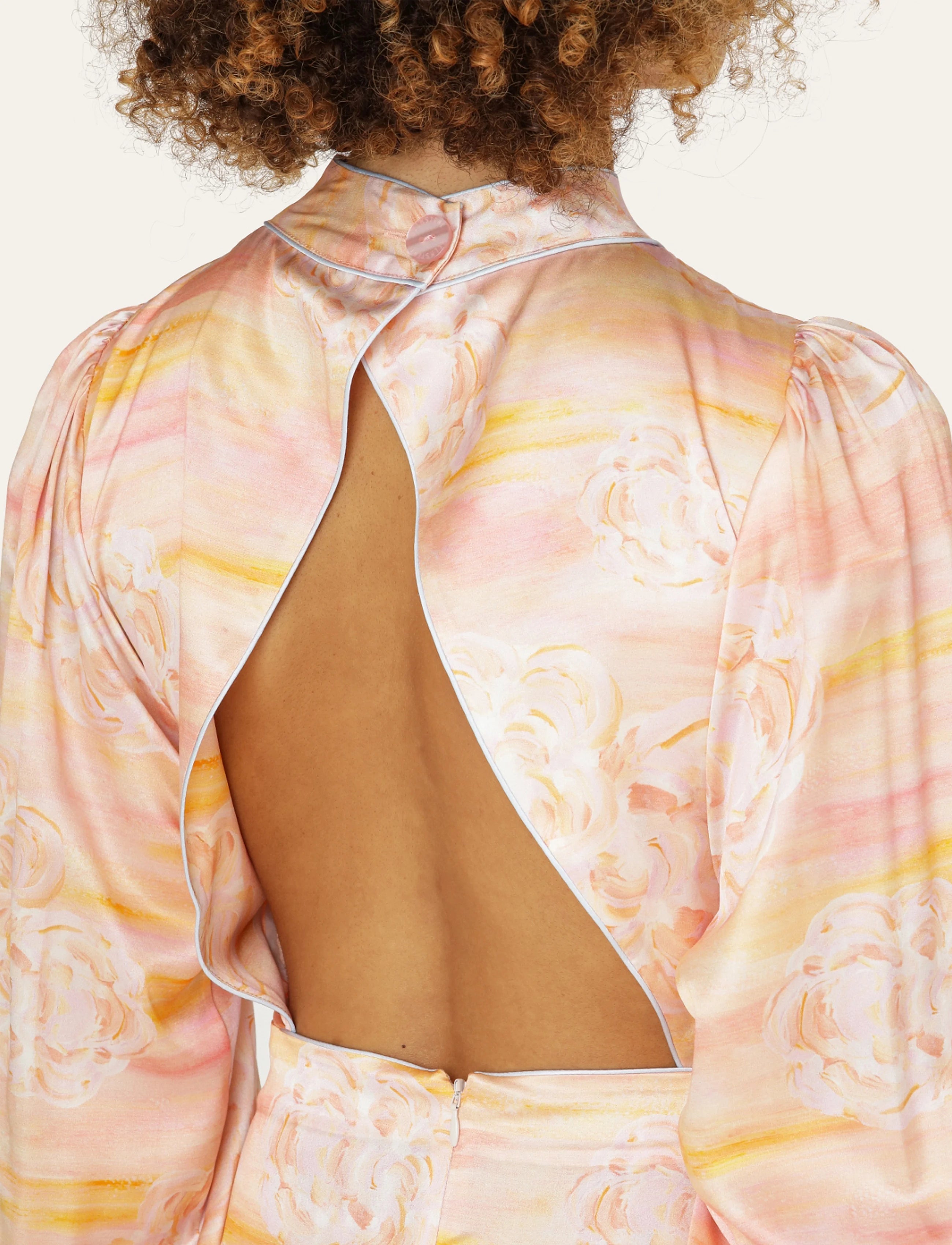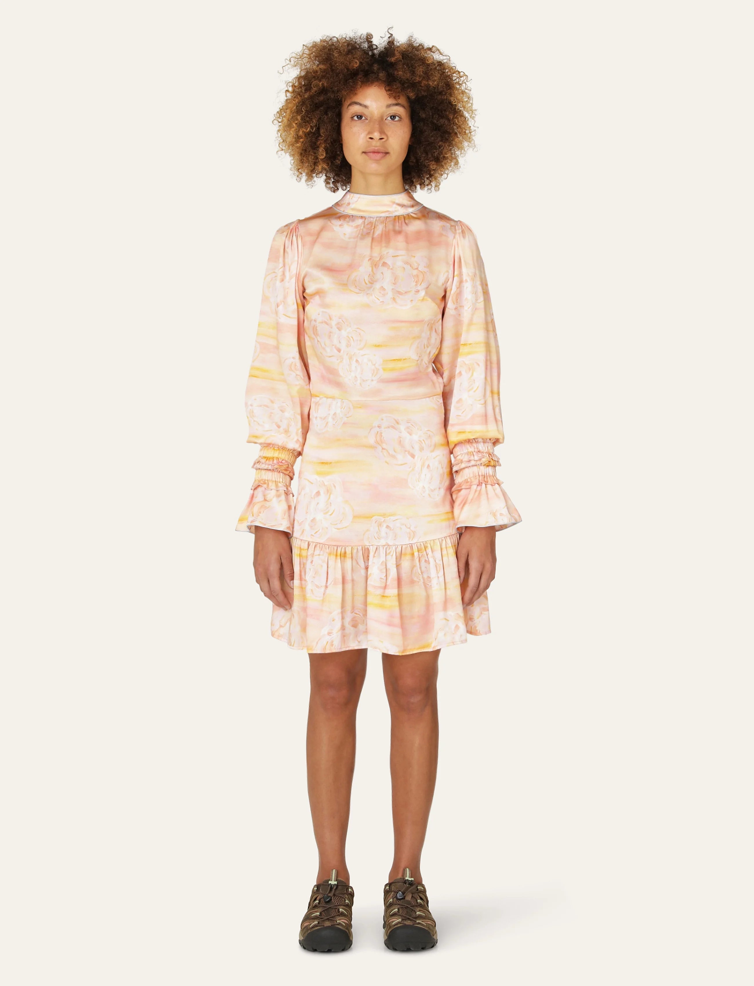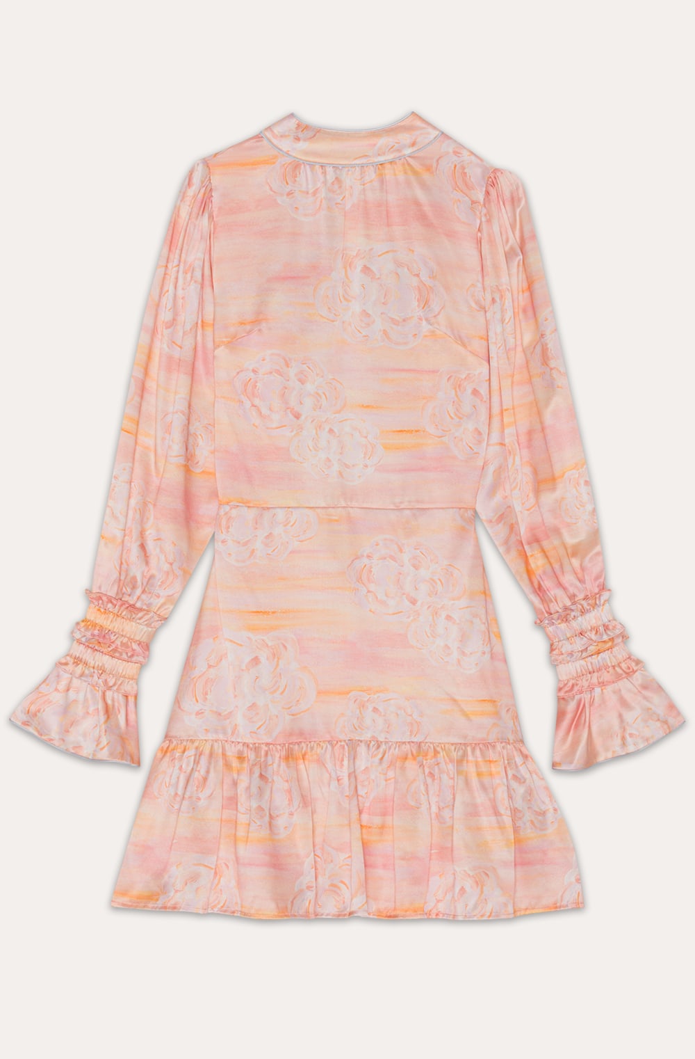 The most darling little dress! The Atu Short Dress has a high neck desgin and long sleeves with elasticated ruffle details on wrist that end in a bell sleeve with piping. It features a mandarin collar with button closure on back of neck. Open back and skirt with ruffle hem. The dress is made from a soft and comfortable fabric, making it perfect for any occasion.