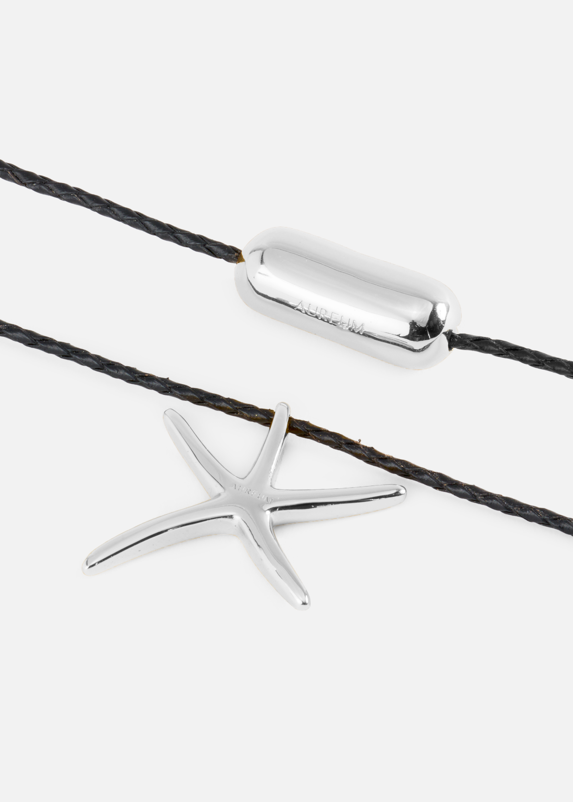 The Aureum Collective Riviera Necklace featuring a starfish silhouette. The pendant is crafted of silver plated brass and a black leather cord with a toggle closure. It is hypoallergenic, made from recycled materials, and has an Aureum e-coating for tarnish resistance. Length: 17 inches.