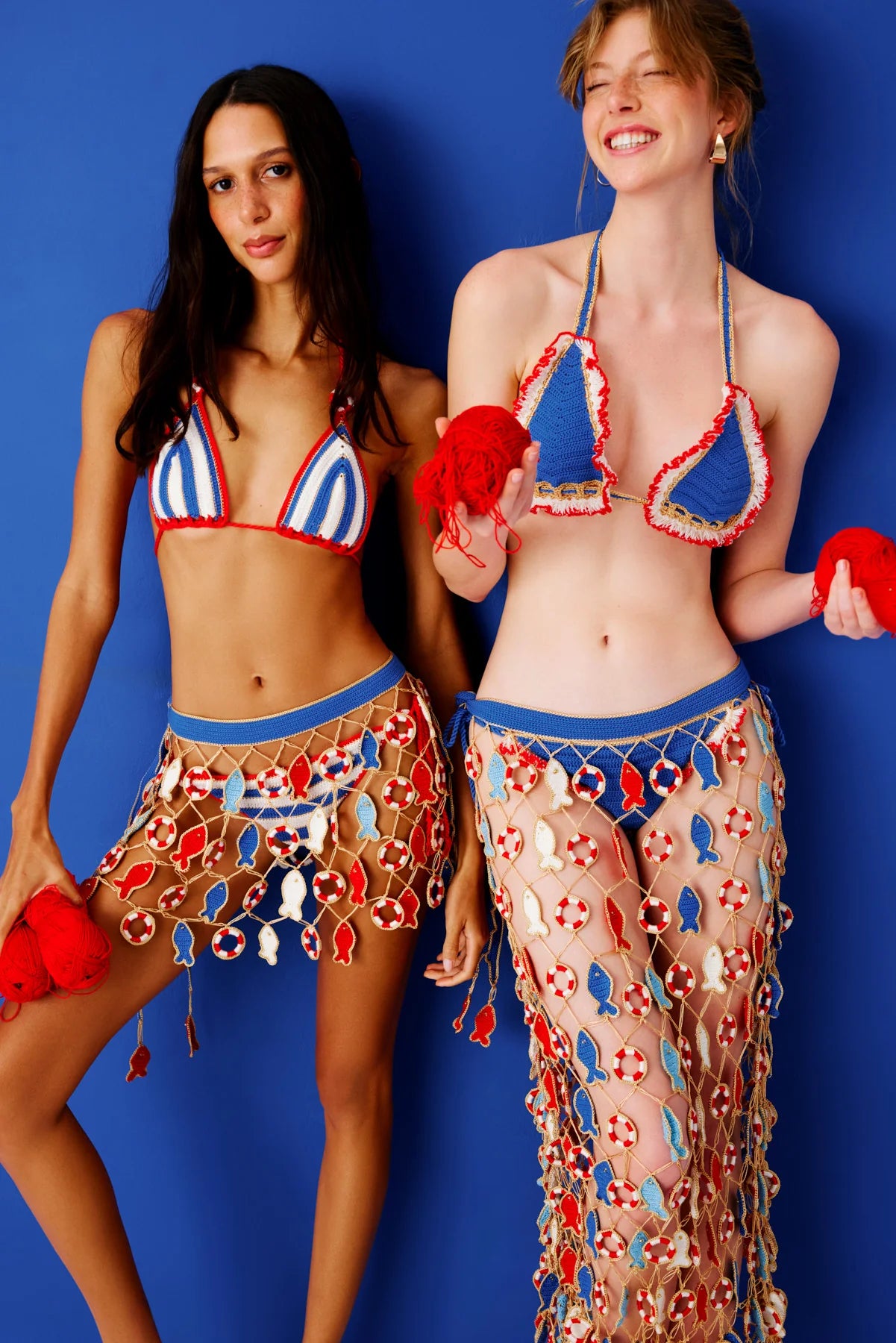 Set sail for summer with our stunning triangle bikini set, inspired by retro nautical silhouettes. Crafted from soft, durable yarns, this exquisite piece features a classic blue and white striped design, beautifully complemented by vibrant red yarn contours that add a playful pop of color.