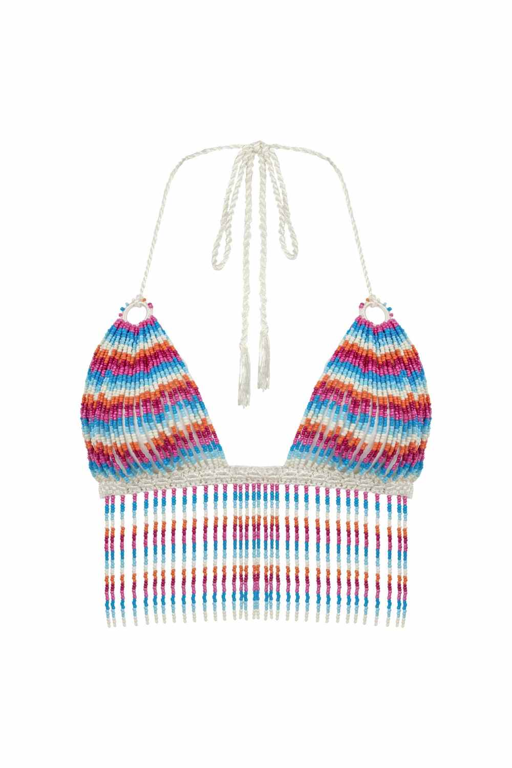 This hand-crochet beaded tie halter top is a radiant and handcrafted masterpiece that exudes bohemian charm and artistic elegance. This unique top is a celebration of meticulous craftsmanship, combining the intricate art of hand crochet with full pendant beading in a mesmerizing array of multi colors. The full pendant beading enhances the allure, adding a dynamic and vibrant visual element that catches the light with every movement.