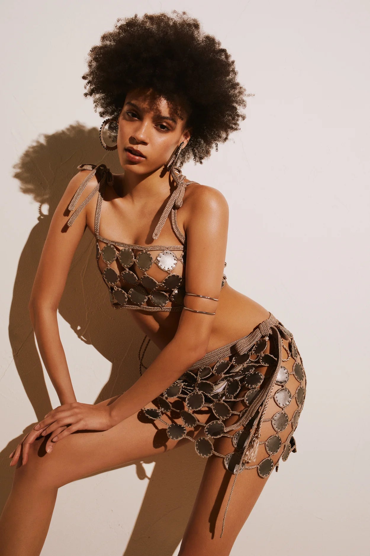 Discover the epitome of sustainable luxury with our artisan hand crochet skirt, designed for resort wear and beyond. This skirt has unique leather scoop motifs adding a contemporary and edgy twist to the crochet design. The fashionable tie detail at the side ensures an adjustable and comfortable fit, making it the perfect choice for stylish summer escapes.