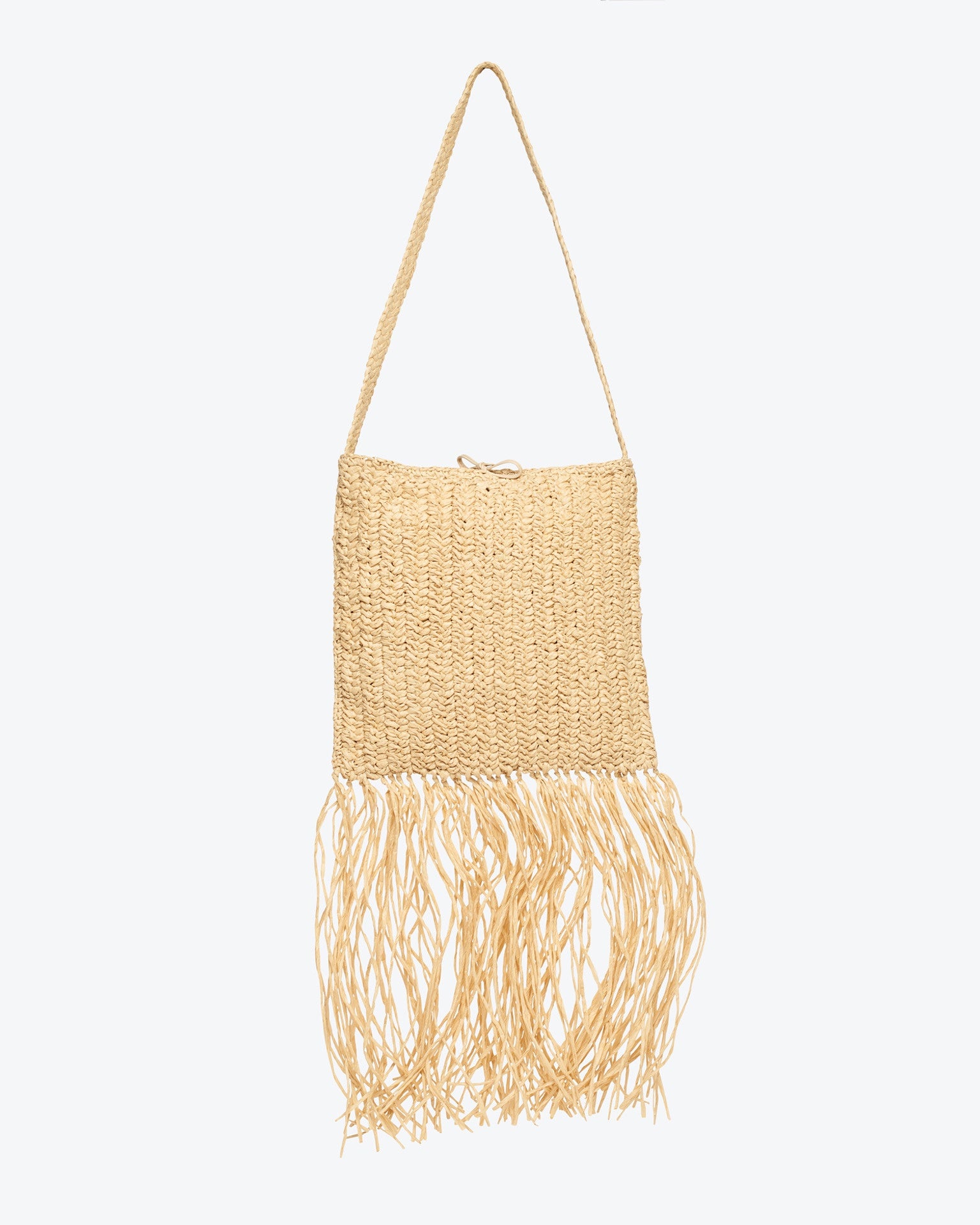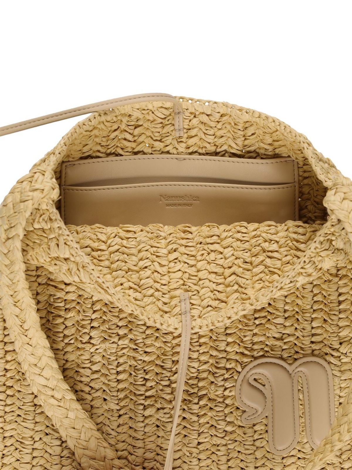 The Fringe Tote is artfully woven from natural raffia and adorned with tassels across the base, giving a deeply textural and dynamic finish. It’s detailed minimally with Nanushka's ‘N’ monogram and a single shoulder strap.