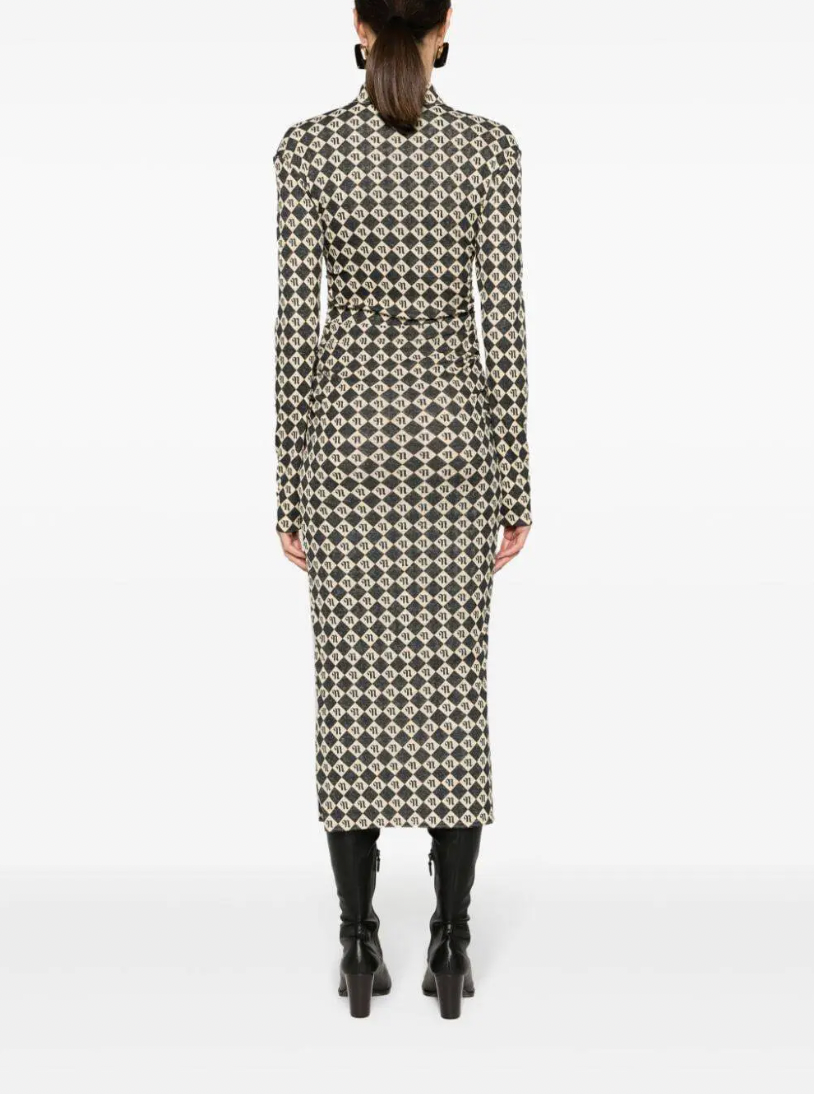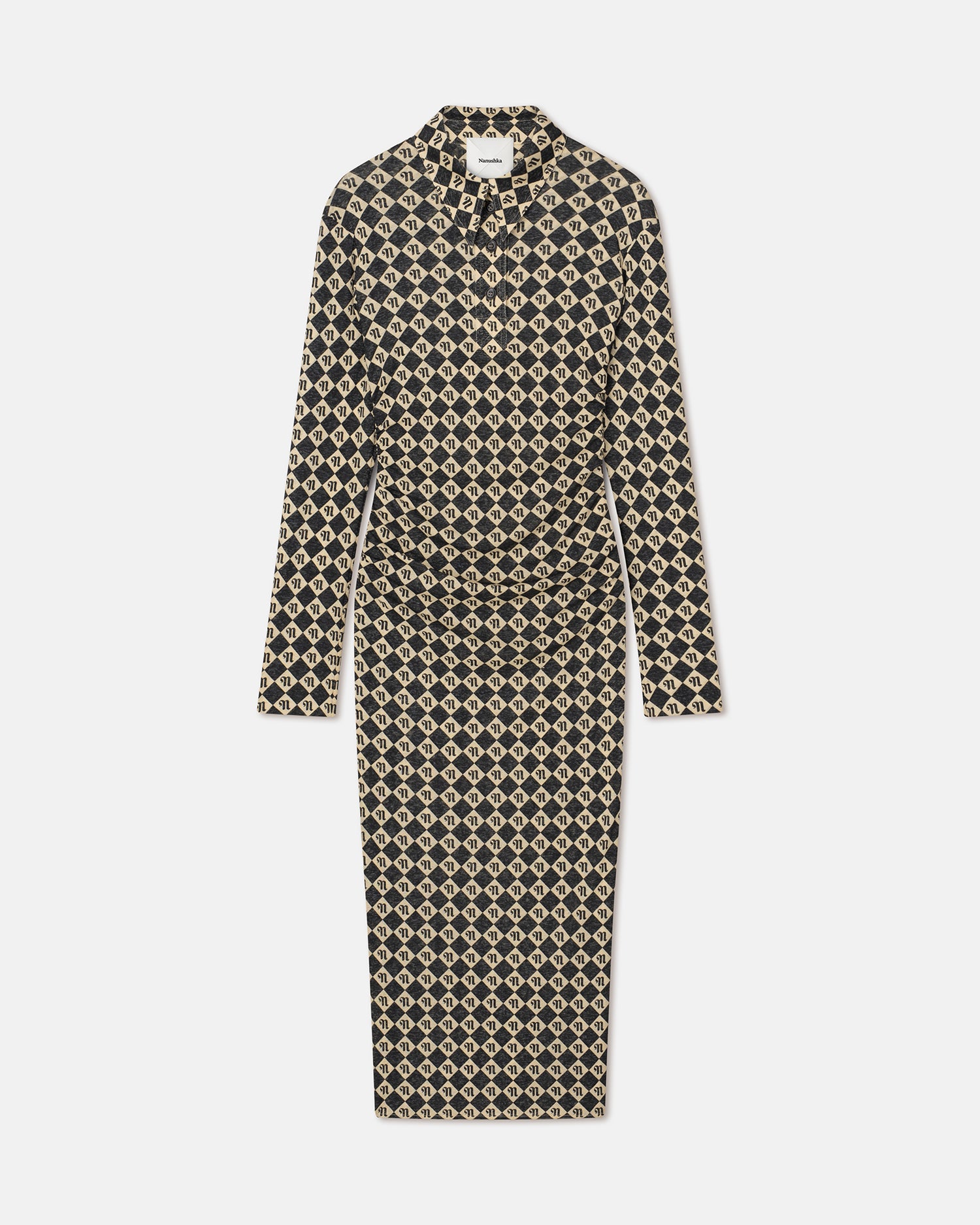 The Verity Dress is crafted from Nanushka’s signature mesh jersey, designed to drape and ruche beautifully around the body. Its structured shirting silhouette adds balance, while the black diamond check print introduces depth and visual texture. A modern blend of softness and structure, perfect for day-to-night styling.