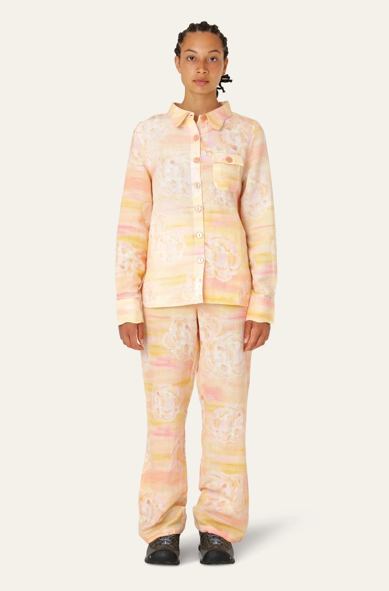 These wide-leg pants feature a high waist and a relaxed fit. They are made from a lightweight and comfortable fabric, perfect for warm weather. The pants have a unique and stylish print that will make you stand out from the crowd. Style them with the Alv Top for a matching yet dreamy look.