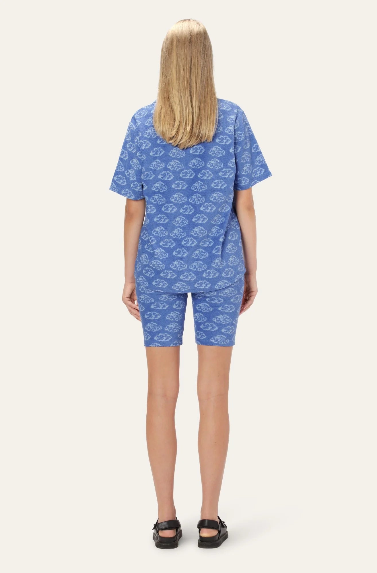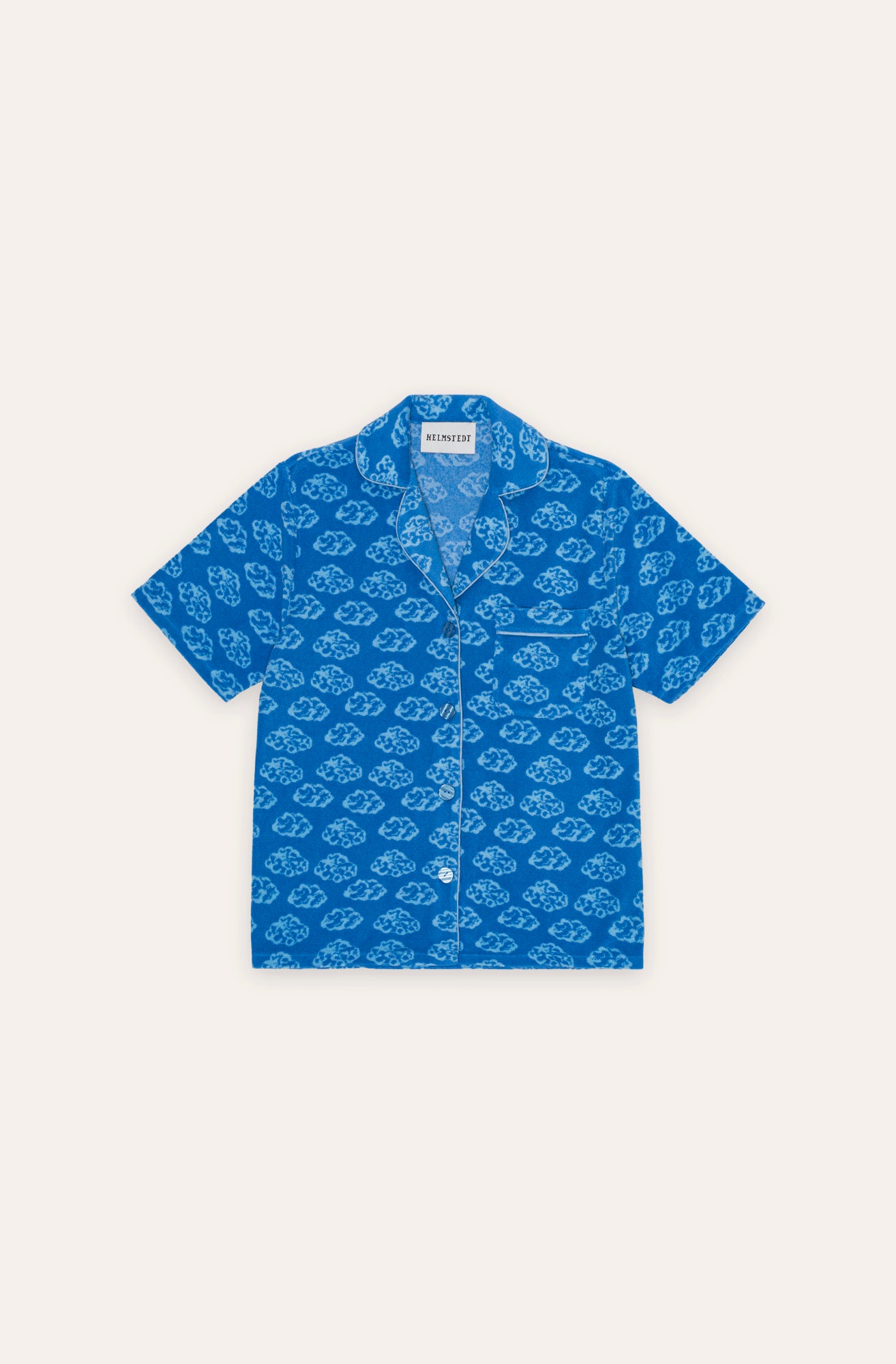 The Flora Shirt is a great addition to our wardrobe with its special design. The shirt has an all over print with terry detail of small light blue clouds. It has one front pocket on the chest, a collar and it is closing on the front with HELMSTEDT logo buttons. To compliment the garment it has a light blue piping on the collar, the front and the pocket. Style it together with our Flora Pants for a cute outfit.