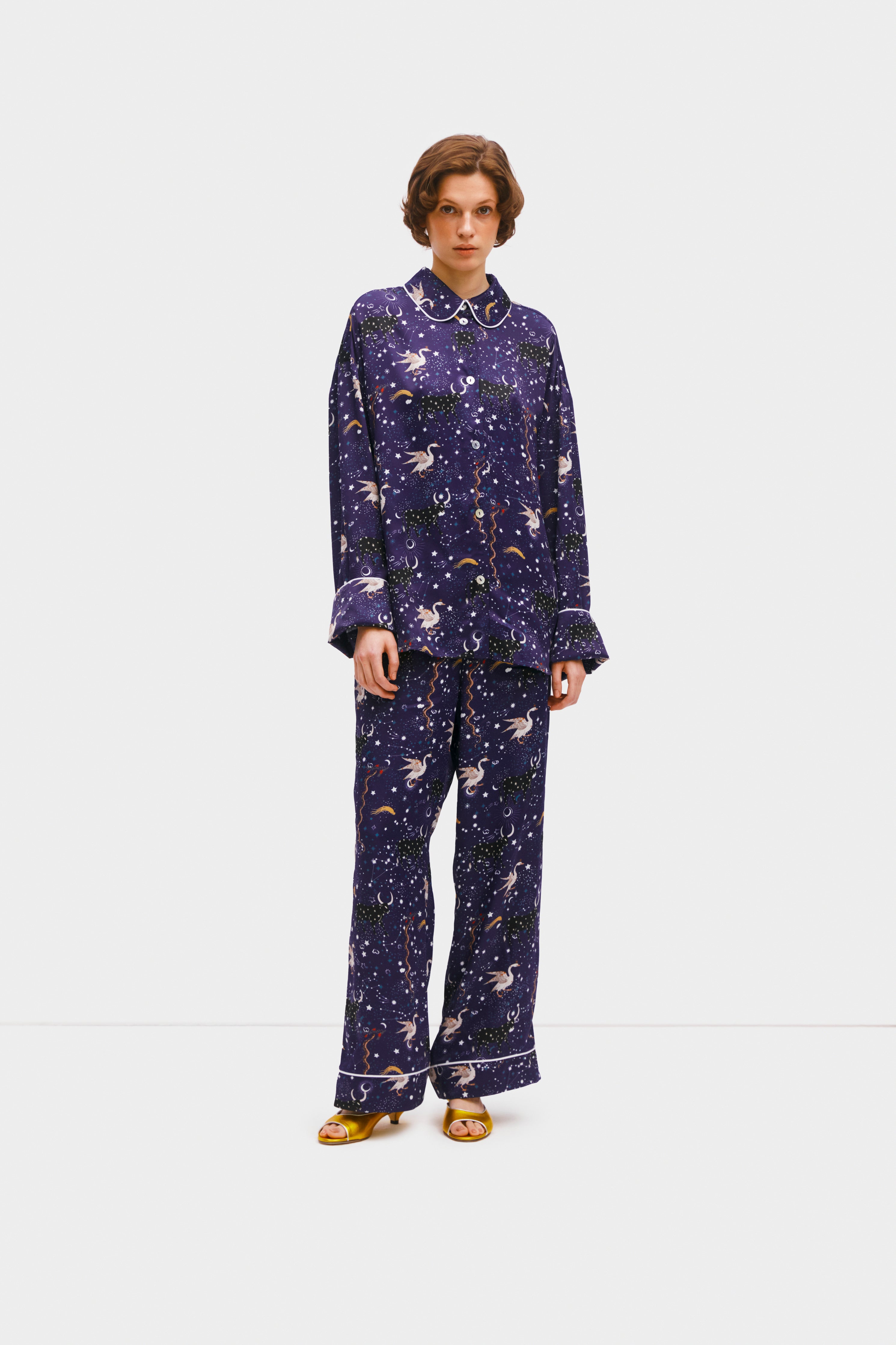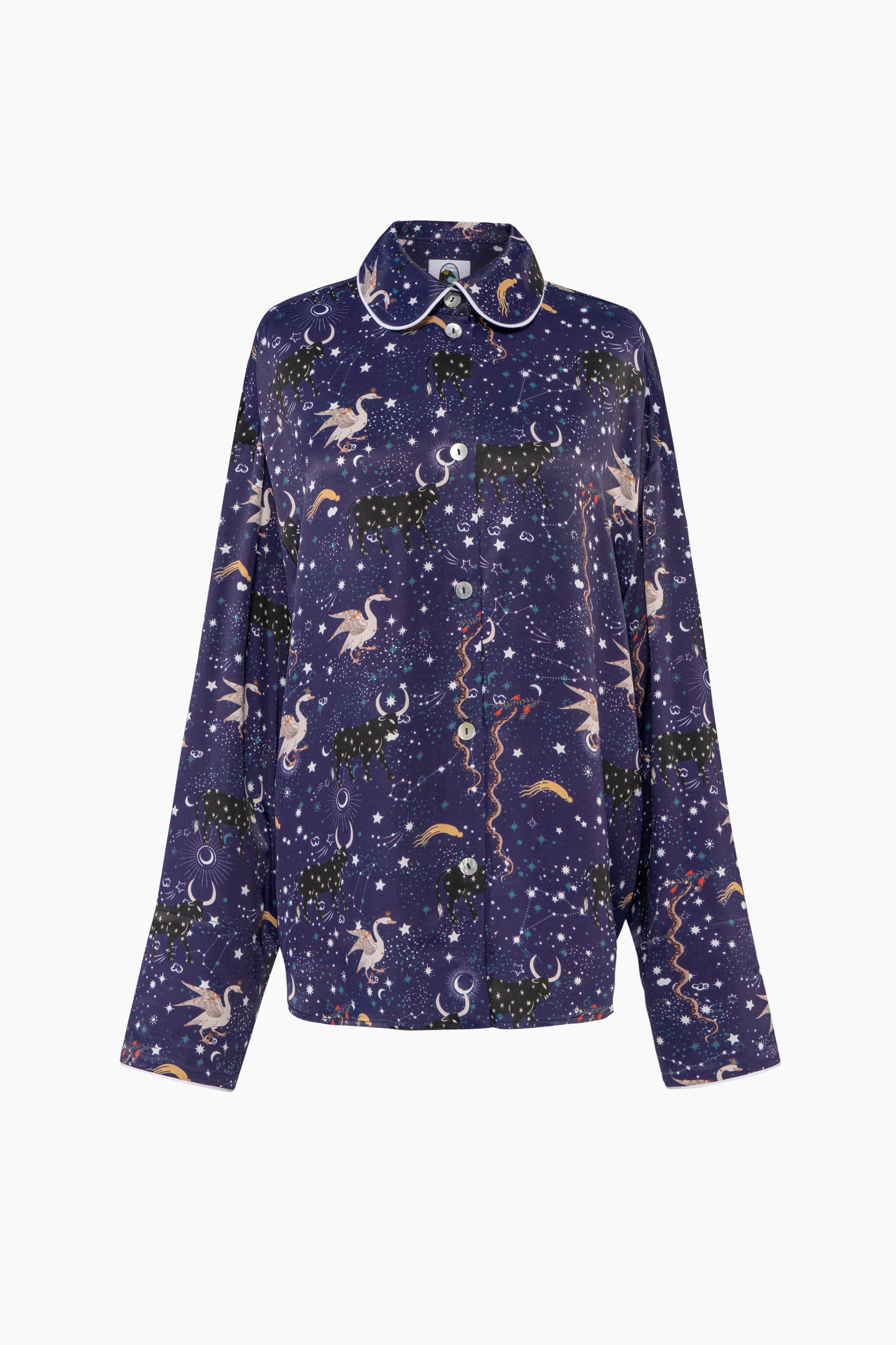 The Sleeper Pastelle Oversized Shirt in Mystic Print is a relaxed-fit, oversized shirt made from soft, certified 100% viscose fabric. It features a captivating, astrology-inspired print with mystical creatures and celestial elements, designed by Milan-based artist Julia Gerasko. The shirt includes a rounded collar, a button front closure, long sleeves with closed cuffs, a pleated back yoke with a hanger loop, and contrast piping for added detail. It is designed for a versatile, effortlessly chic look.