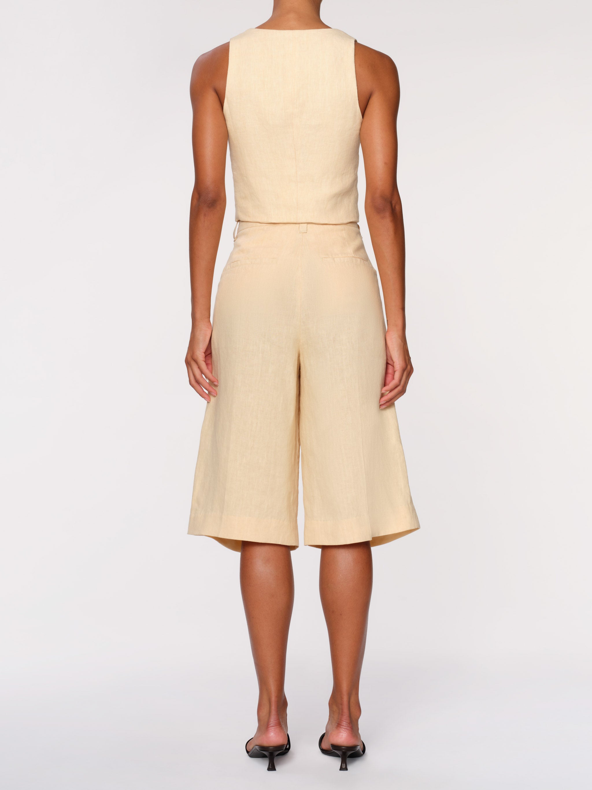 The Hepburn Wheat Linen Shorts is a high rise fit with front pleats, for a sophisticated yet laid-back look. It features tonal stitching and a clean hem. Wear them with our matching Lizzie Wheat Linen Top or with your favorite basic and belt!