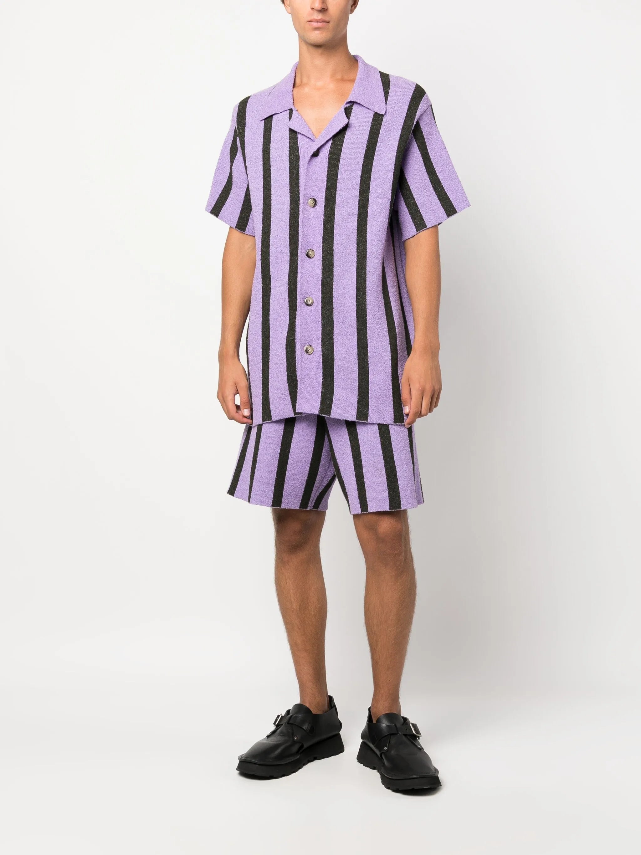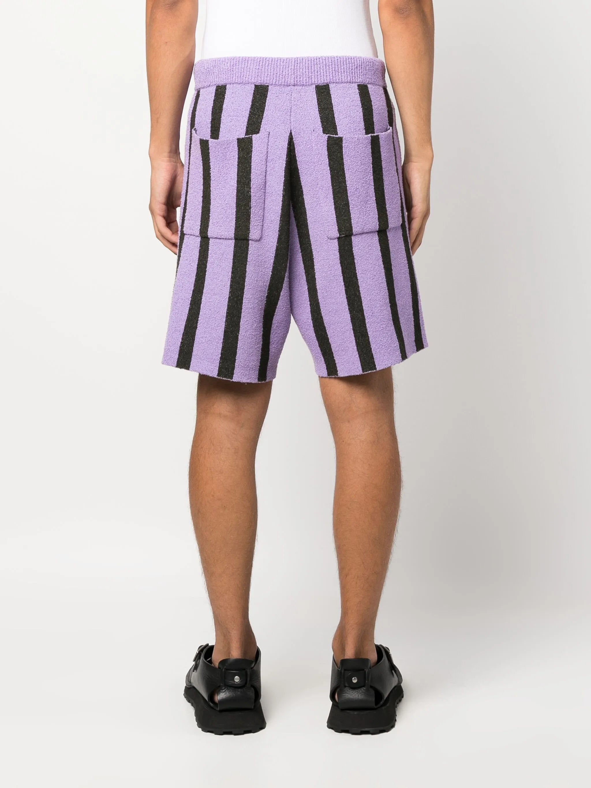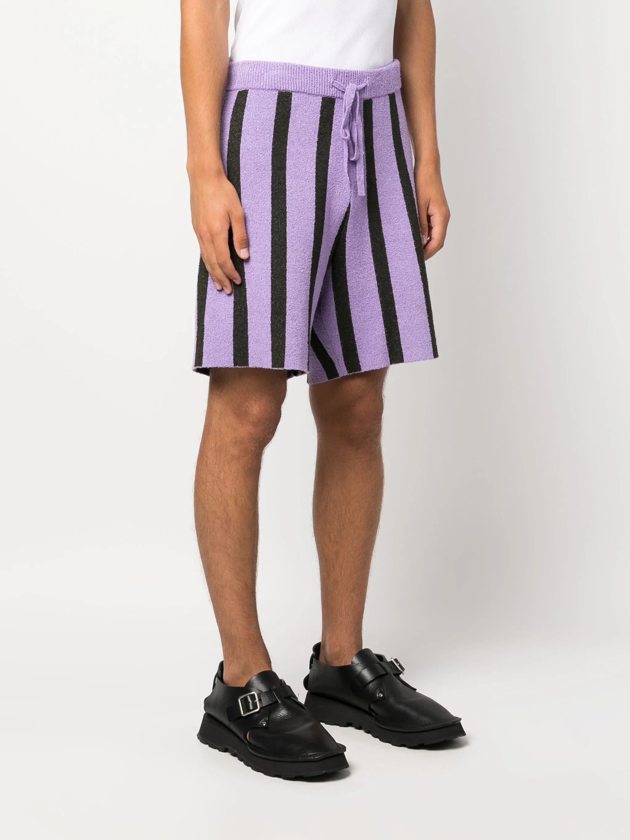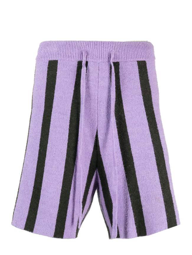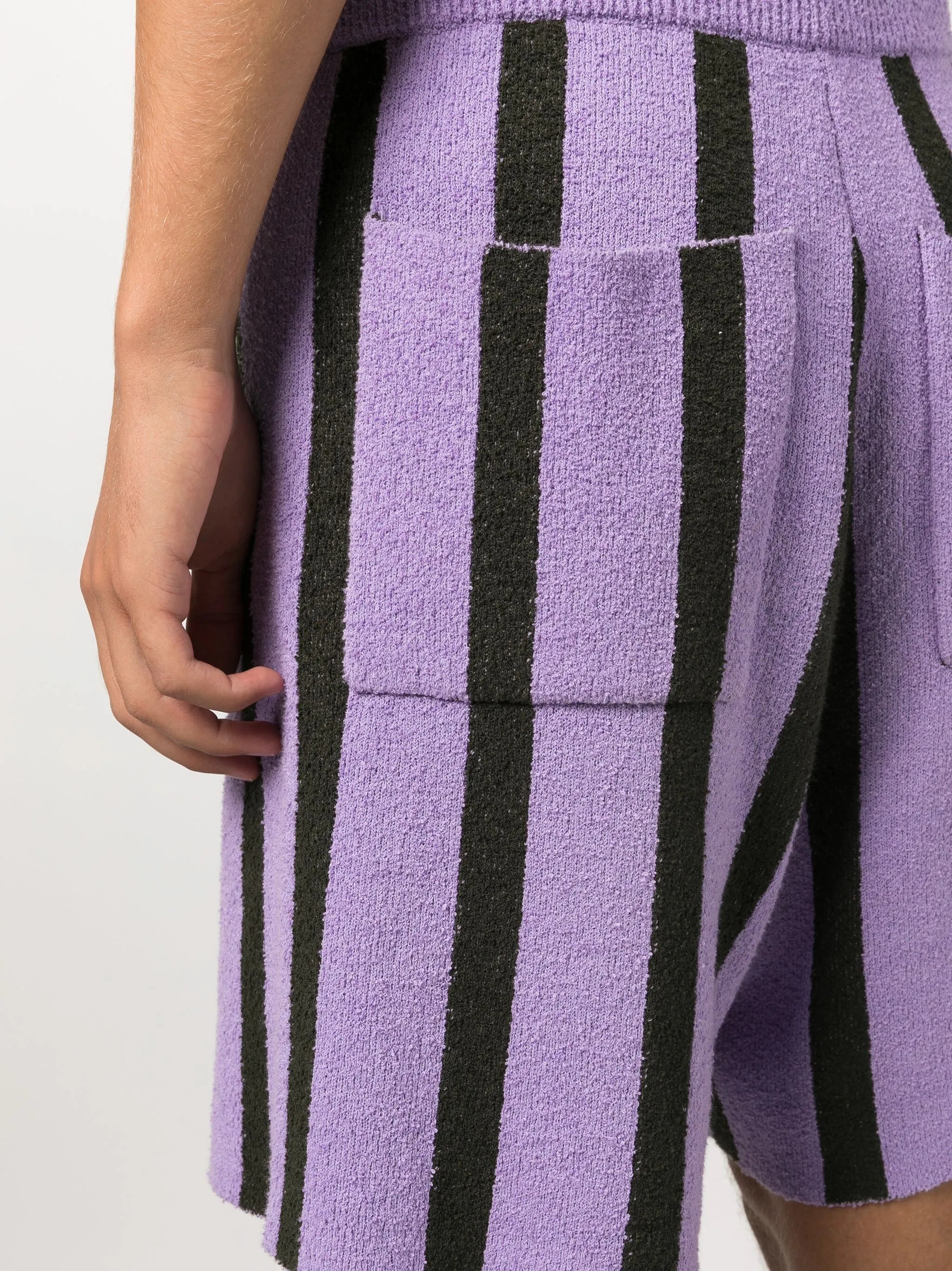 The Walter Shorts by Nanushka are a unisex style crafted from an organic cotton blend with a soft terry-cloth effect that brings comfort and ease to everyday dressing. The relaxed silhouette is elevated by vertical stripes in lilac purple and dark green, adding a playful touch of color. Designed with a drawstring waist and two rear patch pockets, they sit above the knee for a laid-back yet considered look.