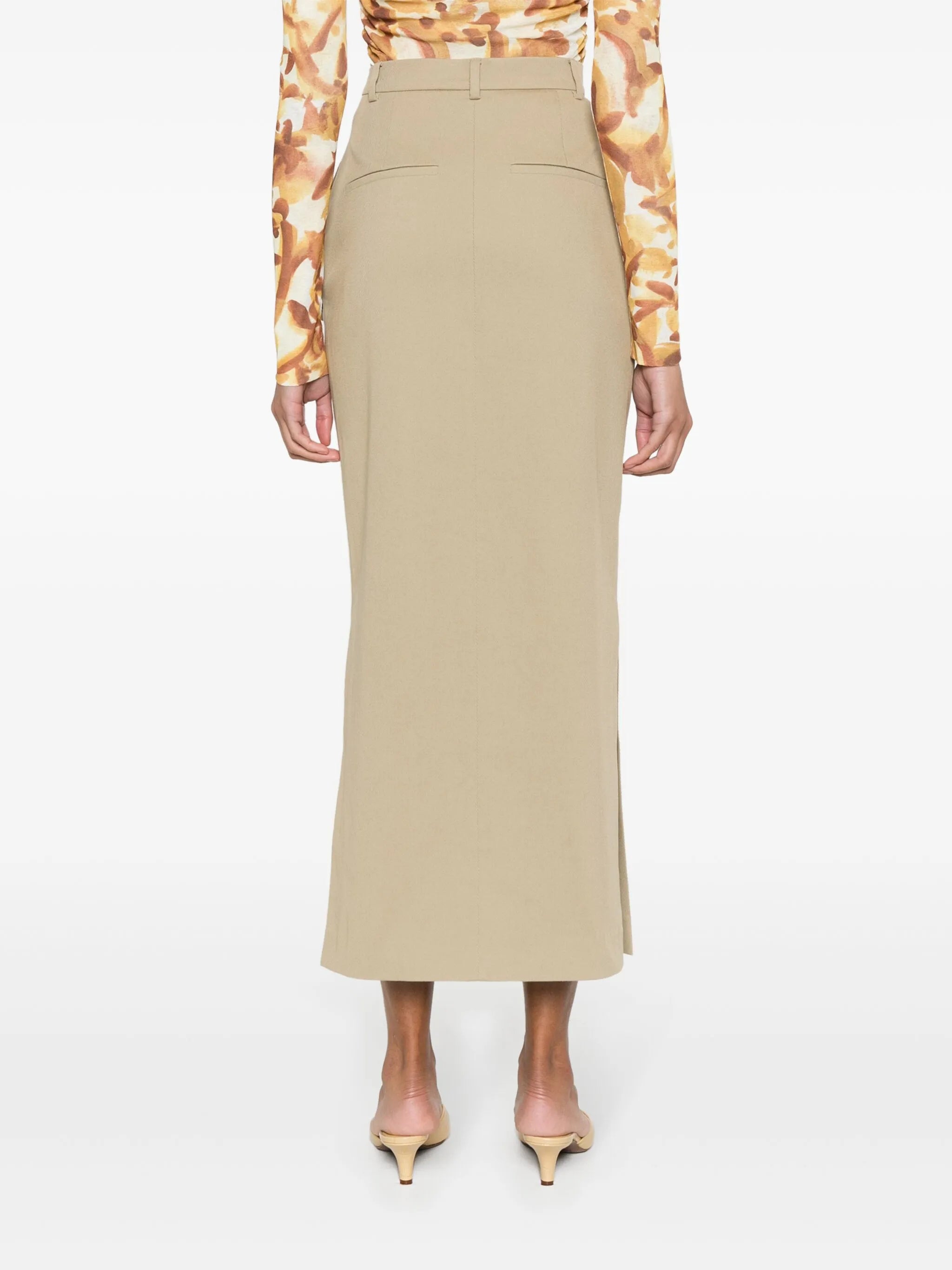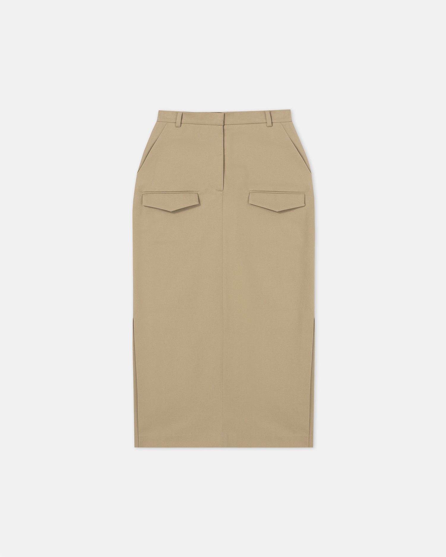 Inspired by classic utilitarian design, the Edena Skirt is a timeless staple reimagined in durable stretch-cotton cavalry twill. It features a high-waisted, lightly fluted silhouette with a side slit for ease and movement. Finished with belt loops and four functional pockets, this mid-length style in soft ecru is perfect for effortless summer dressing.
