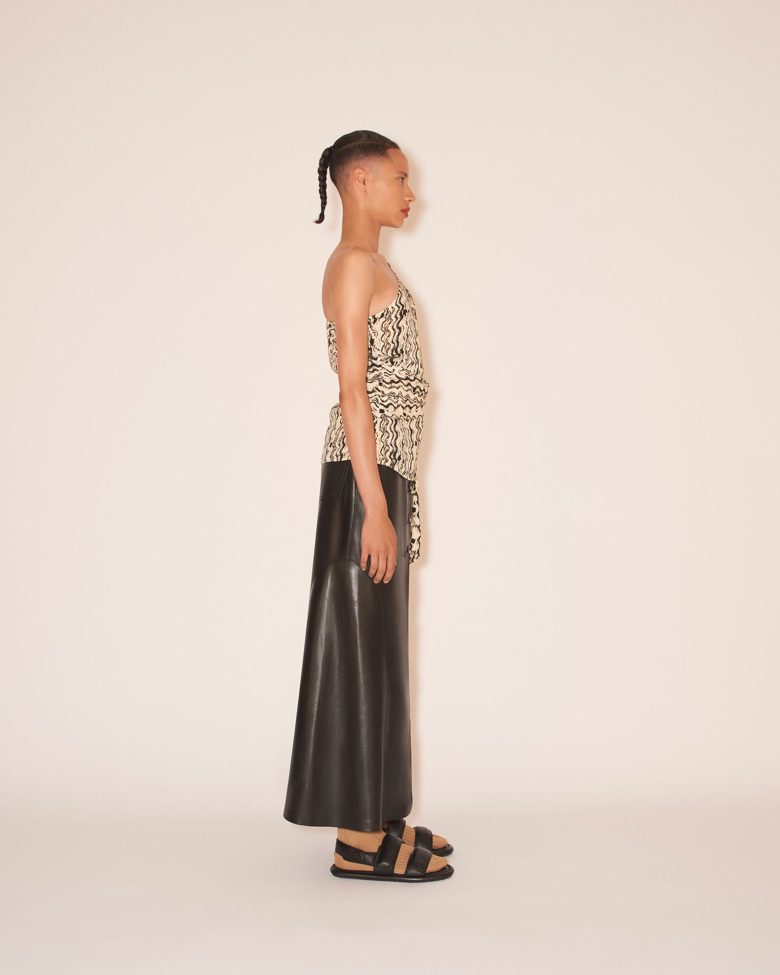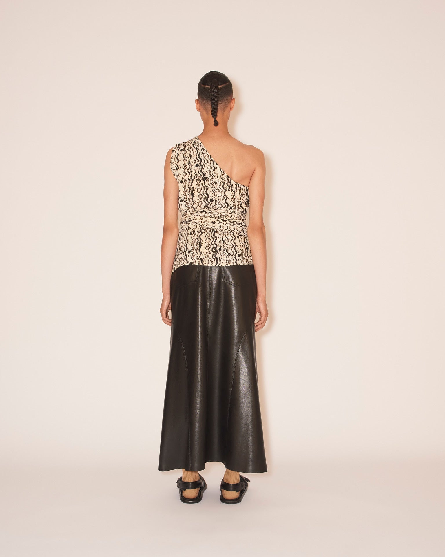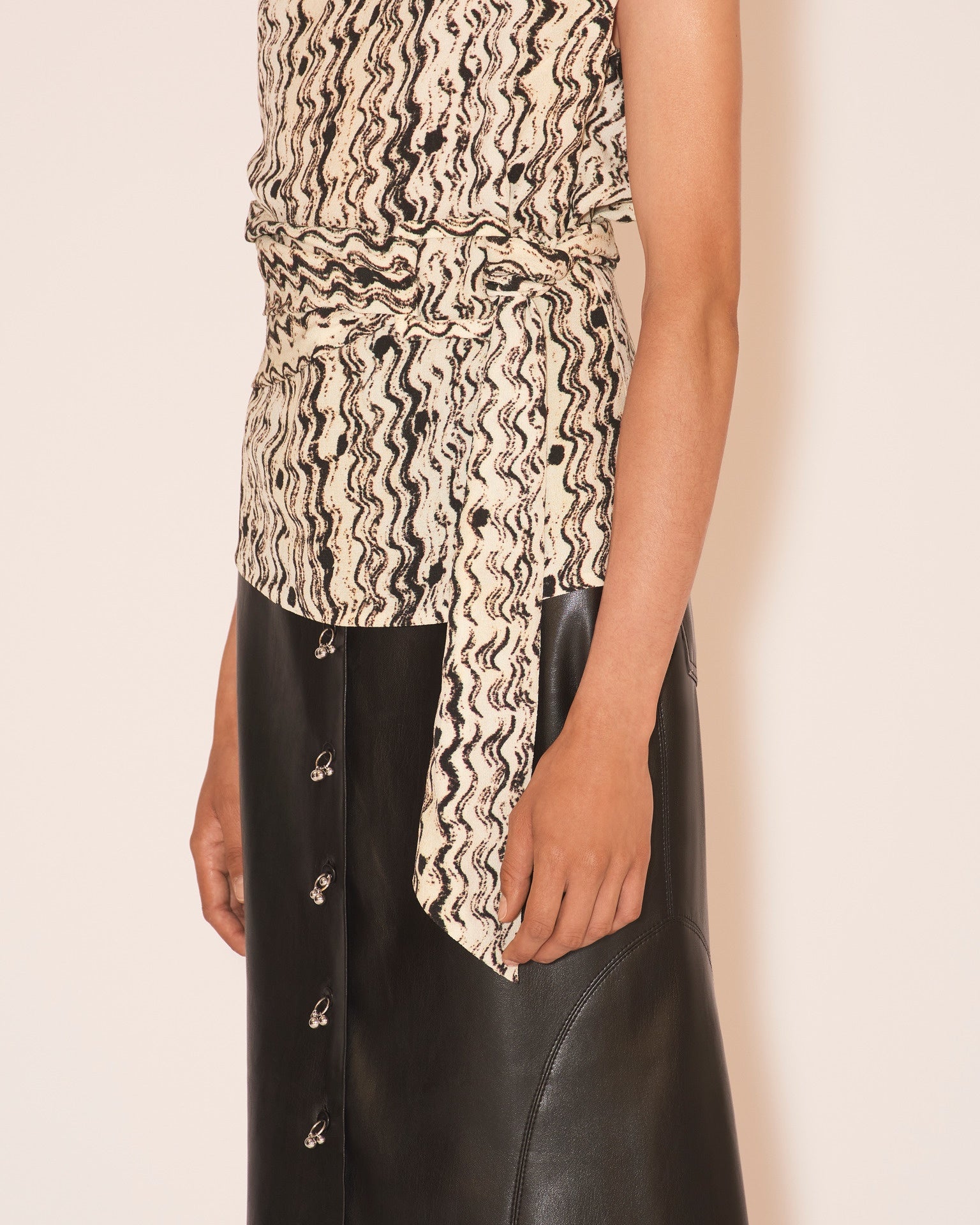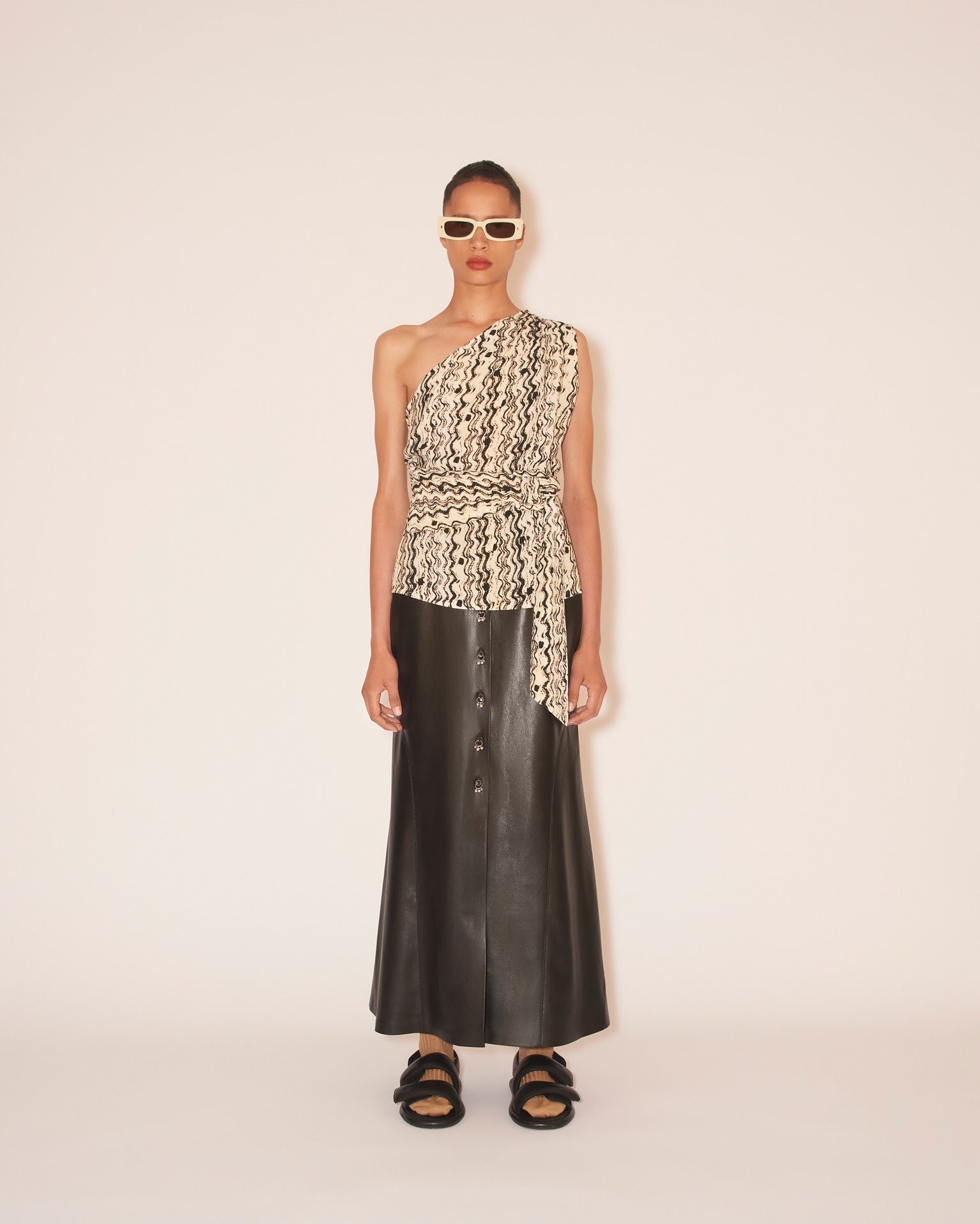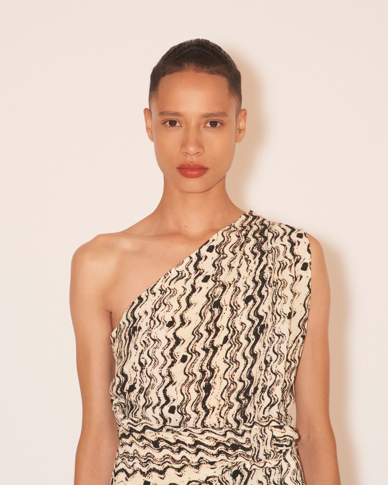 The Alegra Top delivers effortless sophistication with its asymmetric one-shoulder silhouette. Crafted from sustainable crepe viscose in a striking optic wave print, it features soft, fluid draping and a D-ring waist belt that cinches the shape just right.