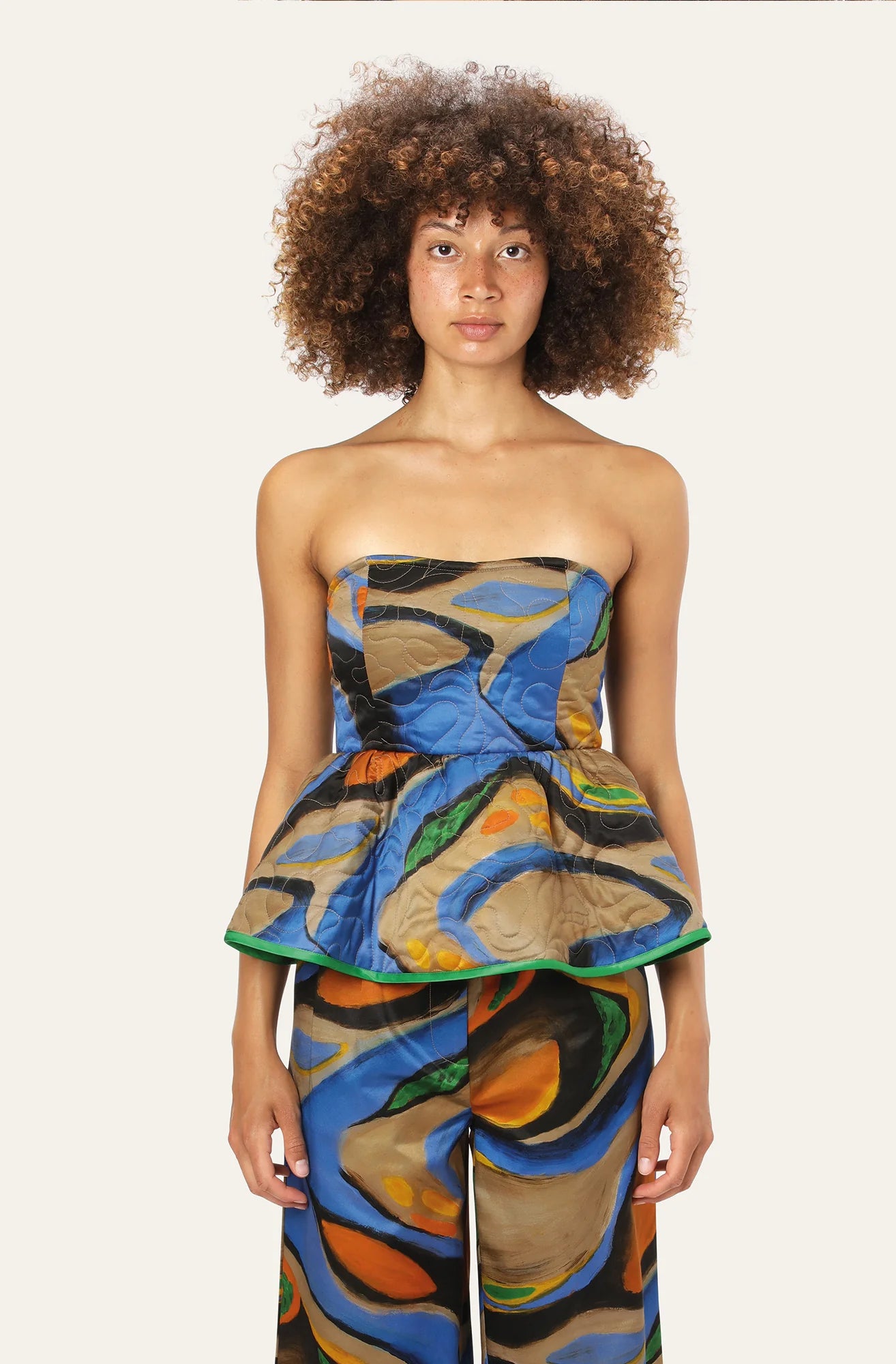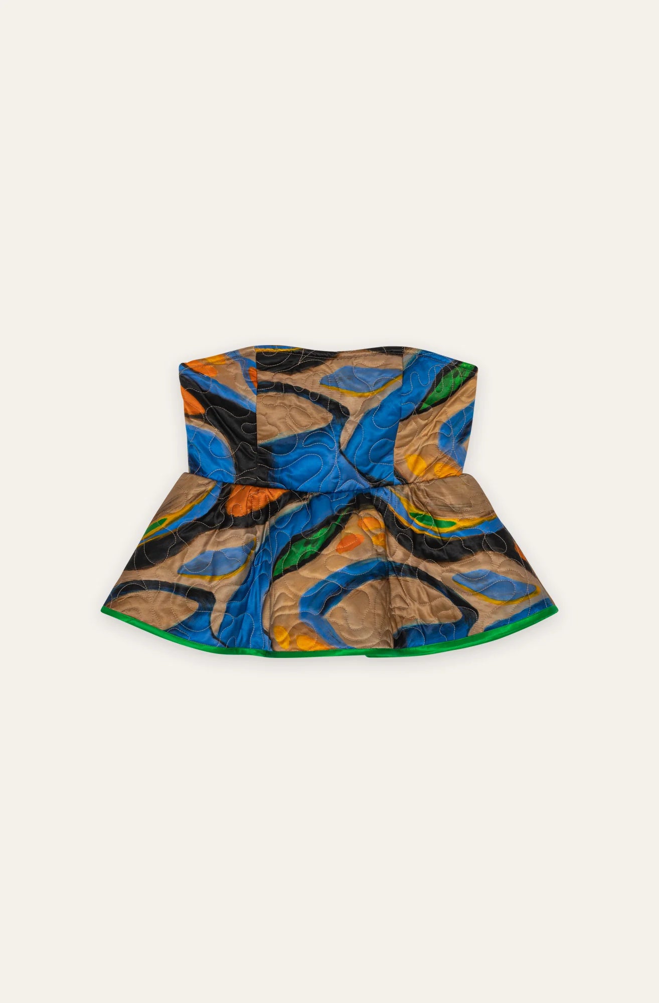 Quilted top with sweetheart neckline in all-over print. The beautiful oasis print comes with green piping. The Emilie Top has darts at front and shirring at back with an invisible zipper and hook and eye above the zipper. Cutline in the waist added a lot of gatherings for a voluminous look. Finished off with a silicone ribbon inside the top, bias tape and lining matching the color of the print.