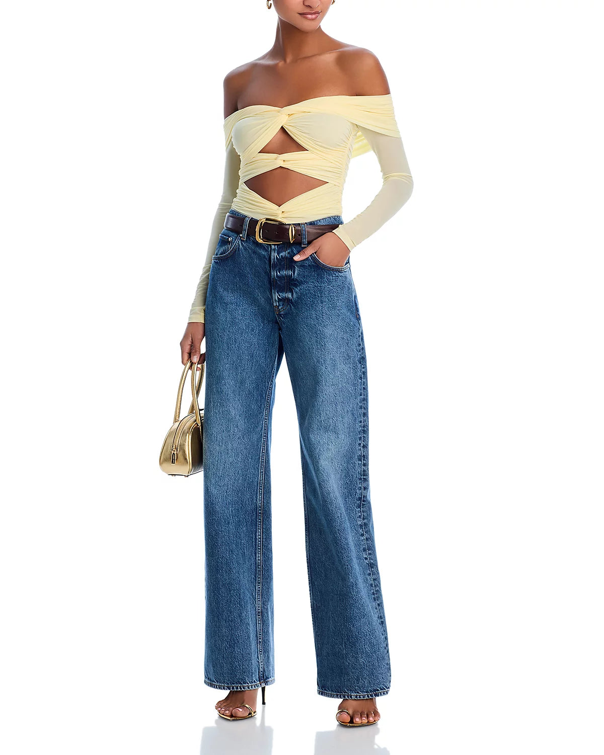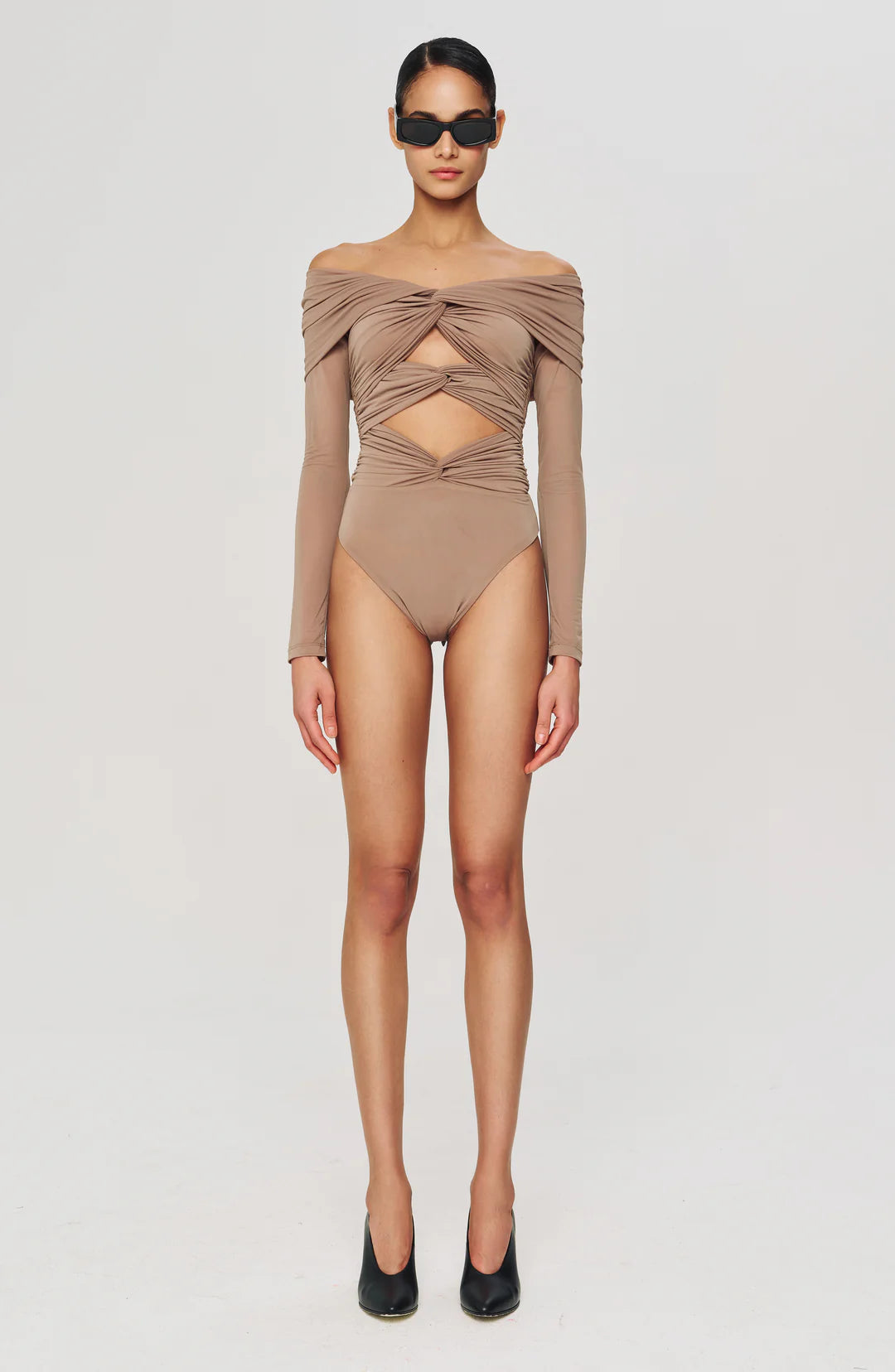 This bodysuit masters the art of sophisticated layering. The wrapped bodice creates architectural interest while strategic cutouts add modern allure. Off-shoulder construction brings drama to this foundational piece.