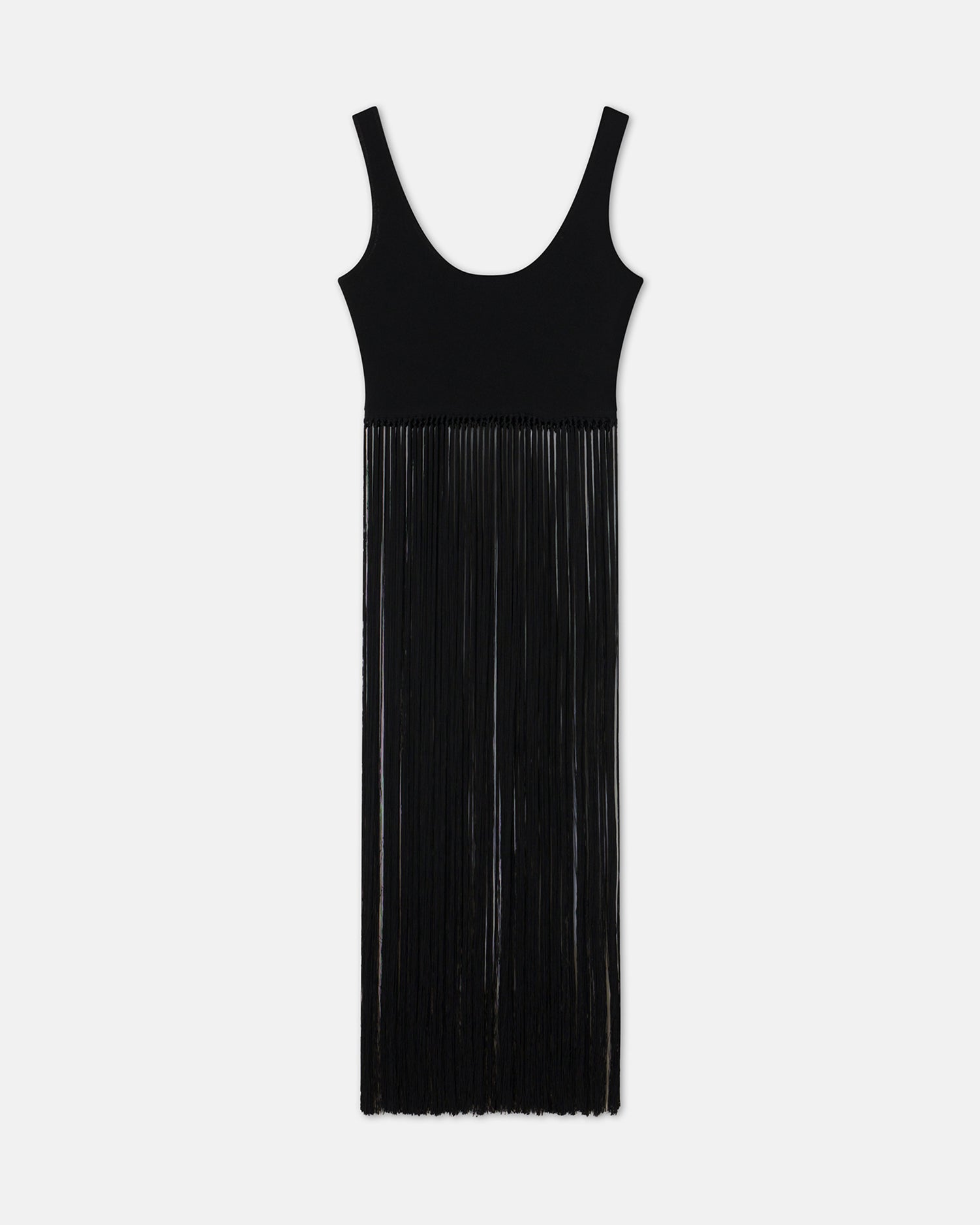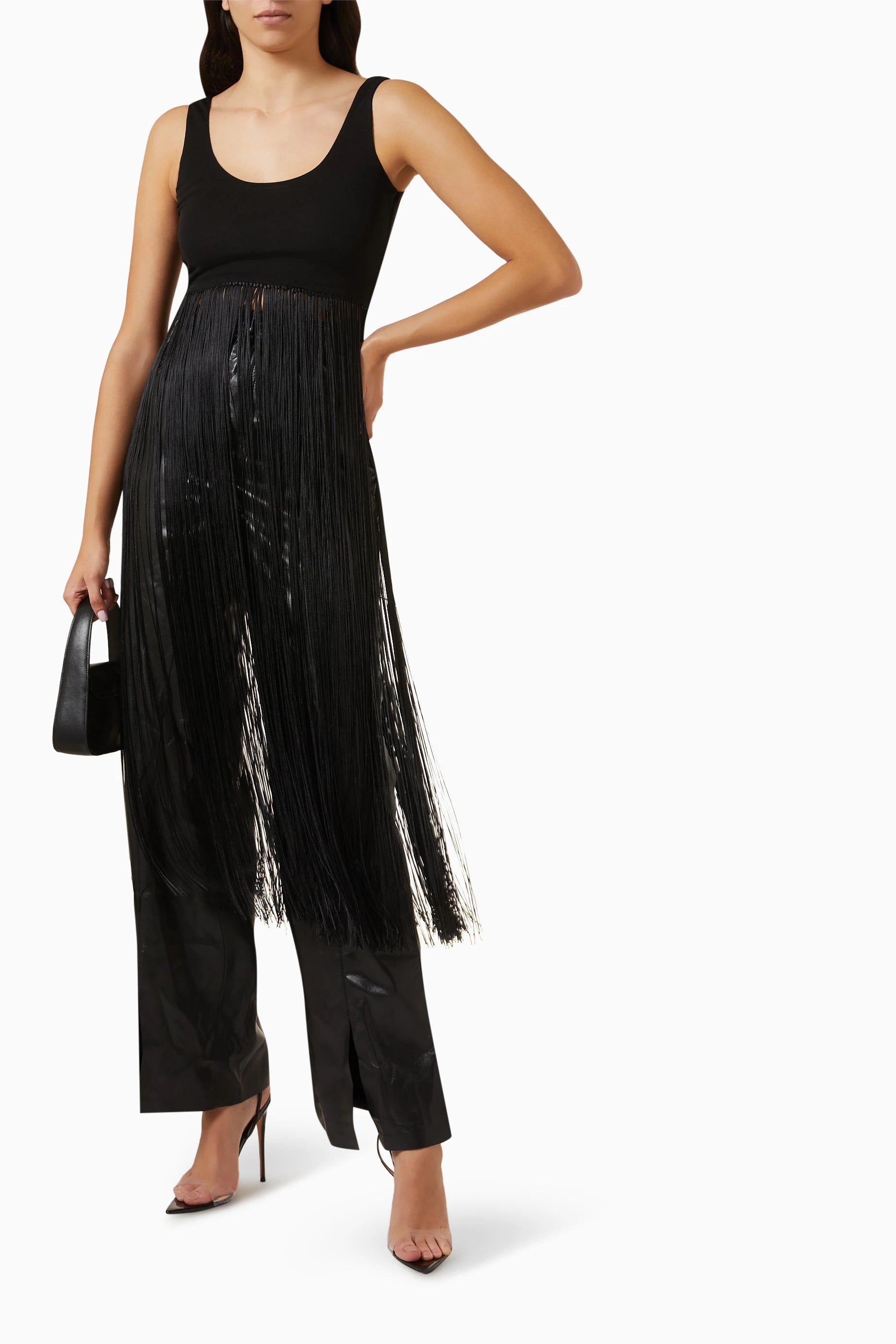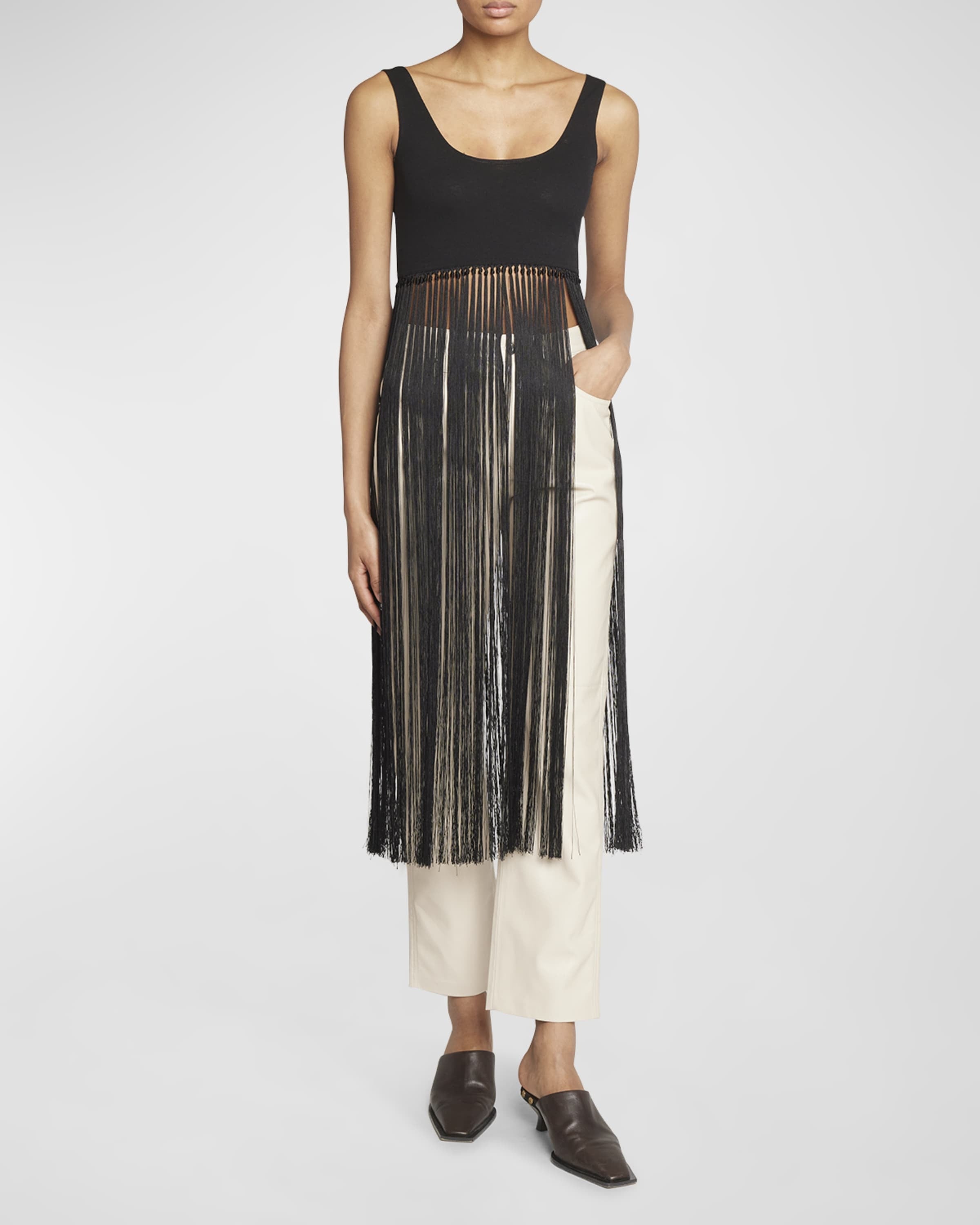 The Fusca Knit Tank Top by Nanushka is bold, playful, and effortlessly striking. Crafted from innovative mesh-jersey, it features a scoop neckline, fitted silhouette, and a dramatic long fringe hem that falls below the knee. Designed for standout summer moments, it’s a piece made to move with you... and to be remembered.