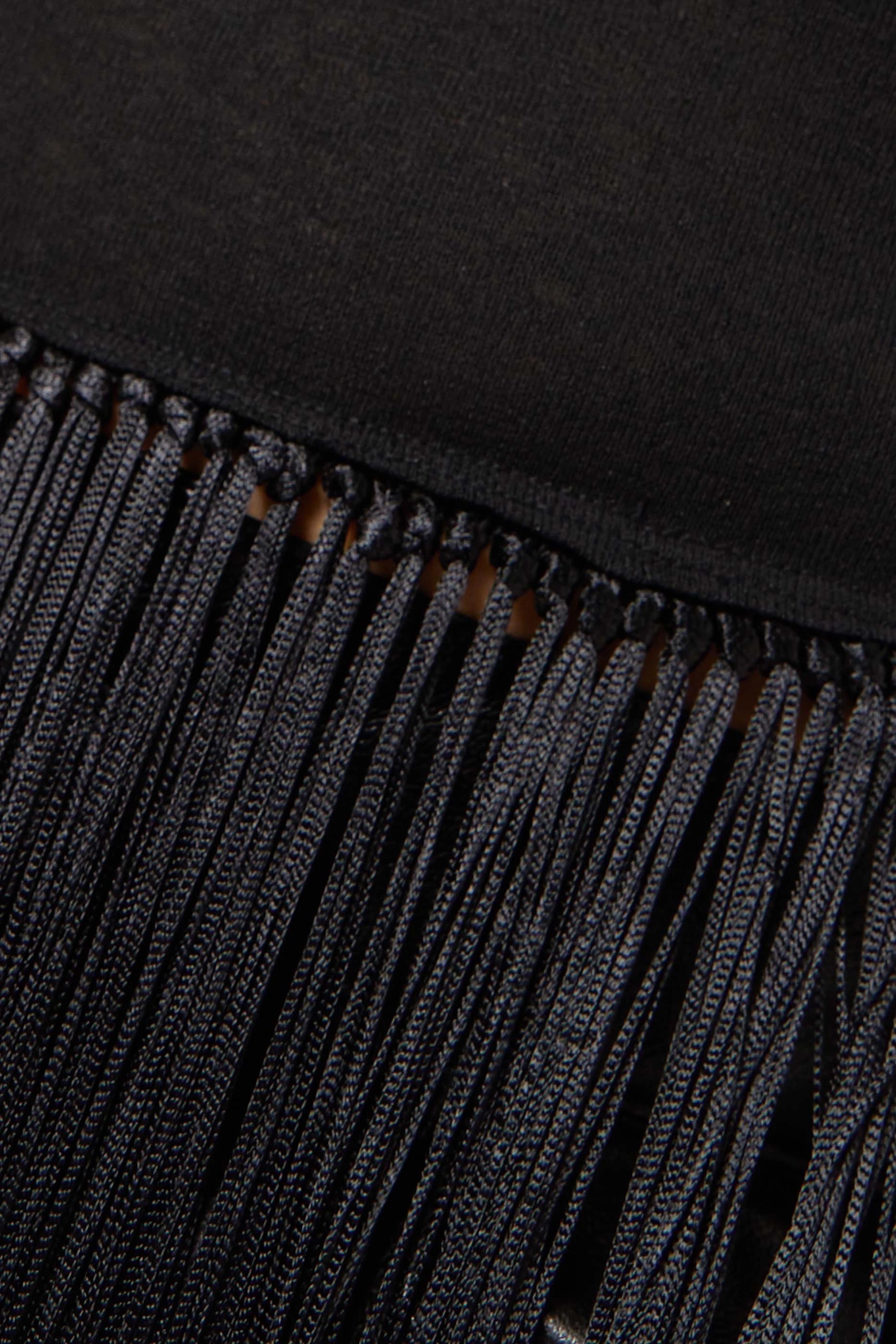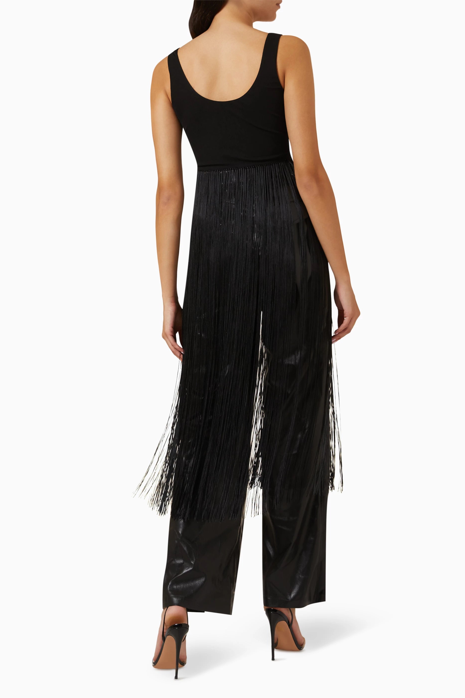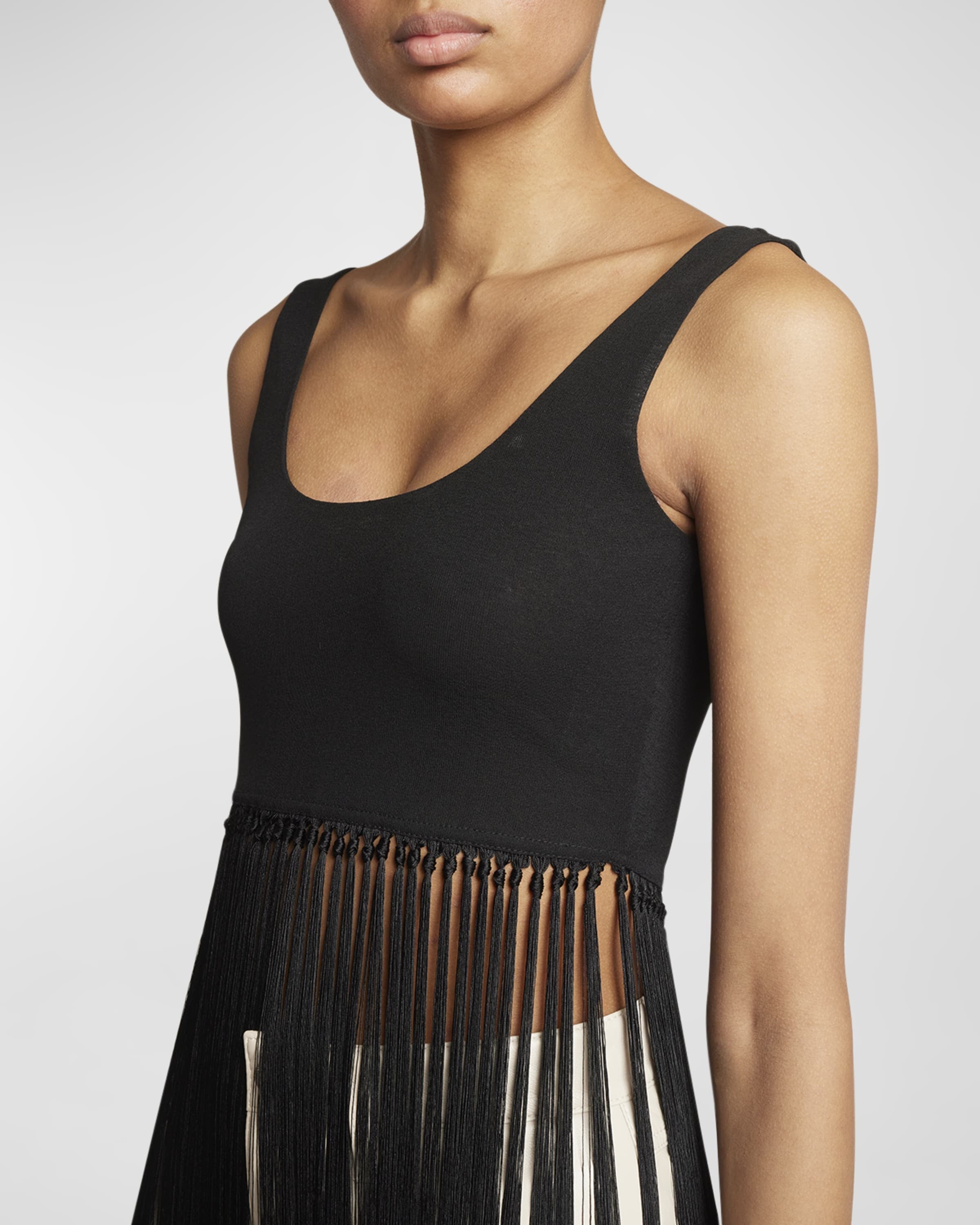 The Fusca Knit Tank Top by Nanushka is bold, playful, and effortlessly striking. Crafted from innovative mesh-jersey, it features a scoop neckline, fitted silhouette, and a dramatic long fringe hem that falls below the knee. Designed for standout summer moments, it’s a piece made to move with you... and to be remembered.