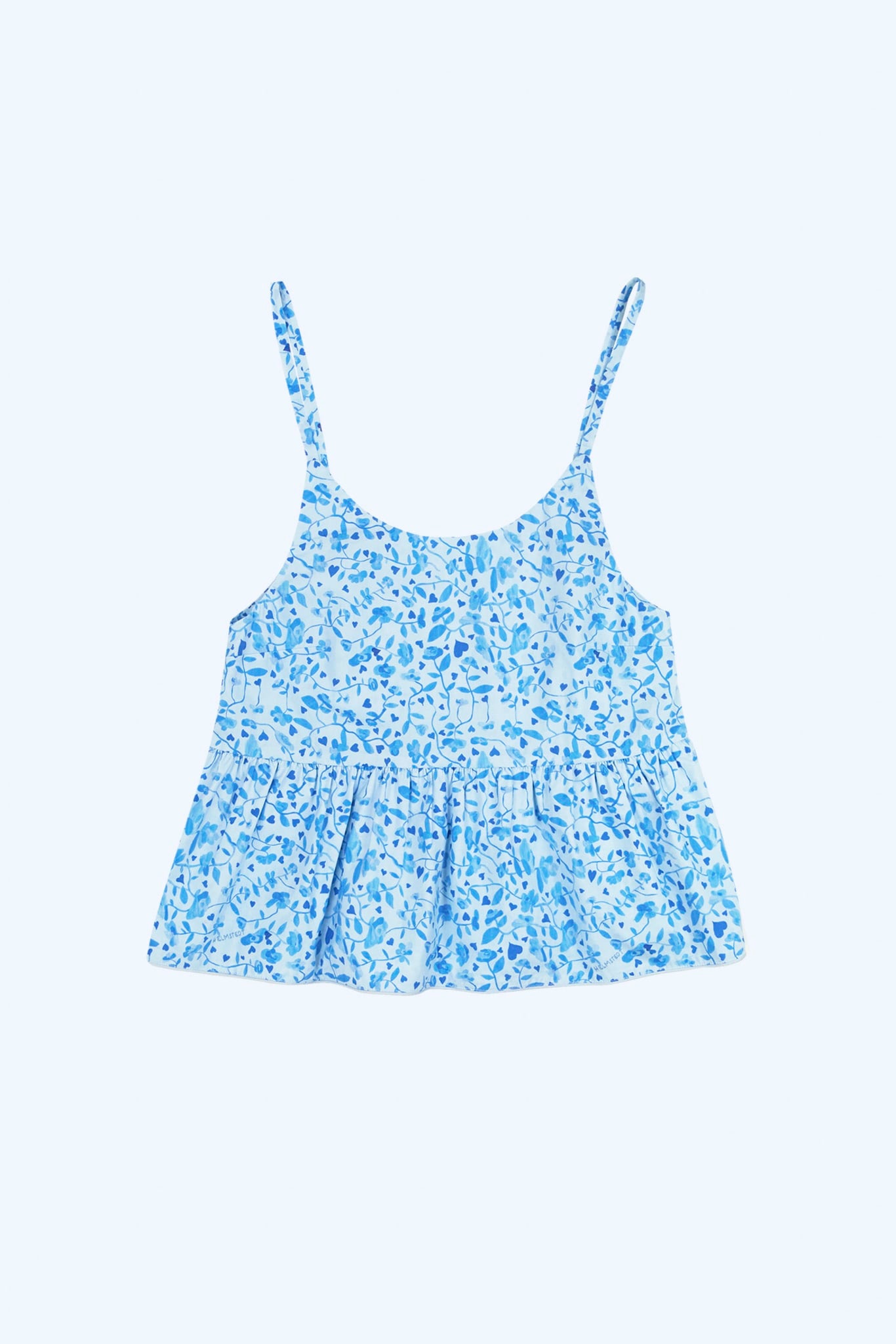 The Mira Camisole Top is a lightweight piece featuring a flattering peplum silhouette. Delicate straps and a soft neckline enhance its understated design, while the pattern adds vibrancy and playfulness. The hand-painted watercolor florals and hearts in pretty blue heusprint adds a soft, artistic touch, making these shorts perfect for sunny days. The scalloped hem provides a clean yet playful finish, complementing the top's relaxed fit. Ideal for layering or wearing on its own, the Mira Top combines craftsmanship with comfort for versatile styling. Create a cute matching look with the Mira Shorts.