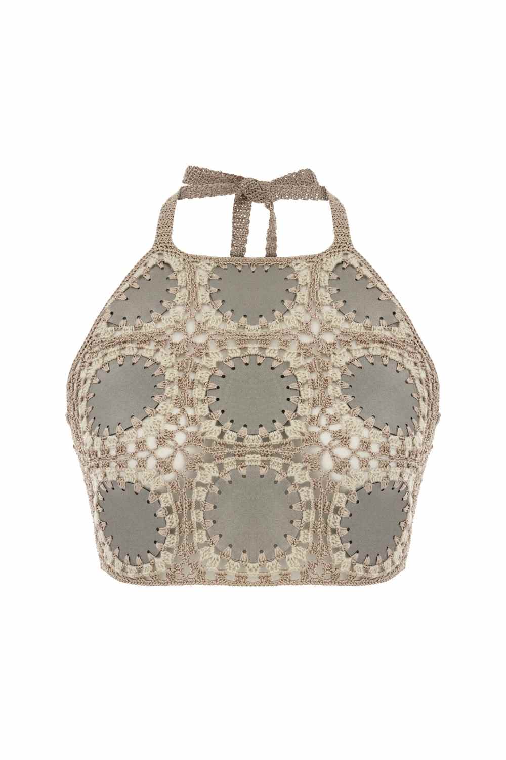 This hand-crochet tie halter crop top is adorned with leather scoop motifs that add a touch of contemporary edge to hand-crochet design. The multicolored palette of this crop top enhances its versatility, allowing you to effortlessly pair it with various bottoms, from Taffy Mini Skirt to jeans.