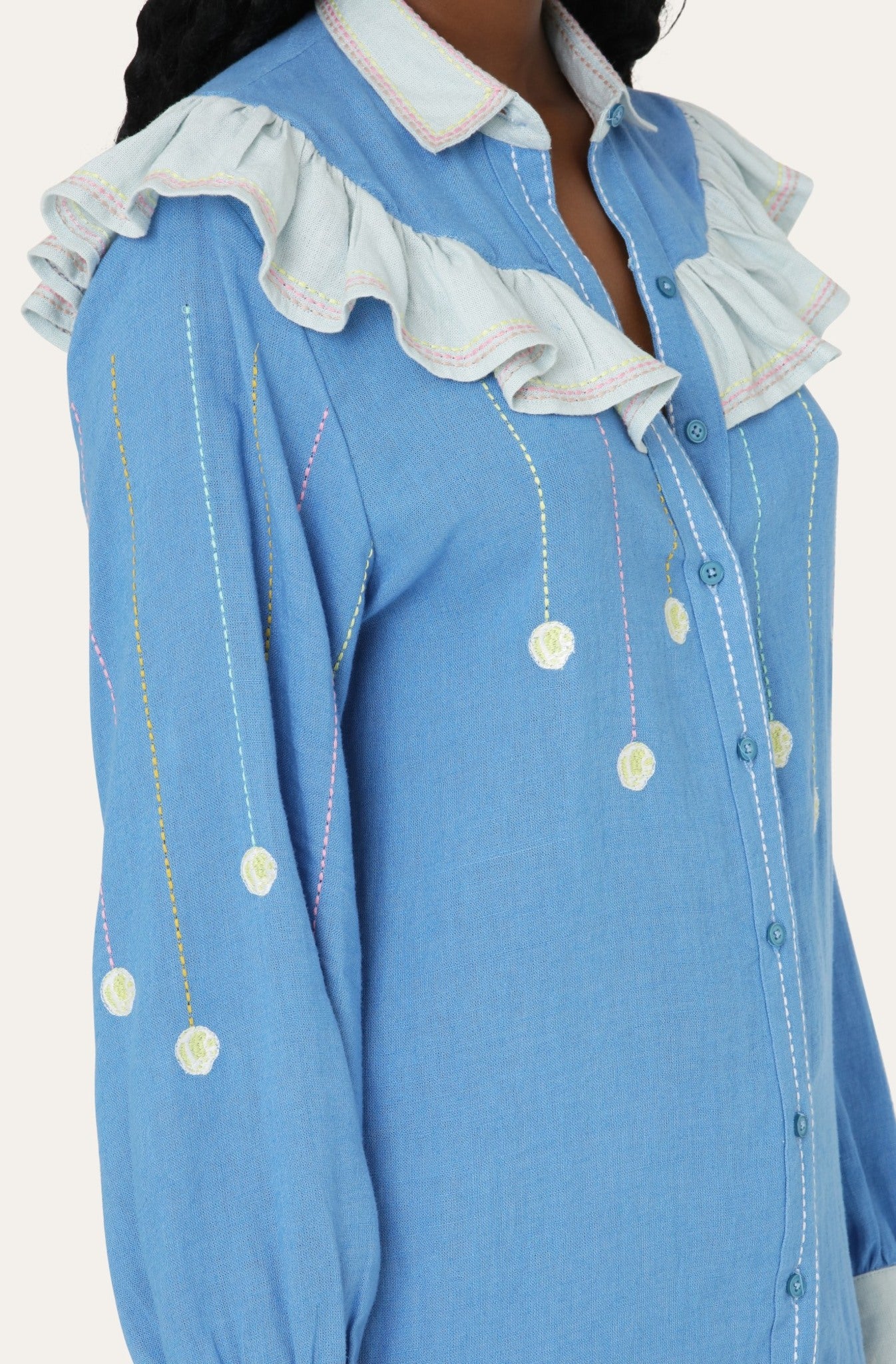 Delightfully twee, the Adi Shirt demonstrates the Danish brand’s effortlessly whimsical aesthetic. Crafted from cotton to a loose fit embellished with floaty ruffles and stitched embroidery through-out, its voluminous balloon-sleeves are complete with a scallop-edged cuffs for a dainty finish.