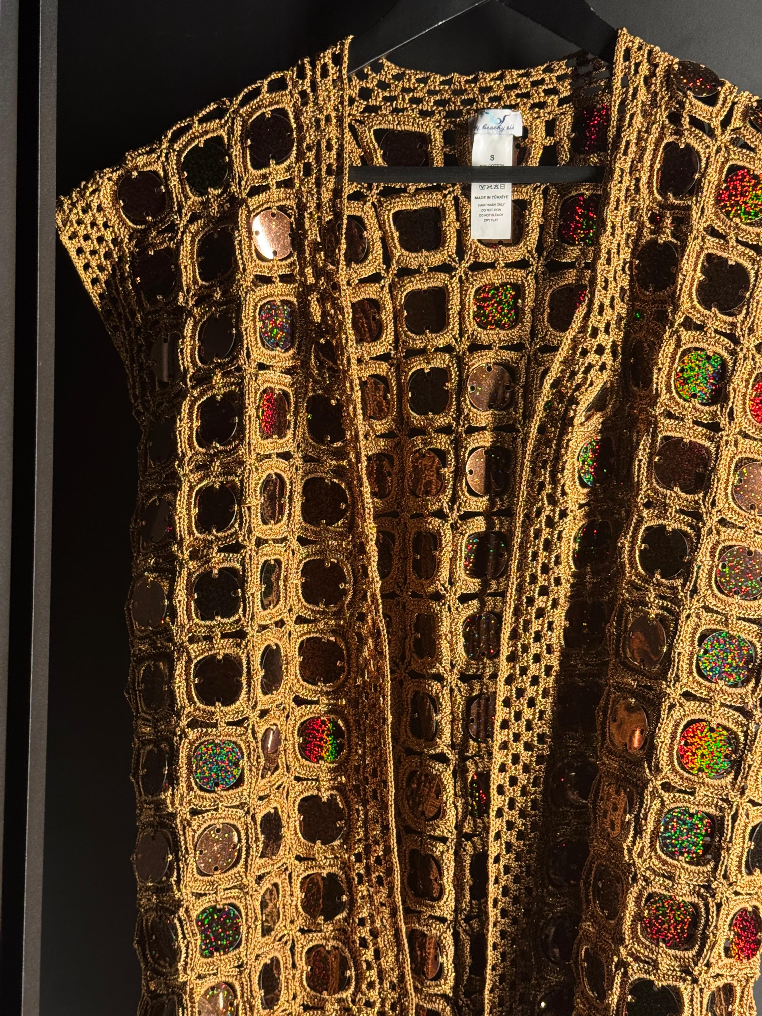 Introducing our hand crochet vest adorned with shimmering sequins. This vest is suitable for a cocktail, classy dinner party or any glamorous night out.