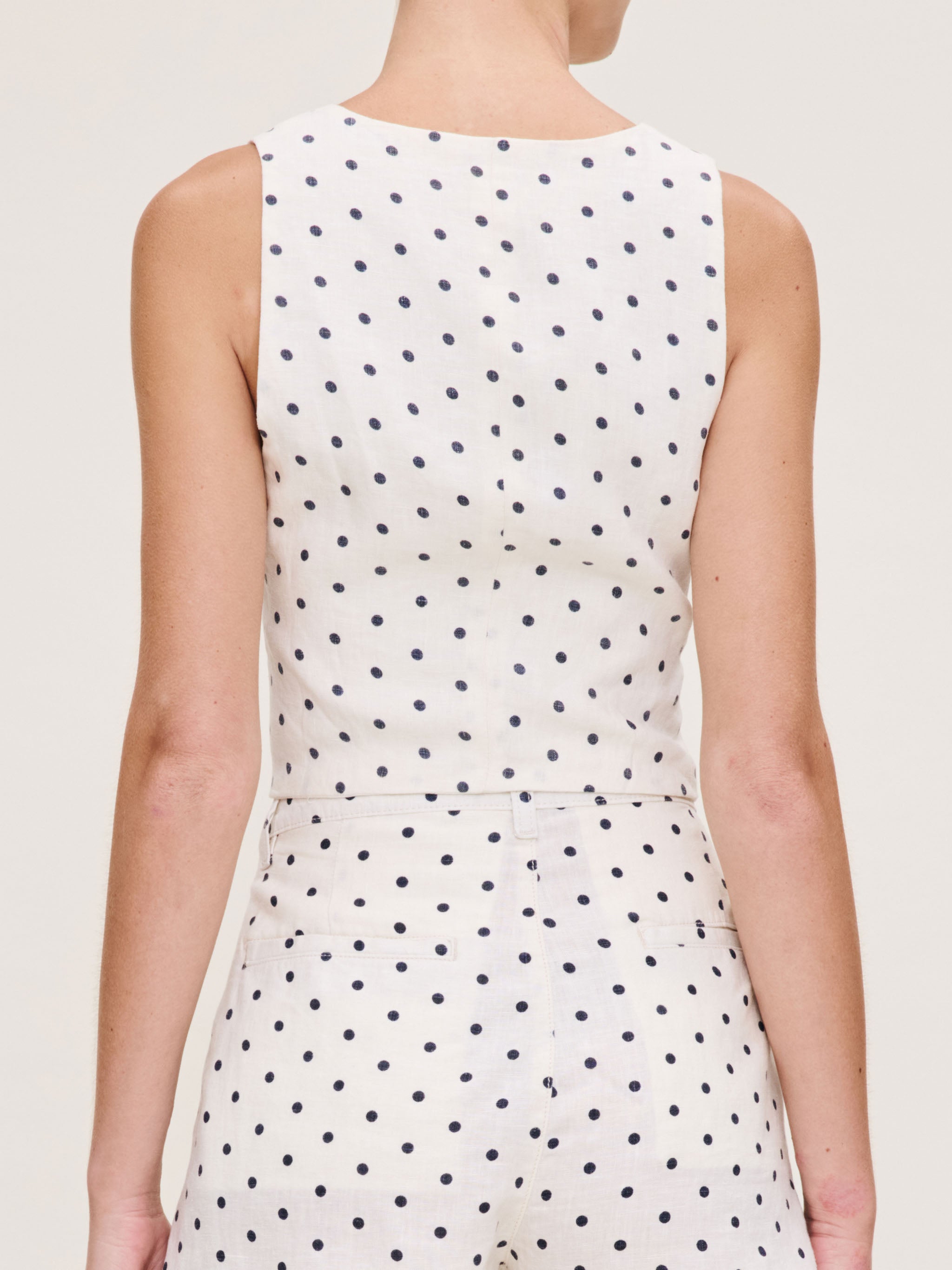 The Lizzie Polka Dot Top is a square neck cropped top, with button front closure and darts for a tailored look. It features white buttons, tonal stitching and clean finsihing. High quality with impeccable drape, our luxe linen pieces are made with 100% natural linen fibers and made to keep you comfortable in high temperatures. Wear it with our Hepburn Polka Dot Shorts for a look that's cute, coordinated, and ready for anything.
