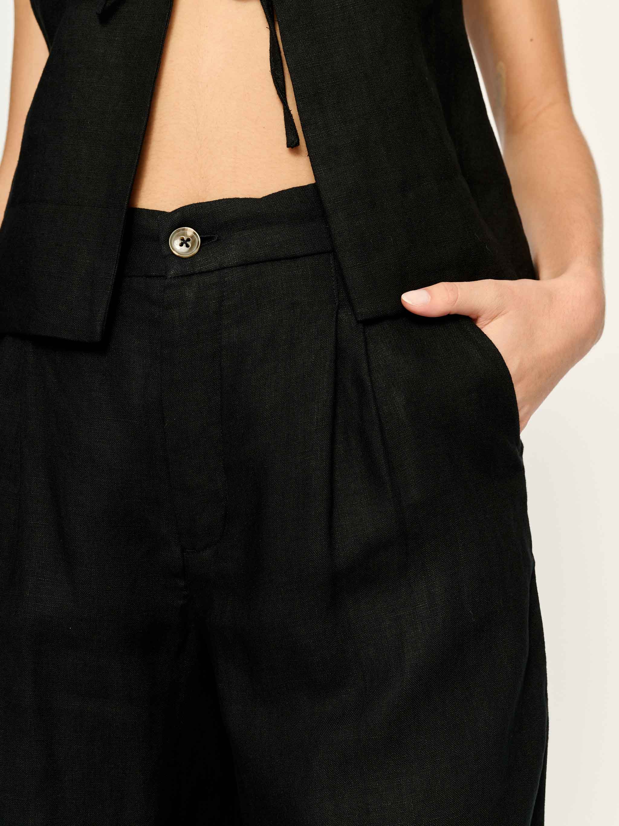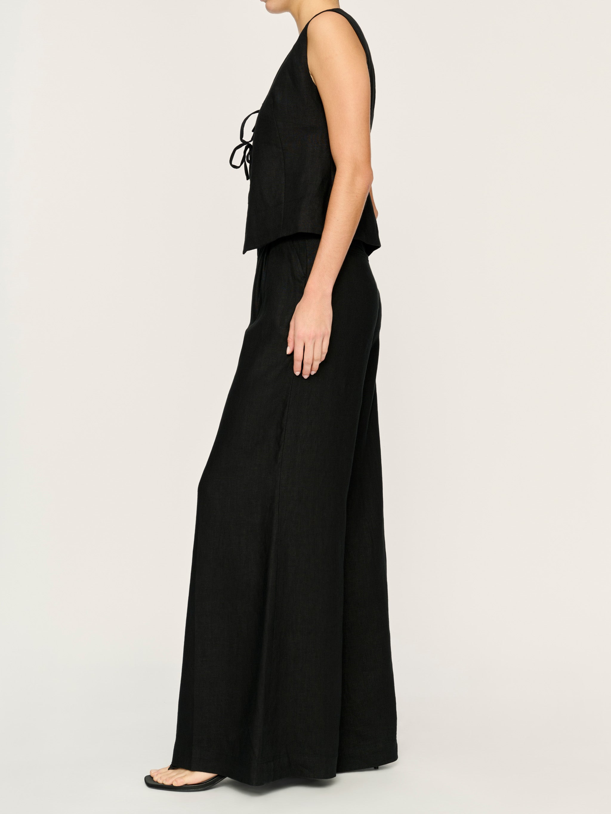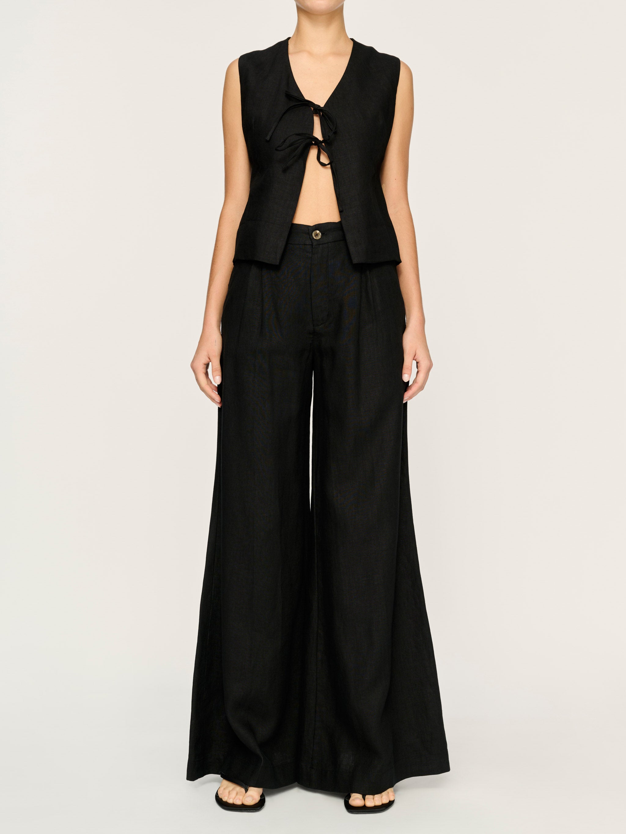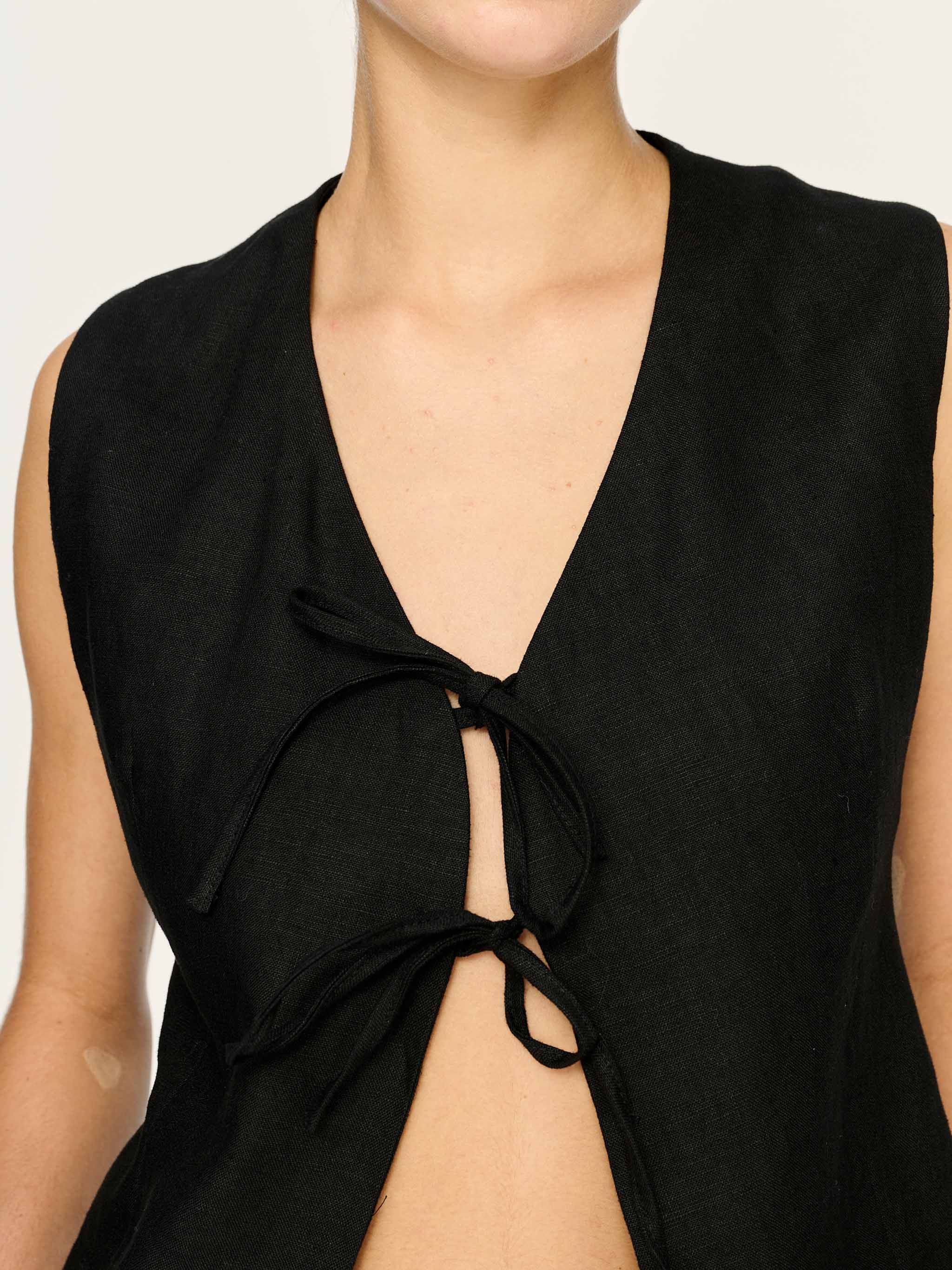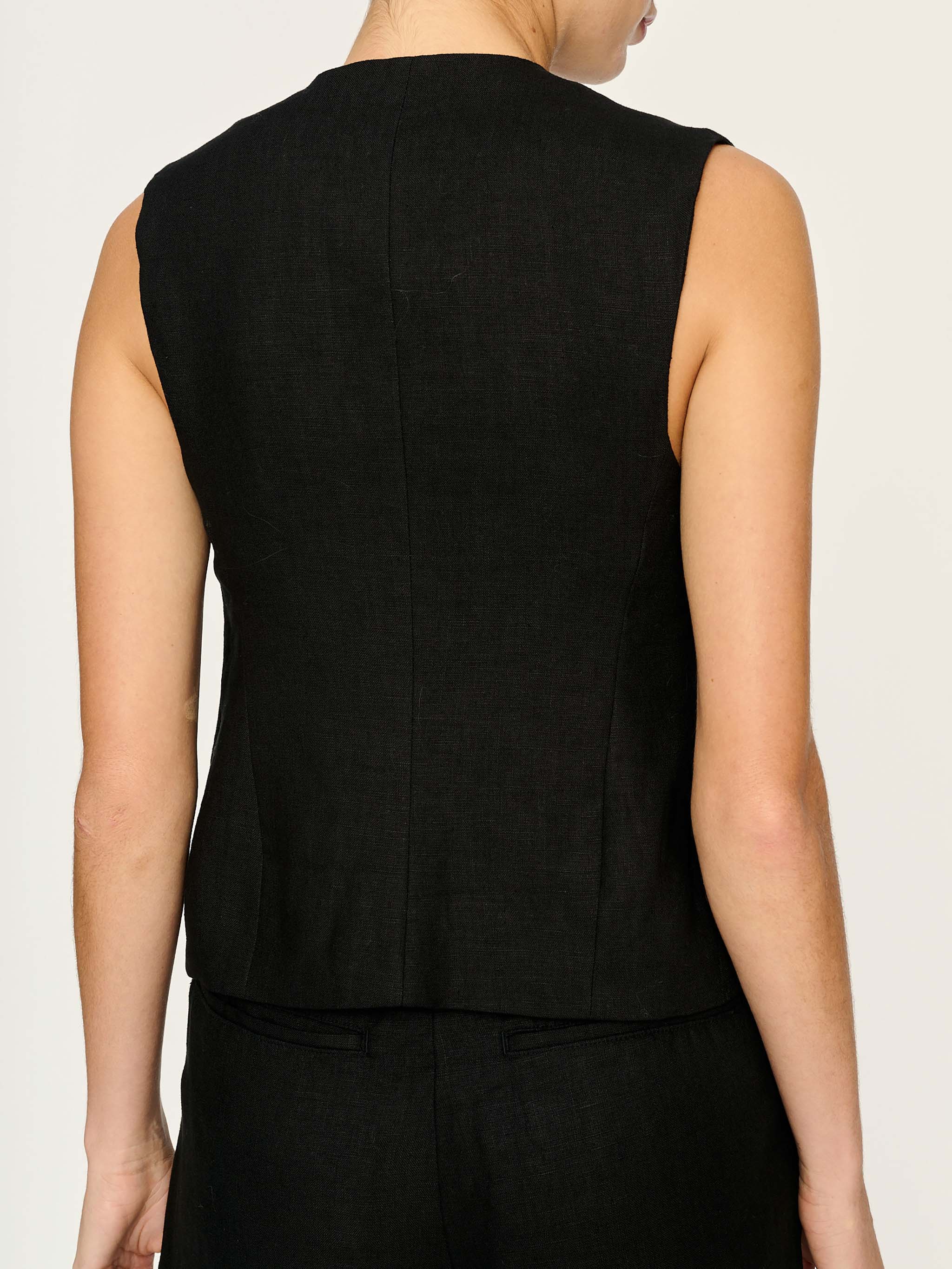 Effortlessly chic and endlessly versatile, the Zia Vest is crafted from a mid-weight, non-stretch linen weave that offers a breathable, natural feel. This sleeveless piece features a flattering V-neck and an open front placket with adjustable ties for a customizable fit. Fully lined in soft cotton for added comfort, it’s the perfect layering piece to elevate warm-weather looks or add dimension to your transitional wardrobe.