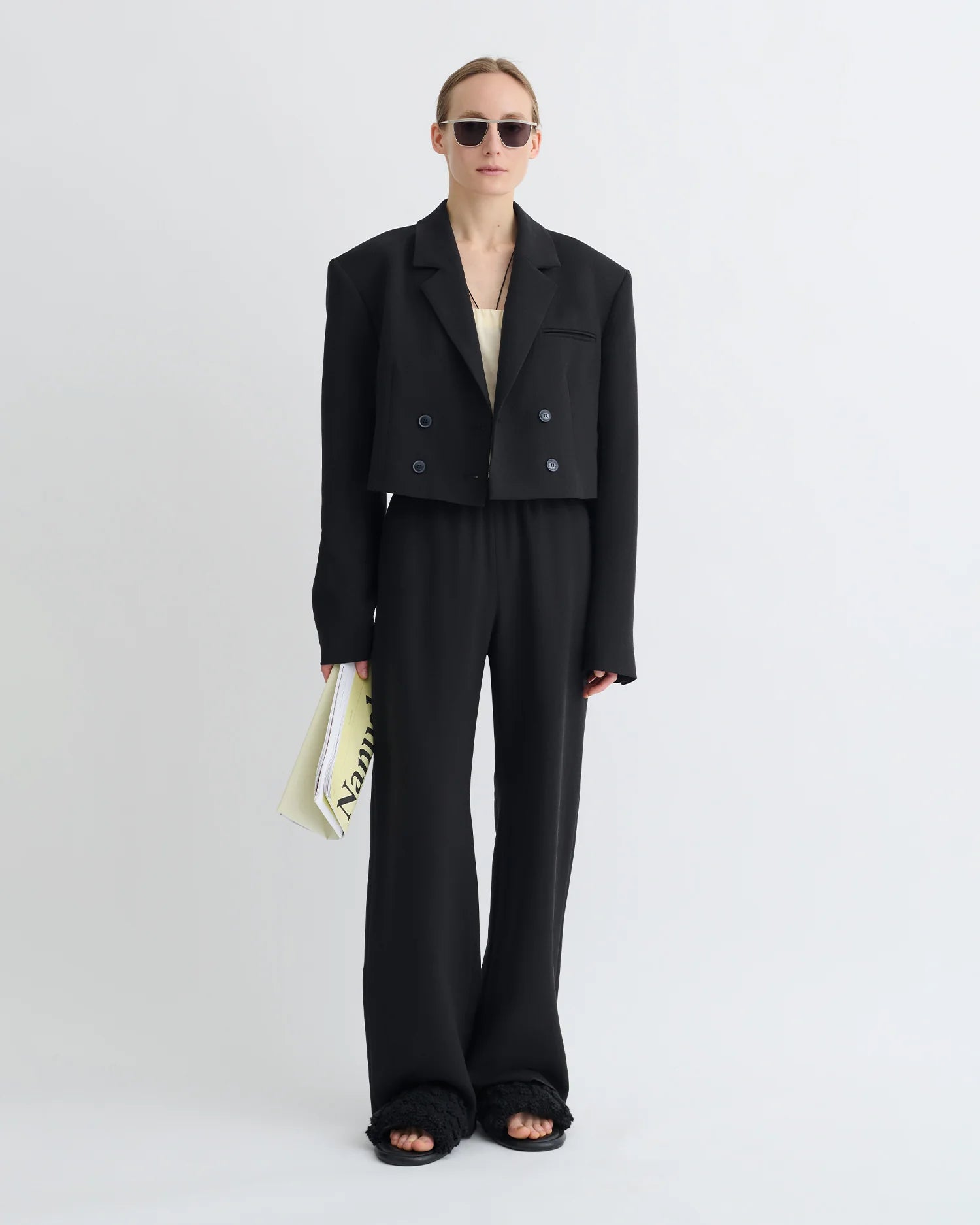 The Rony blazer, crafted from crepe twill, features a boxy double-breasted silhouette and a cropped length.