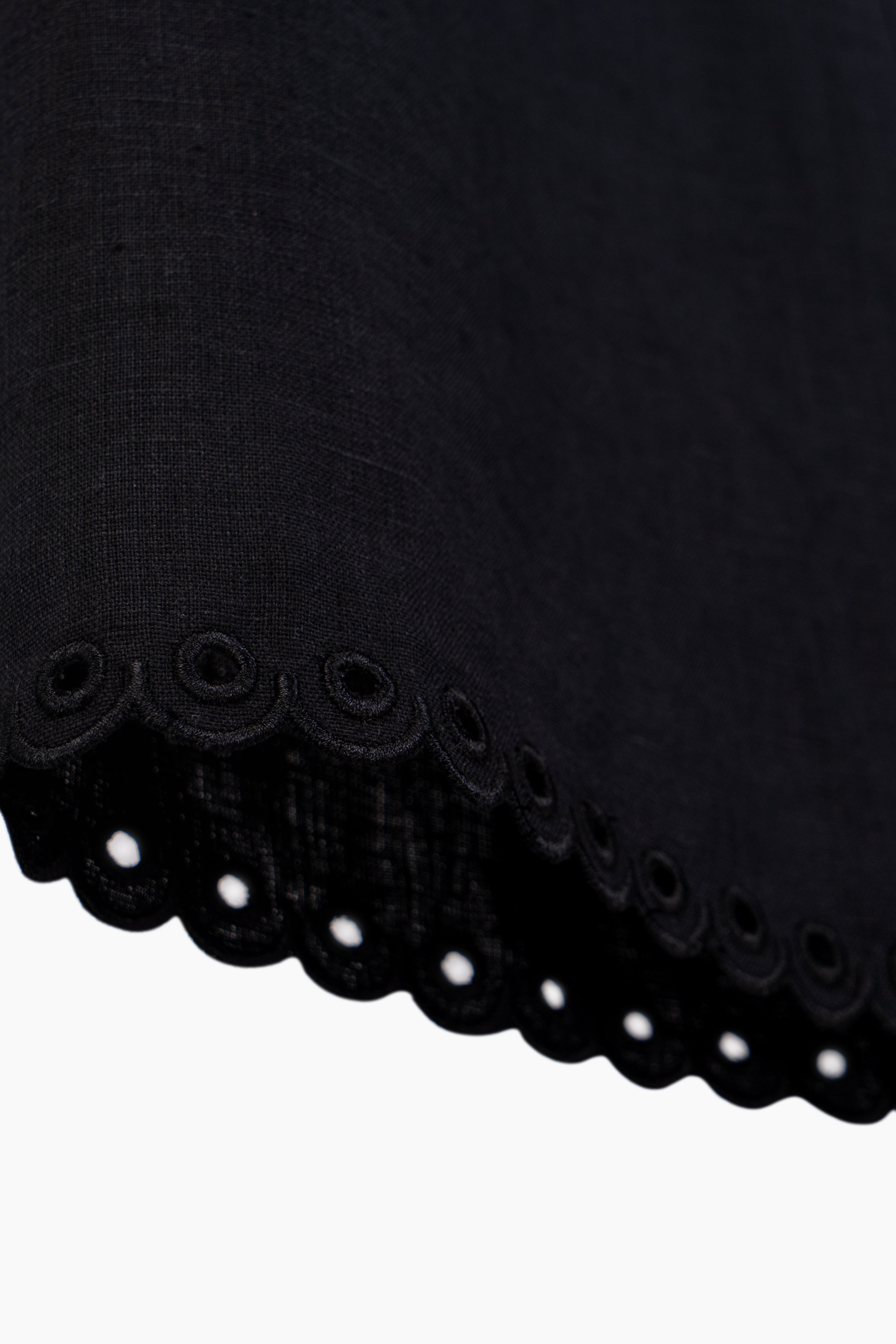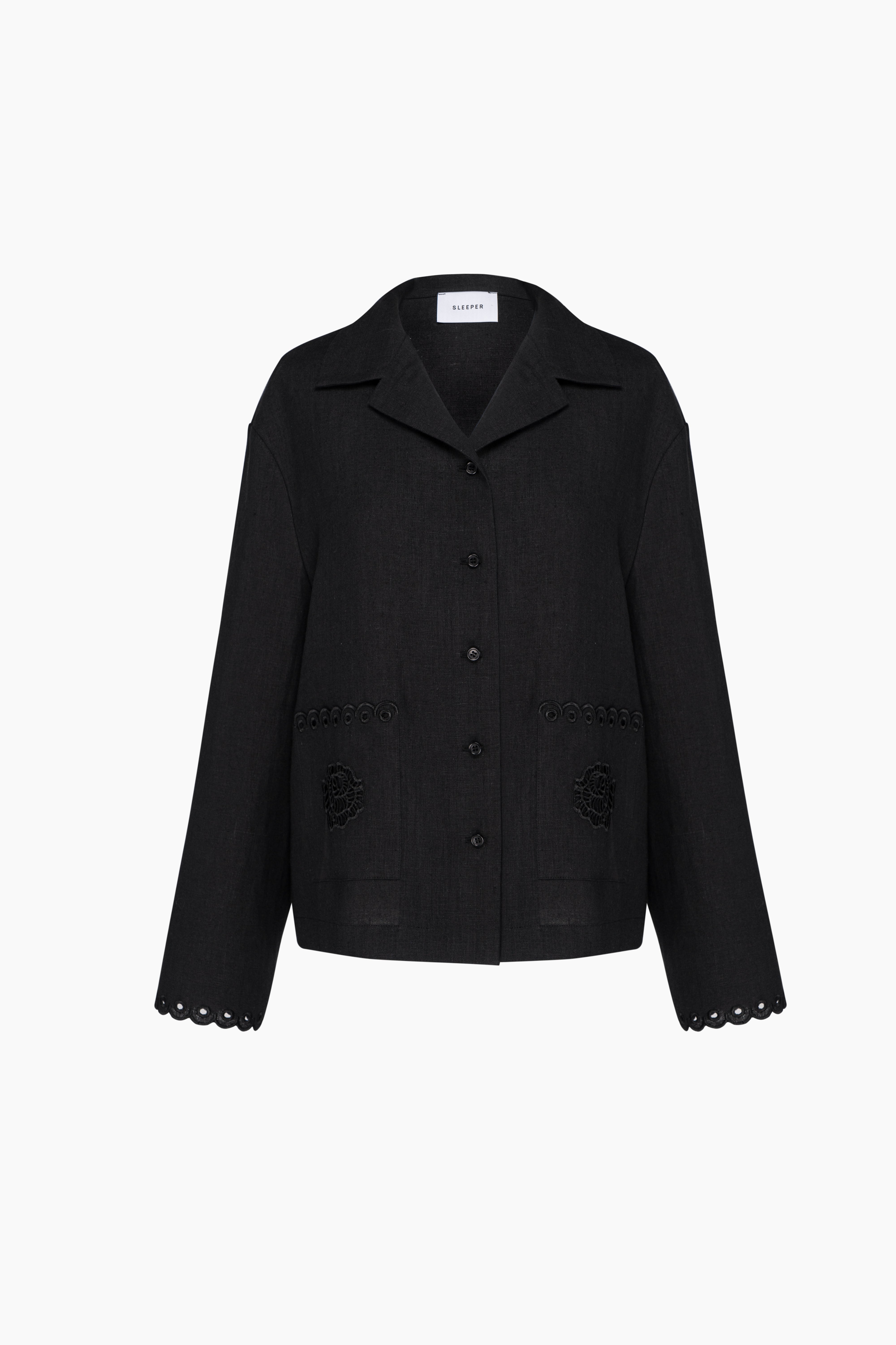 Relaxed shirt in linen embroidered with a gentle floral motif and scalloped edges. The front closure features classic buttoning with a camp-style collar, straight hip-length hem and patch pockets.