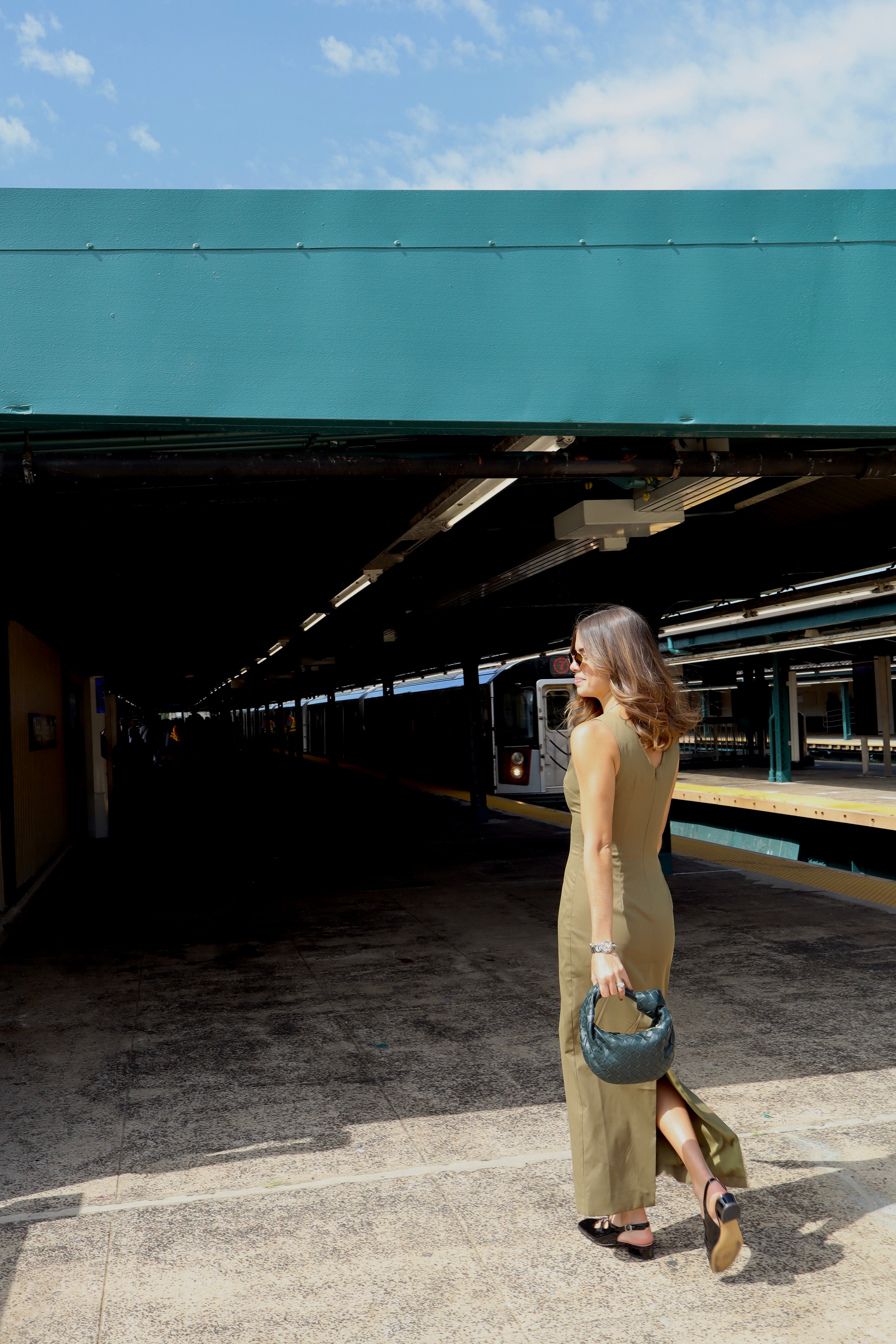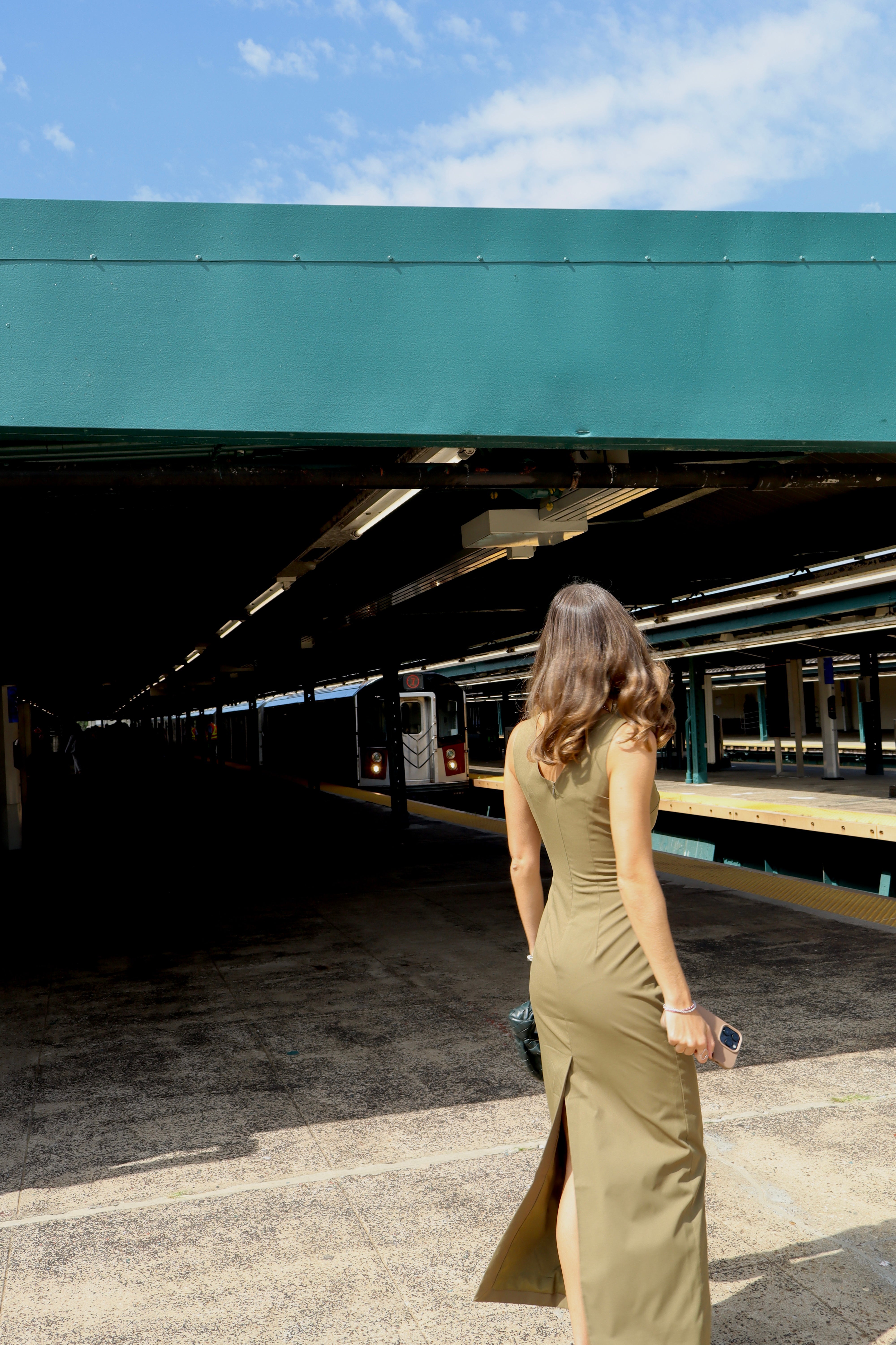 In a rich military green hue, this dress features a fitted bodice that defines the waist, flowing into a soft A-line shape. Crisp tailoring enhances its structured elegance.