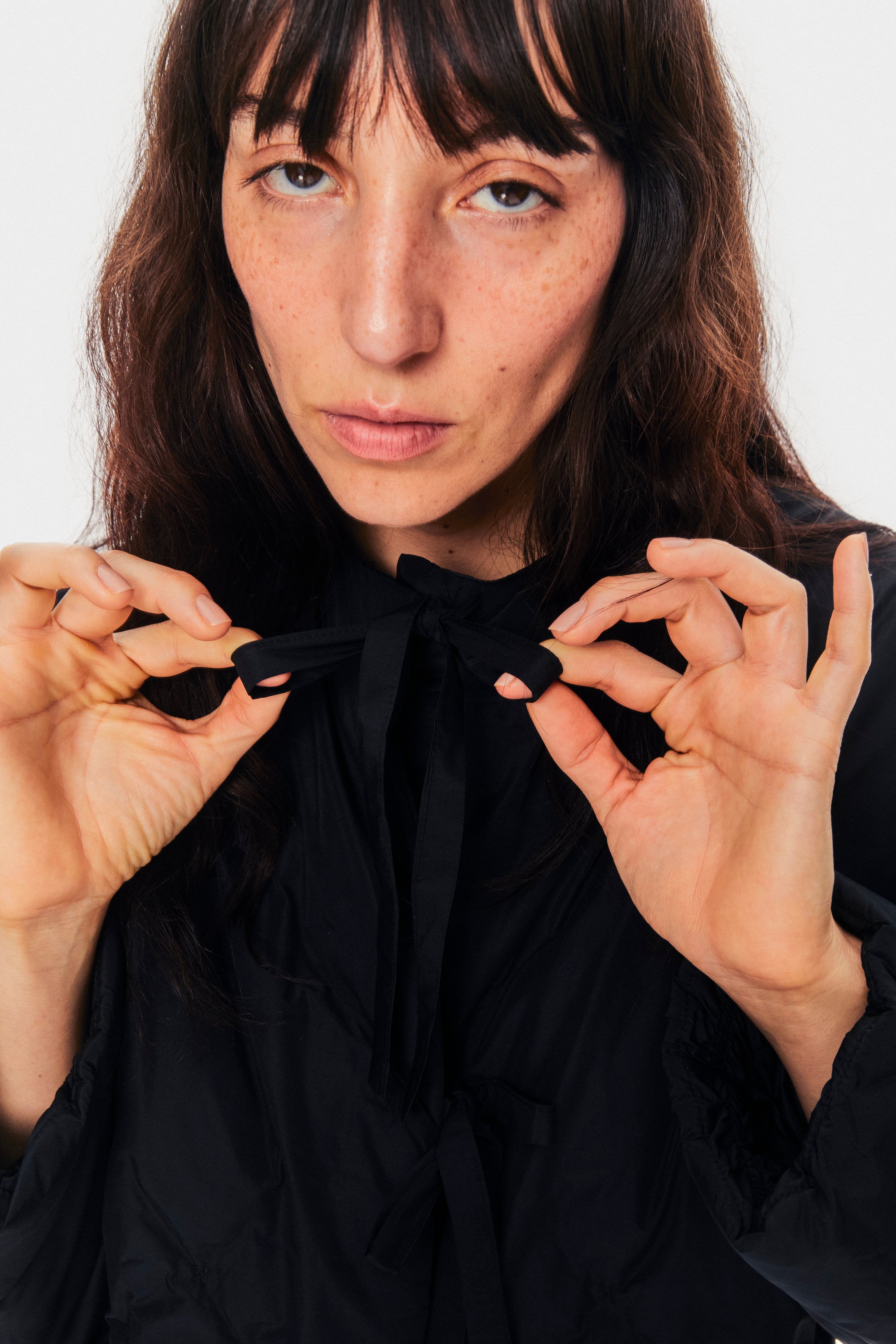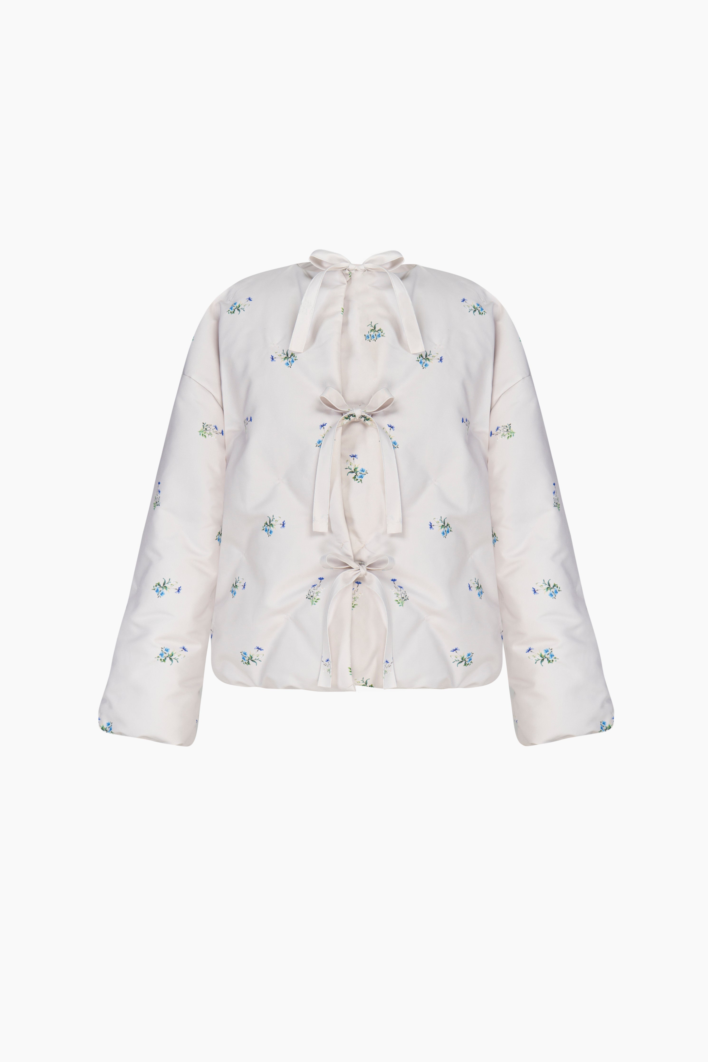 The Sleeper Ukiyo Puffer Jacket is a cropped, insulated jacket made from white recycled polyester. It has a round neck, welt pockets at the sides, and a charming self-tie bow closure at the front. The jacket provides warmth with its quilted padding and is designed to be a versatile, eco-friendly addition for layering at home or outdoors.